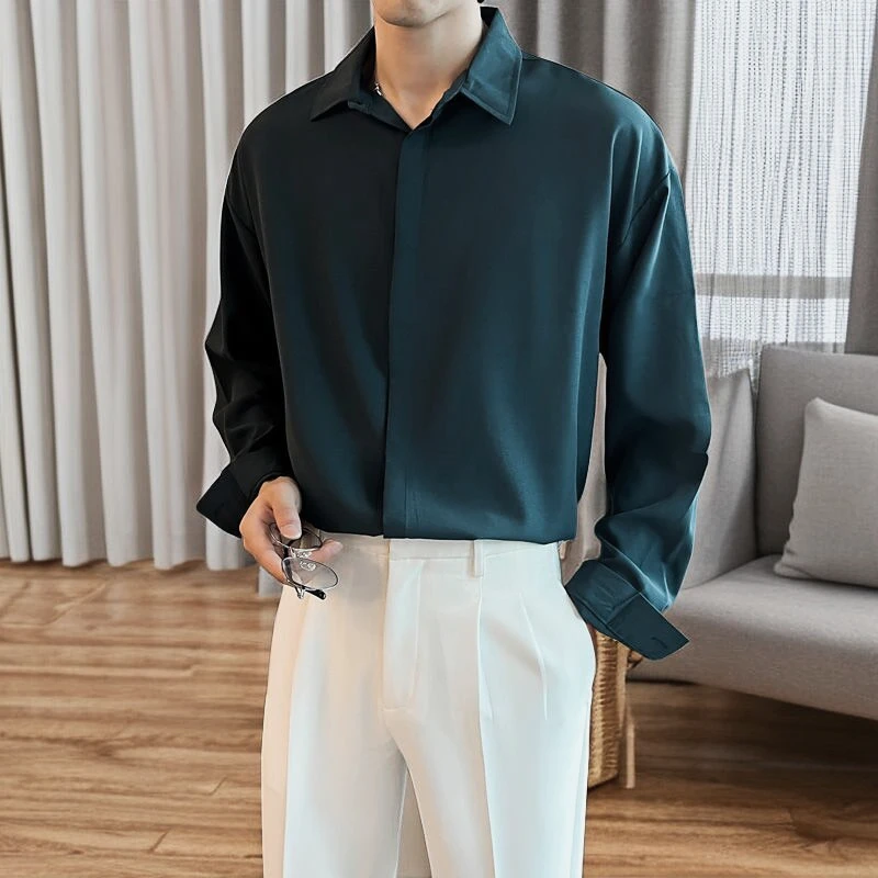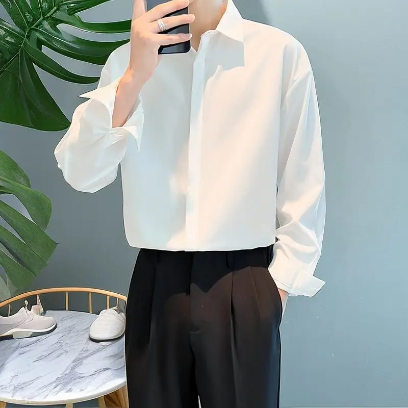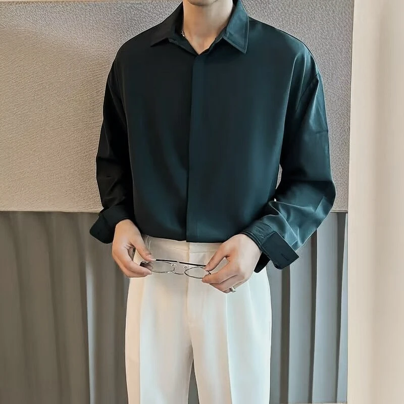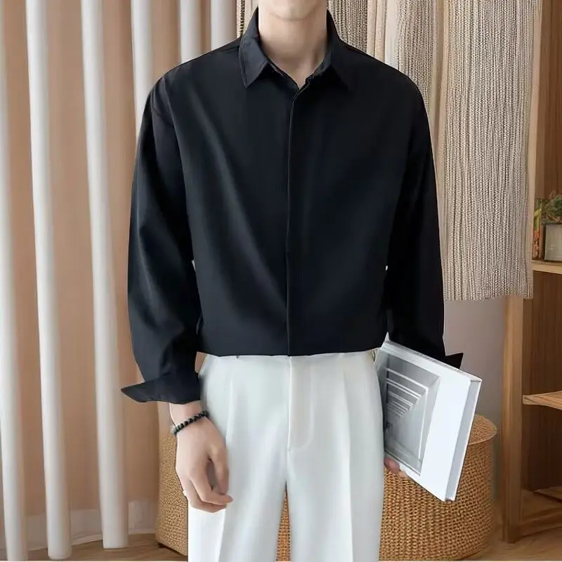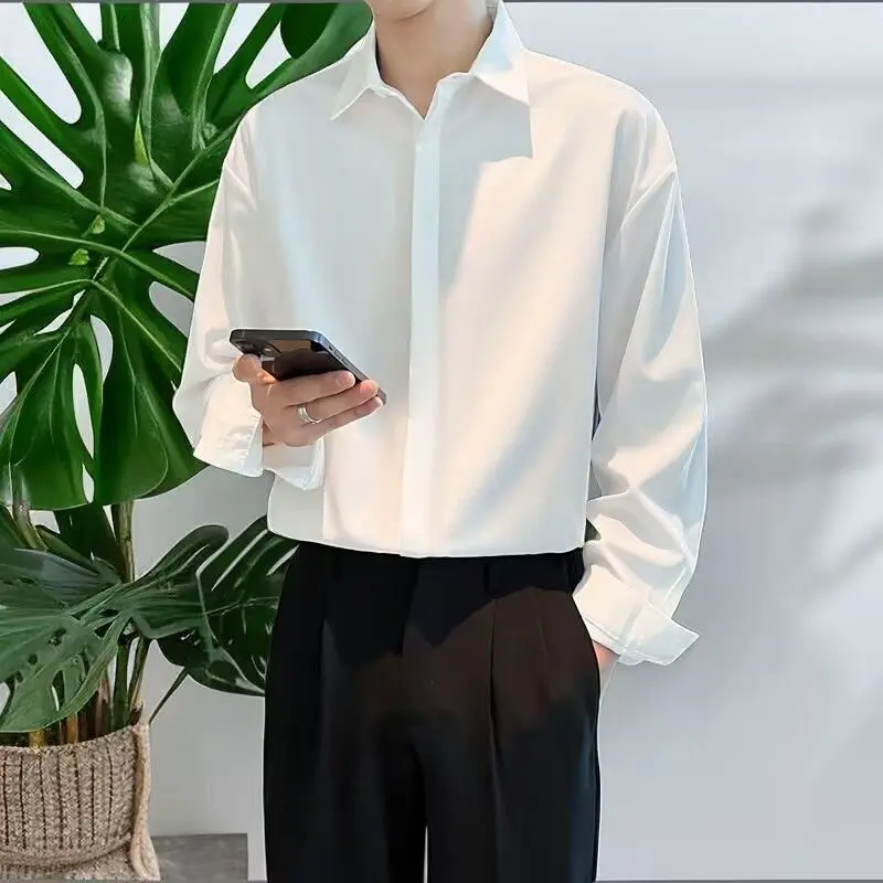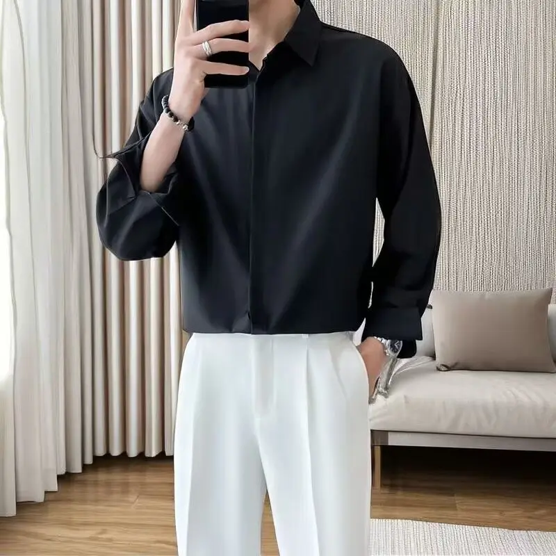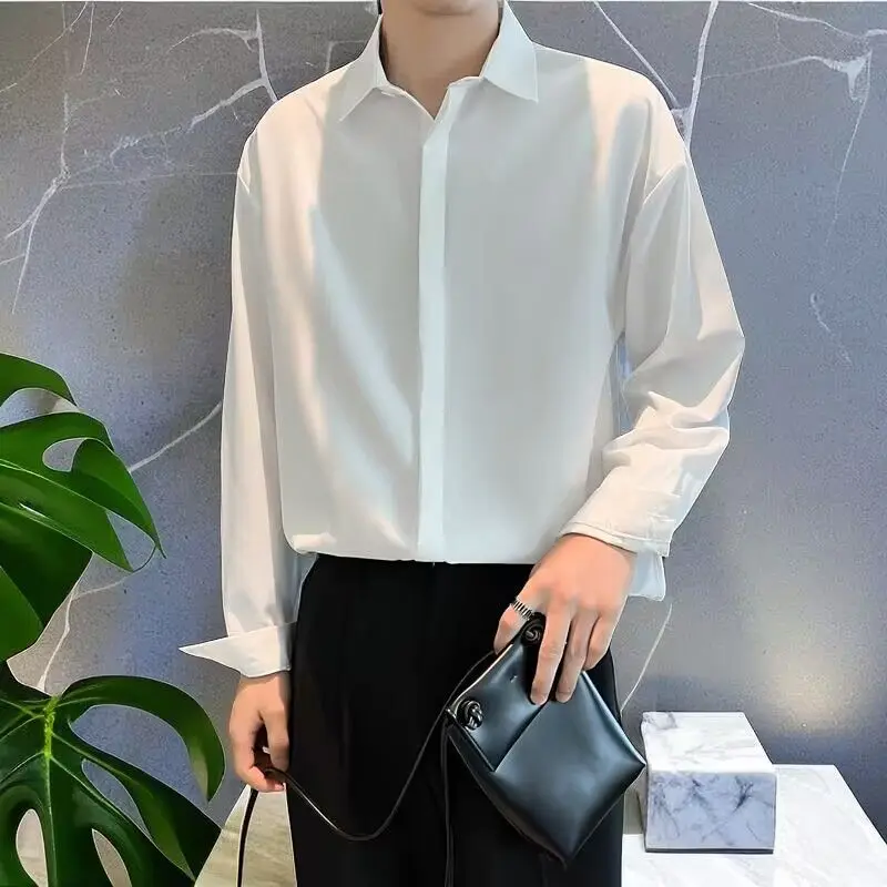 High-end All-match Thin Ice Silk Shirts for Men Long Sleeve Hidden Buttons Loose Business Casual Luxury Drape White Shirt
