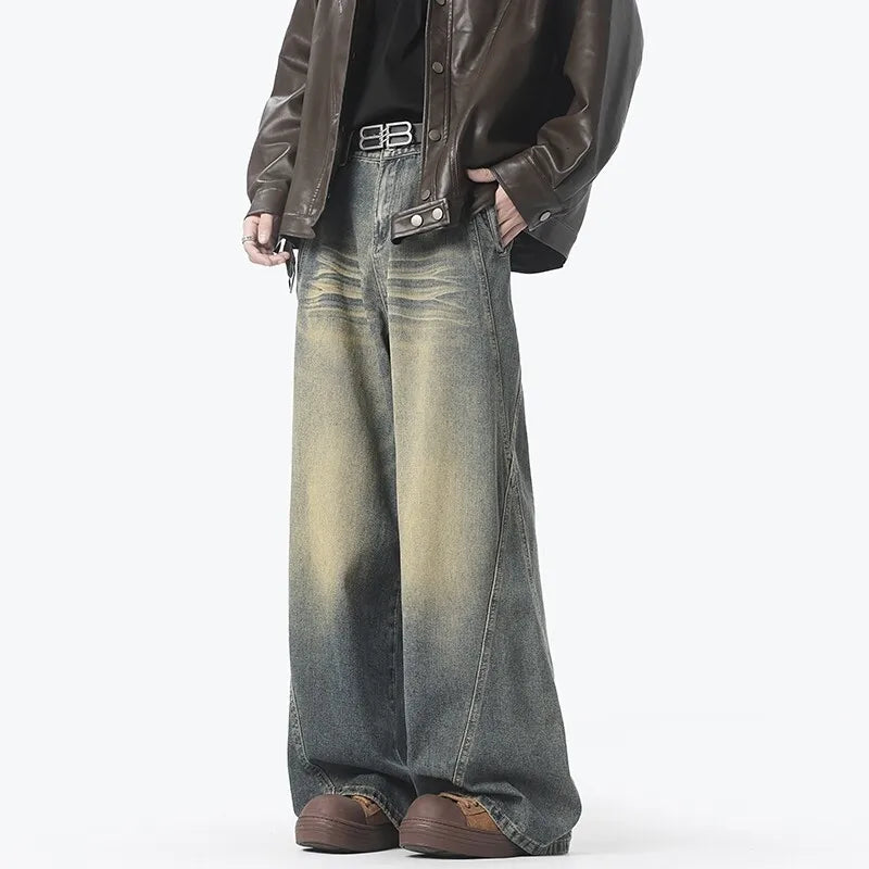 American Style Vintage Straight Jeans Men Retro Fashion Mopping Pants Unisex High Street Loose Casual Wide Leg Denim Pants