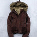 American Vintage Y2K Fur Lined Bomber Jacket Womens Brown Hooded Coat with Faux Fur Trim and Ribbed Cuffs Fashionable and Casual