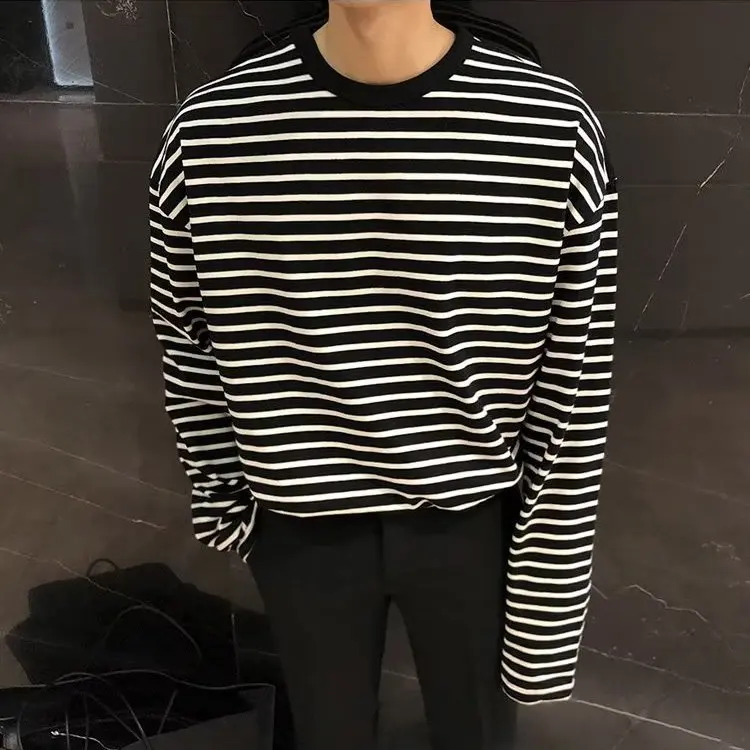 Autumn Korean Fashion Retro Heavy Striped Long Sleeve T-shirt Men Round Neck Harajuku Loose Casual Inner Wear Oversized T Shirt
