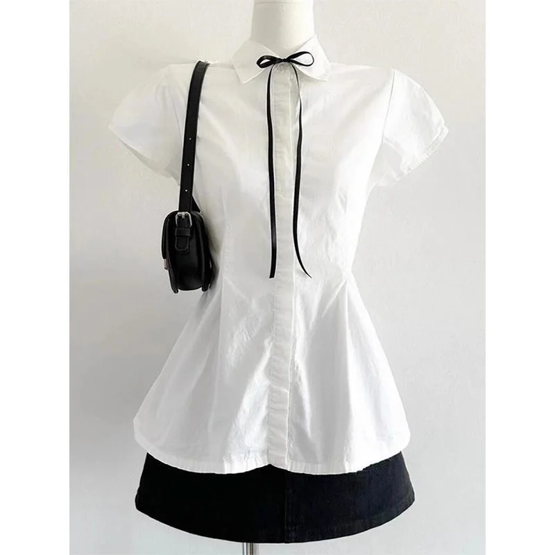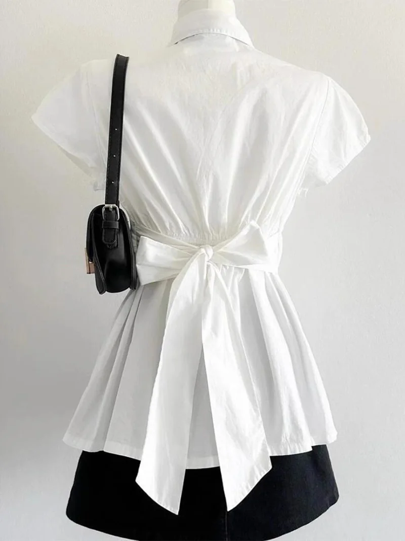 Back Bow White Shirt Women Slim Lace Up Elegant Blouse Vintage Casual Preppy Style Simple Short Sleeve All Match Tops New