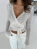 Bandage Hollow Out V-Neck T-shirt Top Women's Bandage Long Sleeve See-Through Sexy Casual Pullover Female Printed Tee Top