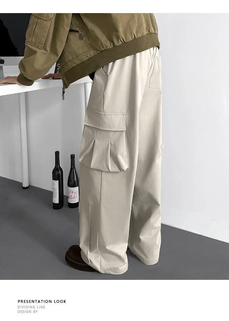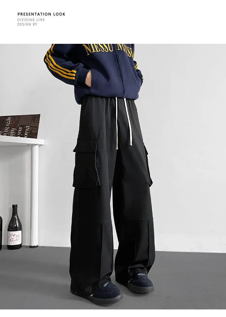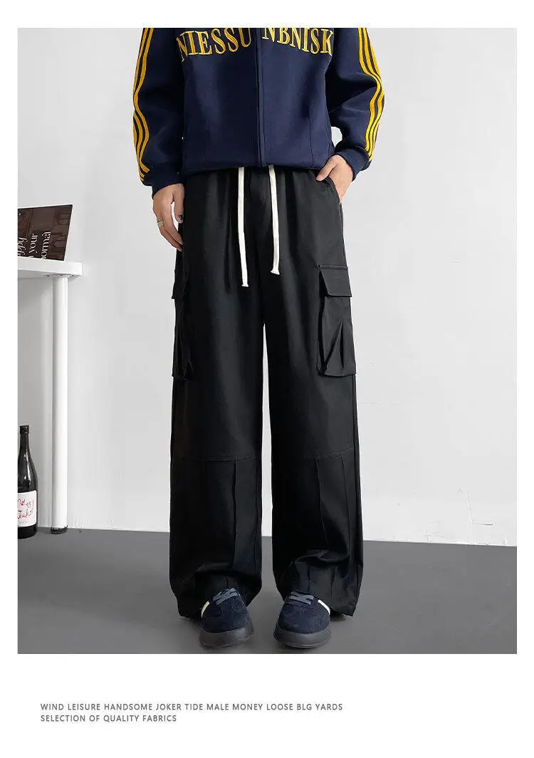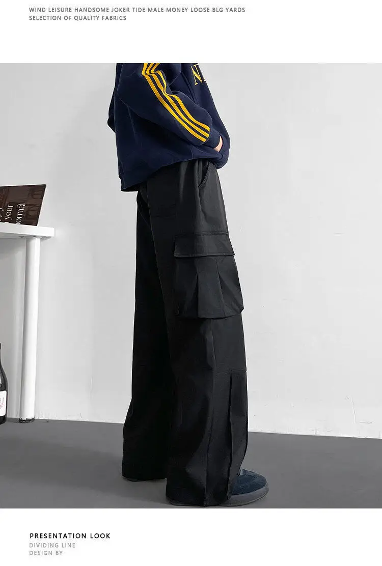 Black Casual Pants Men Retro Pocket Cargo Pants Men Japanese Streetwear Hip-hop Loose Wide Leg Pants Mens Vintage Trousers