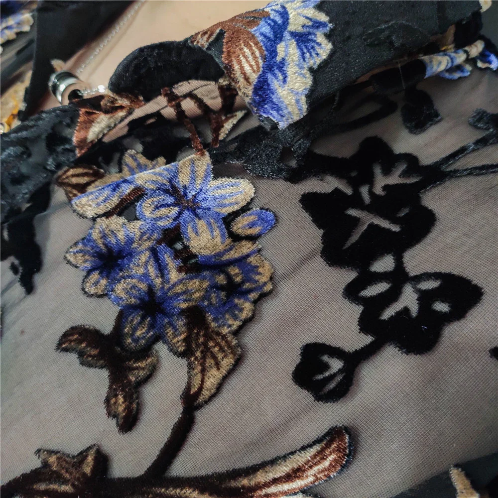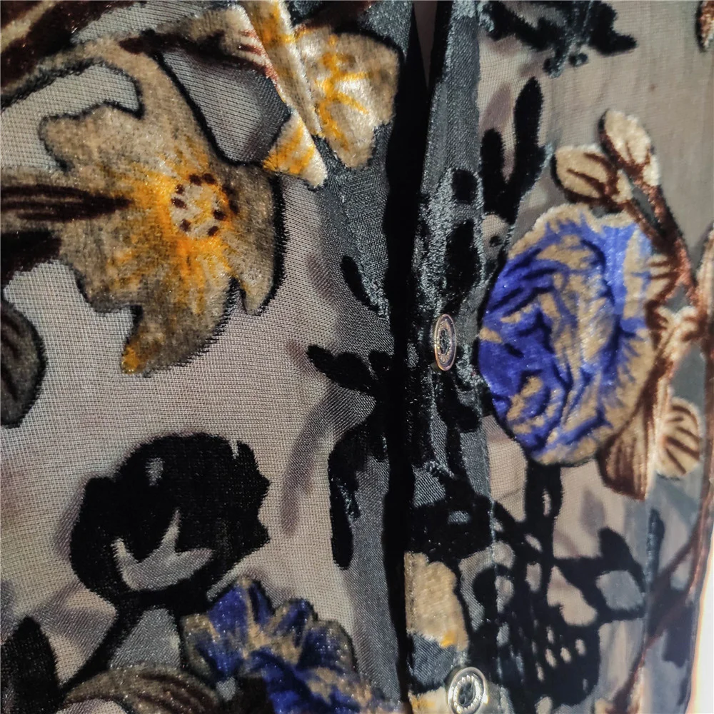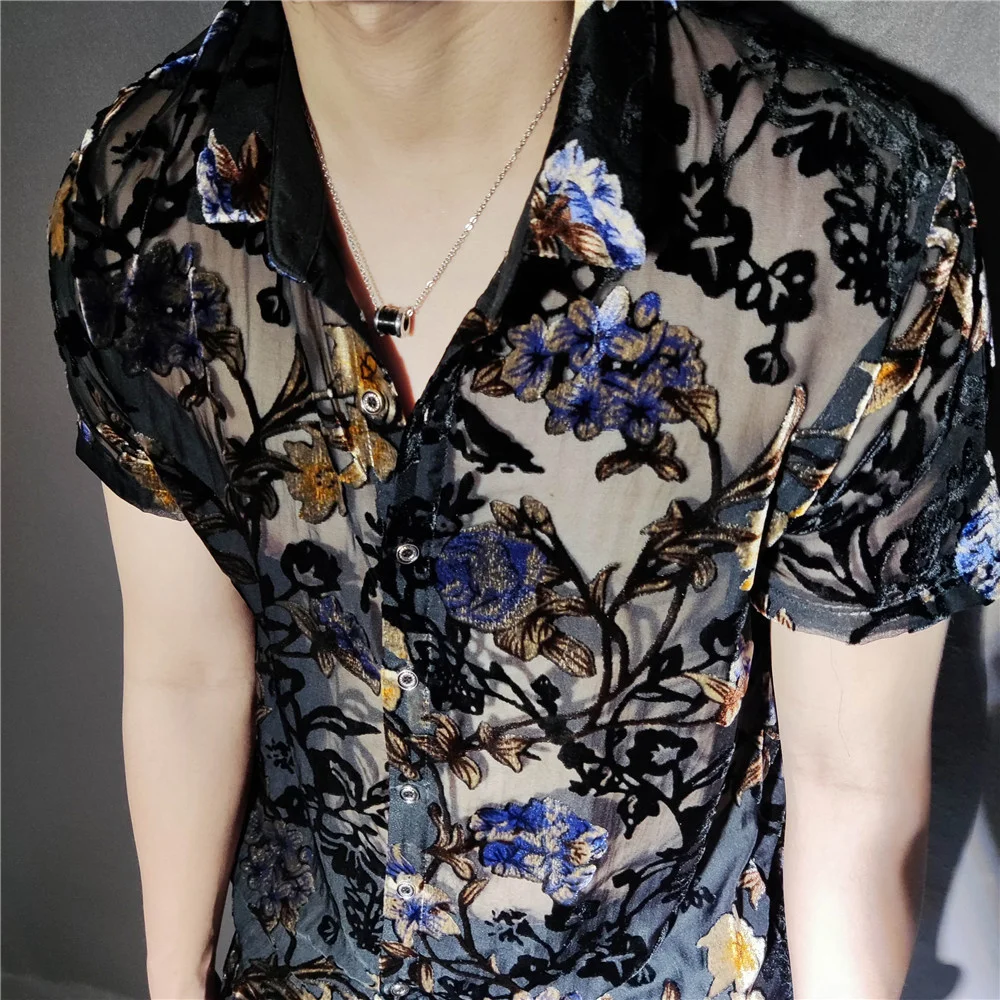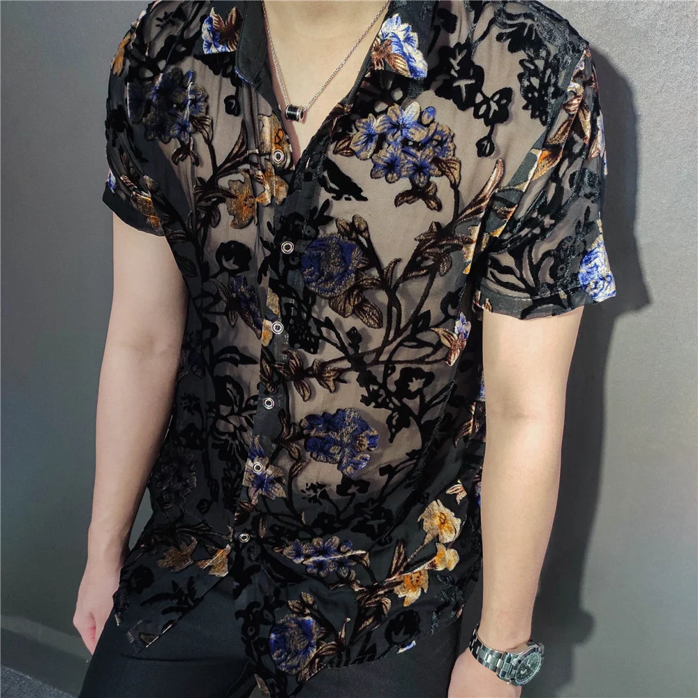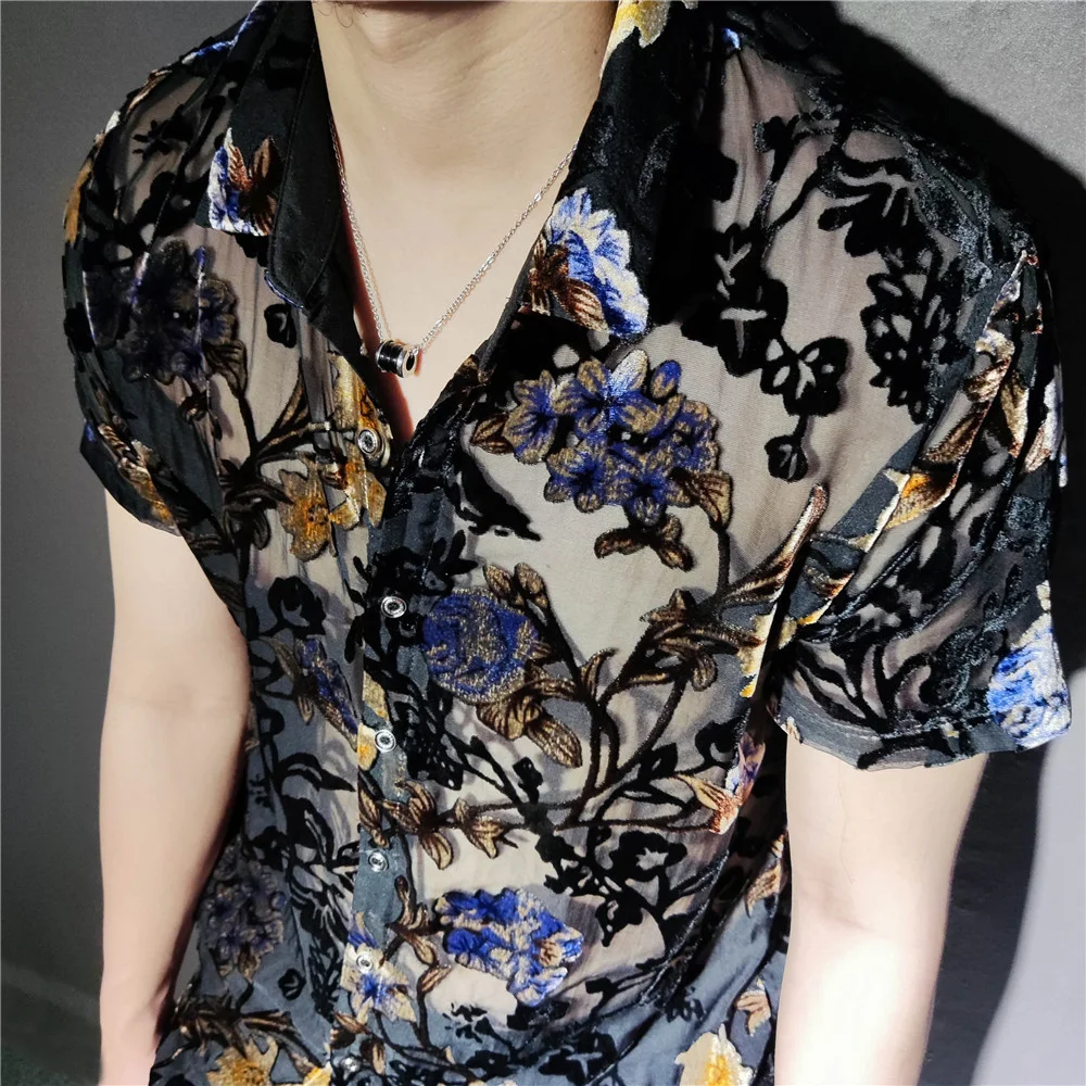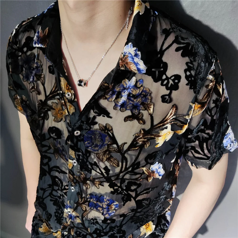 Colorful Flowers Pattern Velvet Shirt Men Transparent Short Sleeve Sexy Shirt Social Club Outfits Party Men Designer Shirt voguable