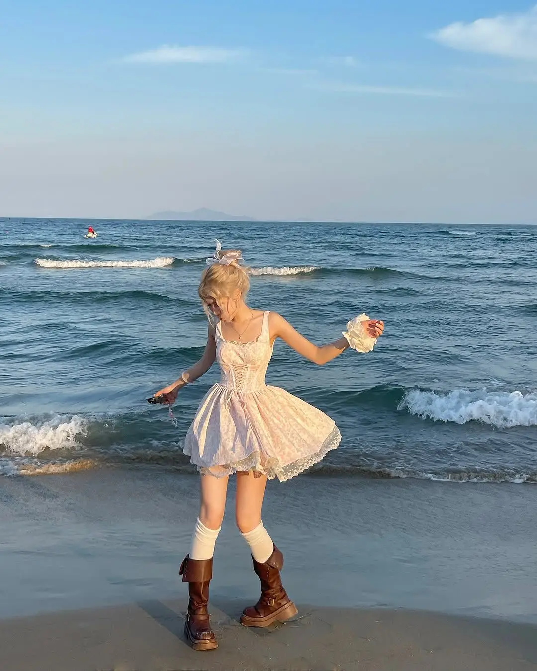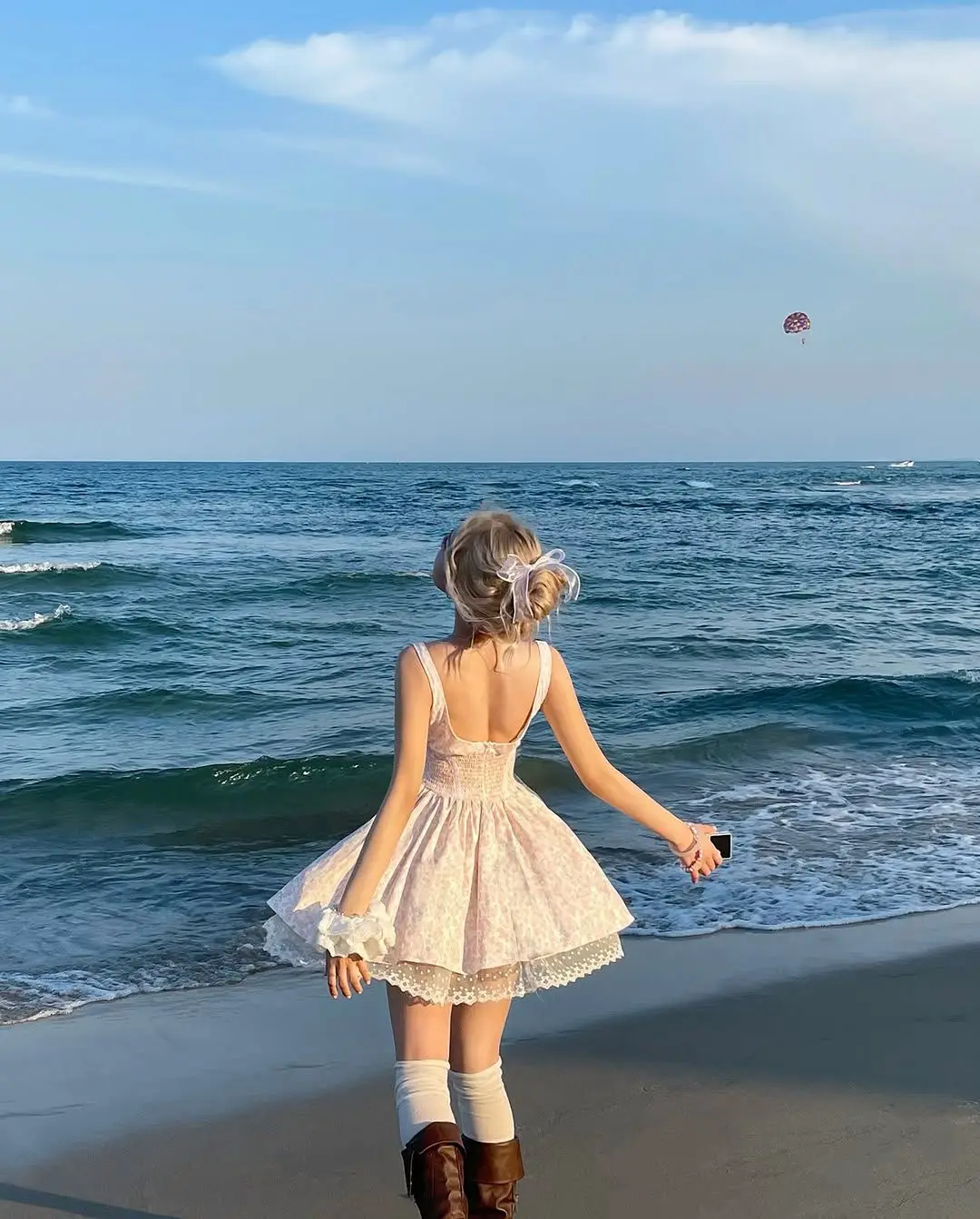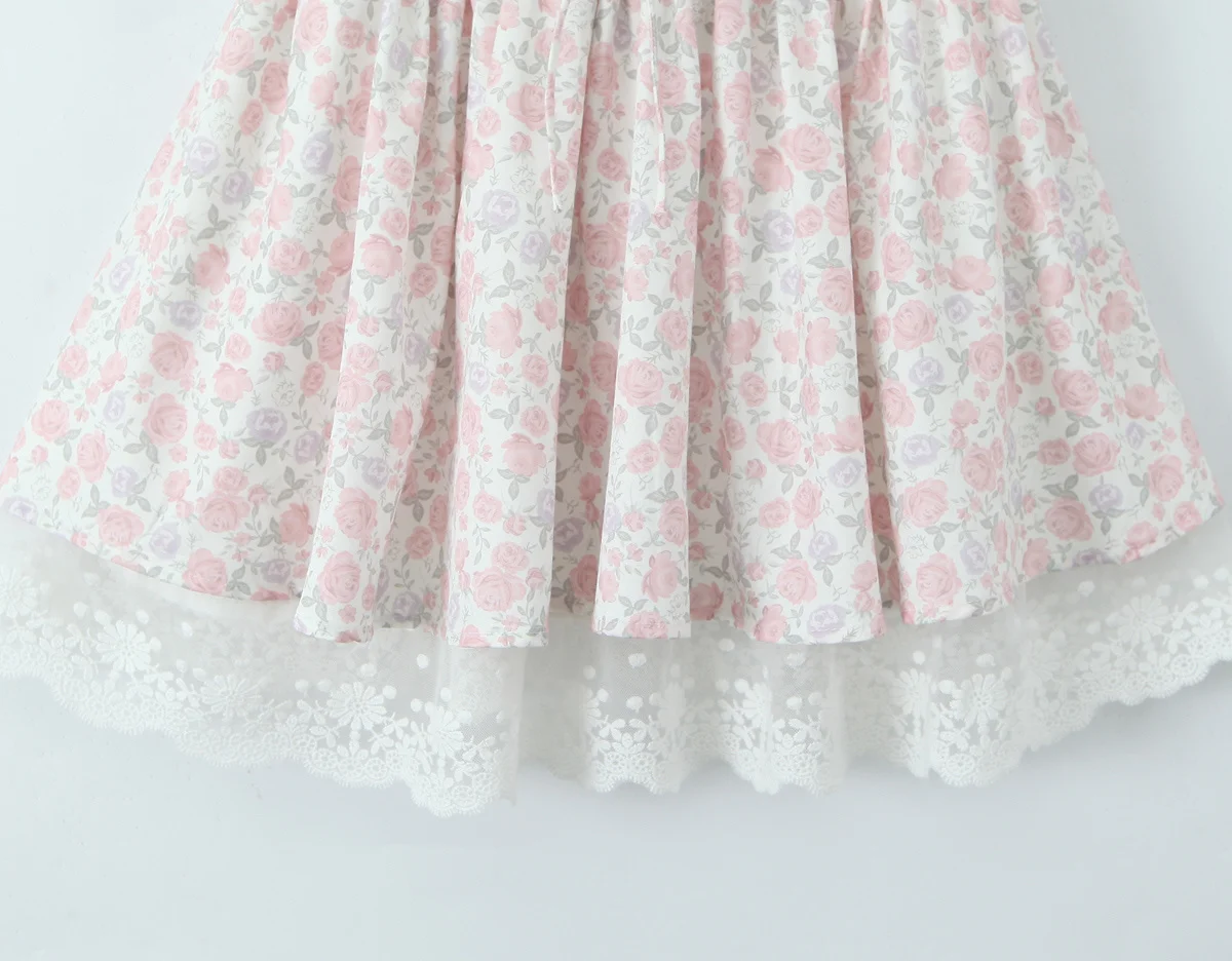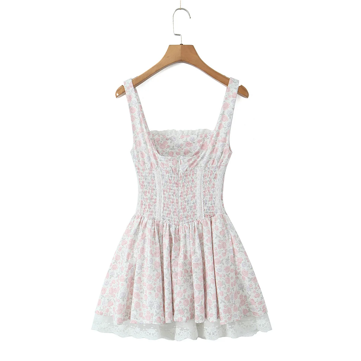 Elegant Women Floral Print Princess Sling Mini Dress Front Bandage Lace Patchwork A-line Summer Dress Holiday Party Robe