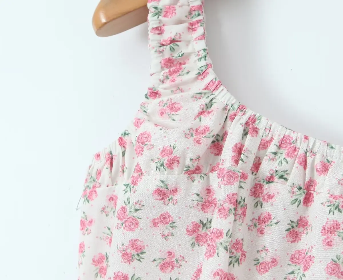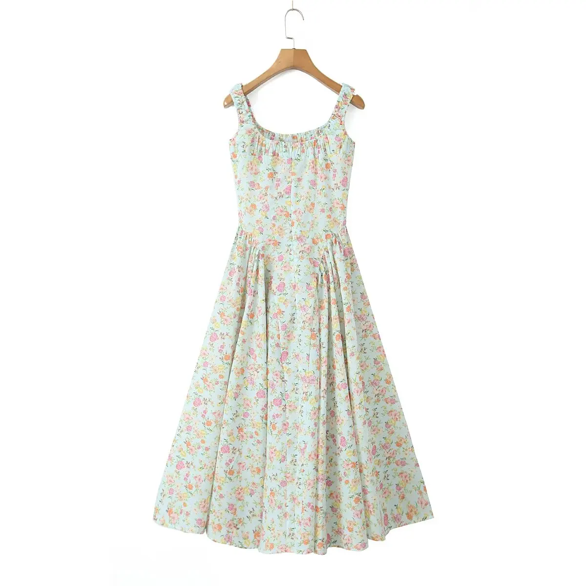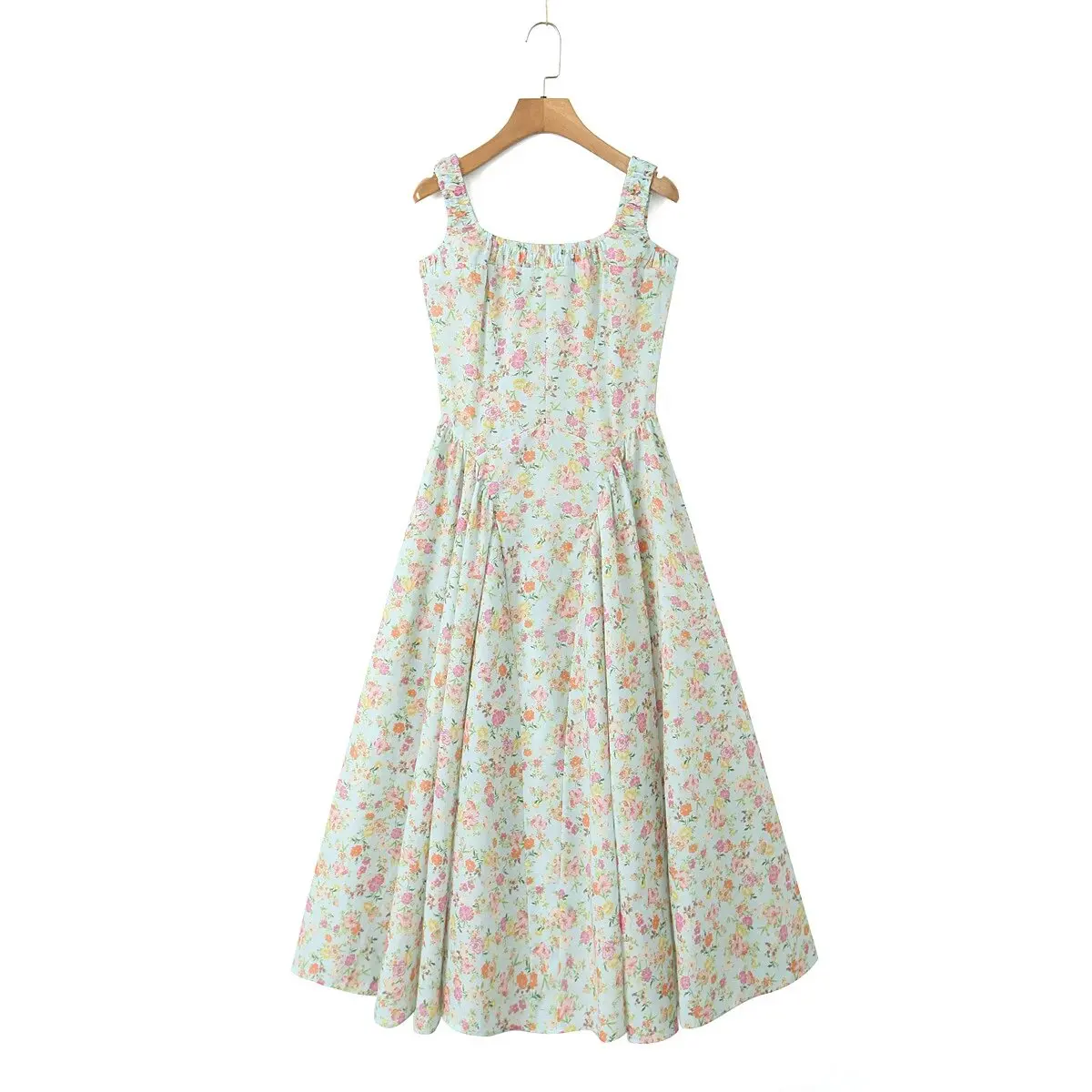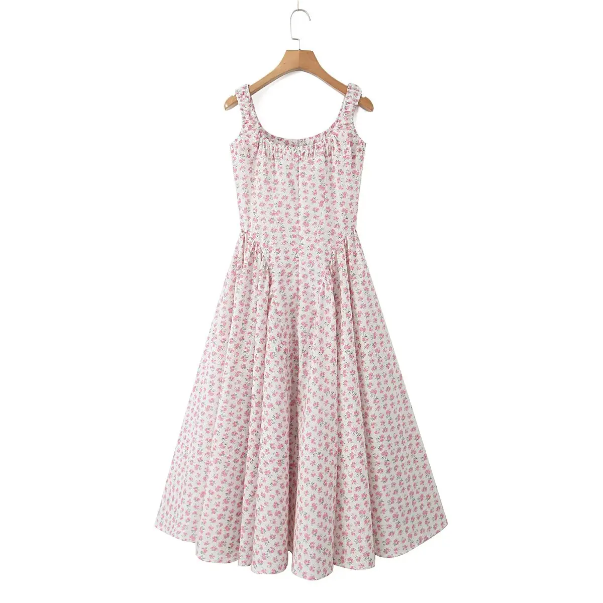 Elegant Women Floral Print Sling Midi Summer Dress Sexy Low Waist O Neck Female Holiday Party Robe