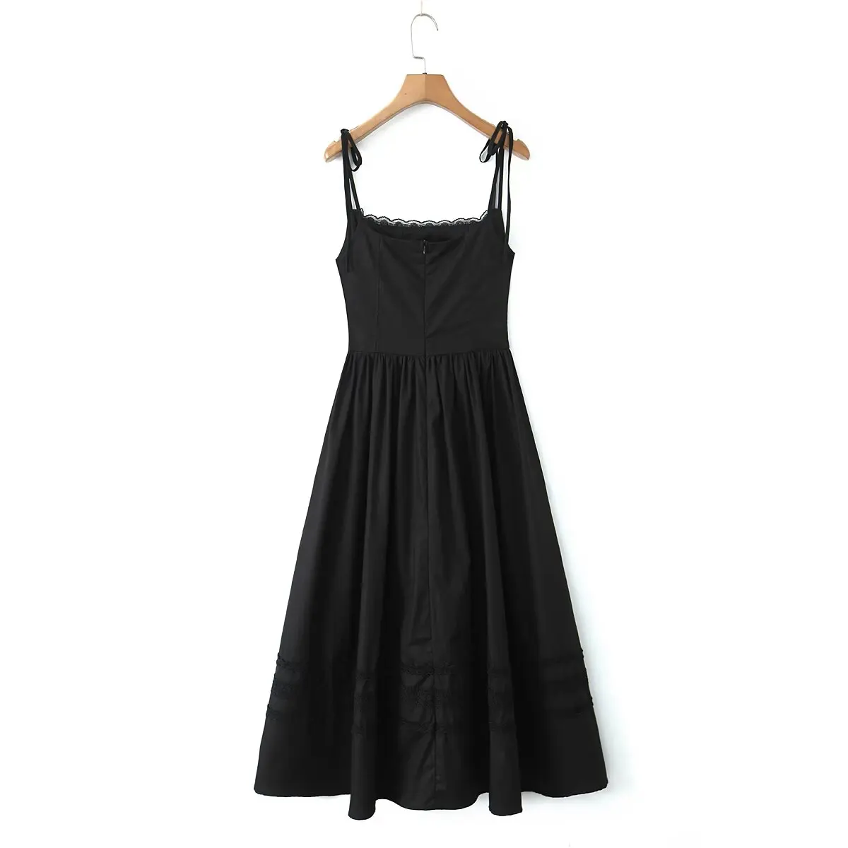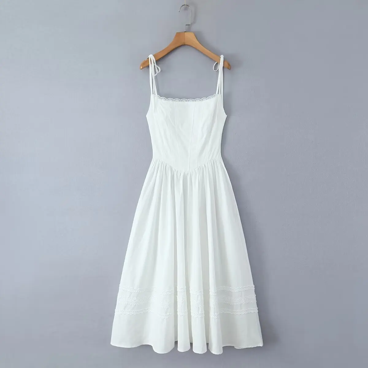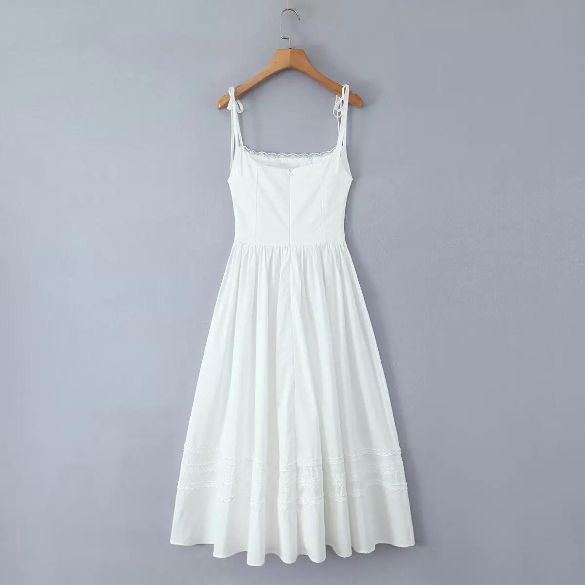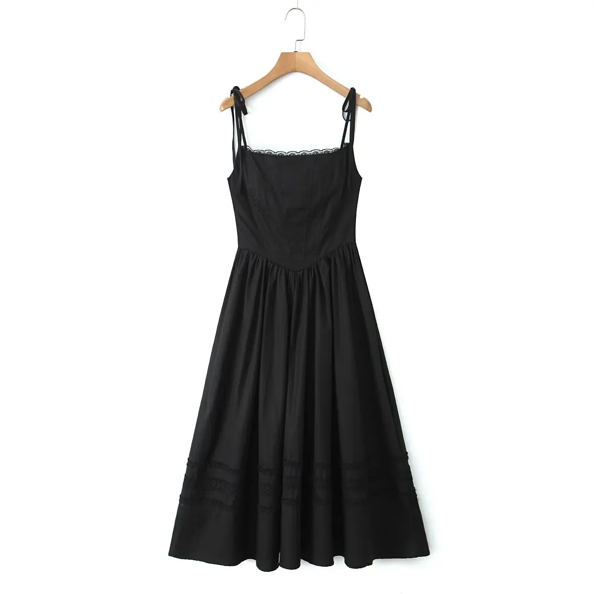Elegant Women Lace Spliced Sexy Spaghetti Straps Dress Low Waist A-line Midi Long Summer Dresses Casual Party Robe Cotton