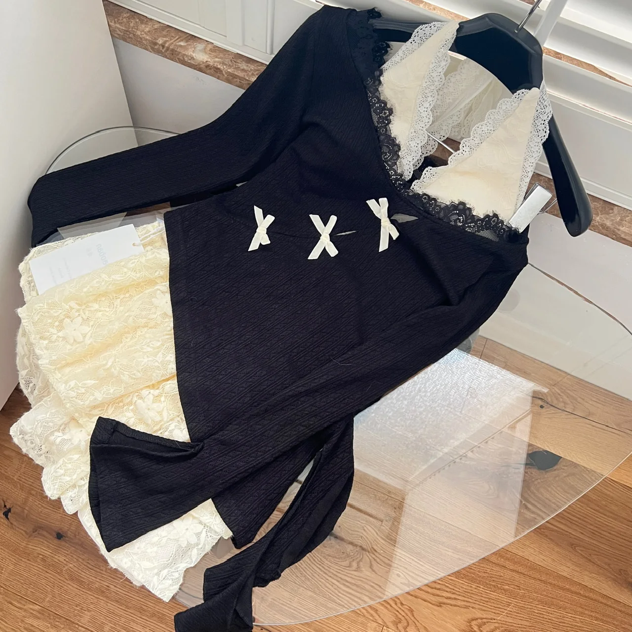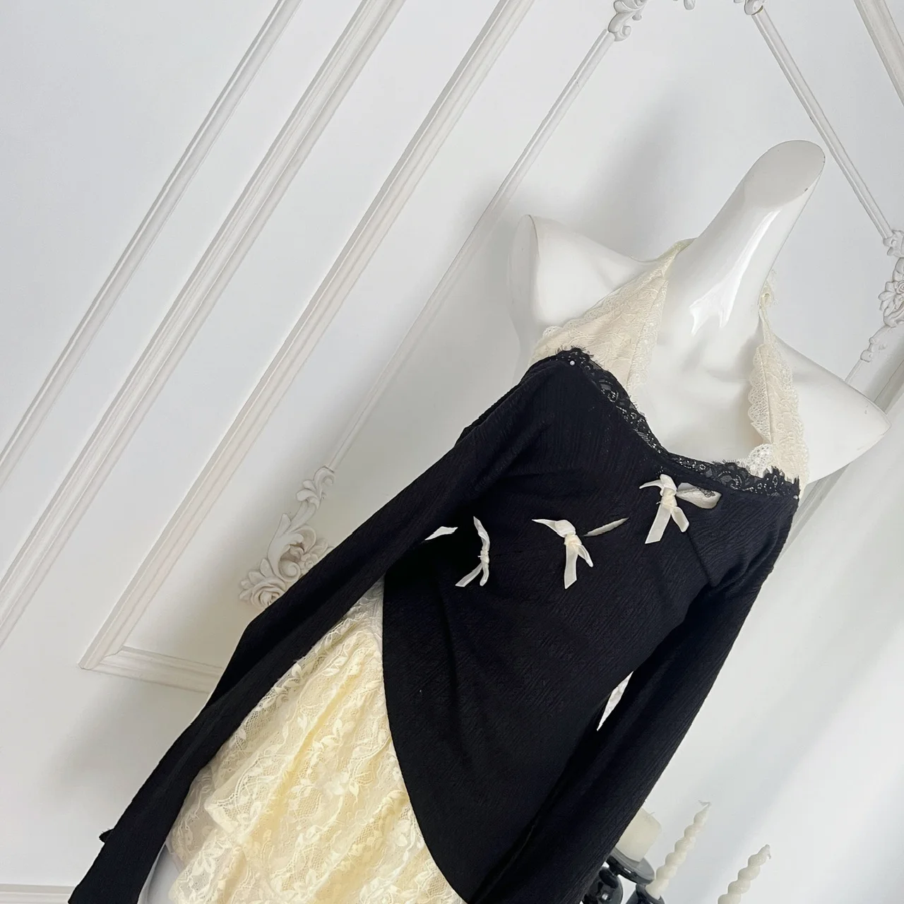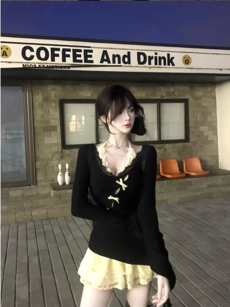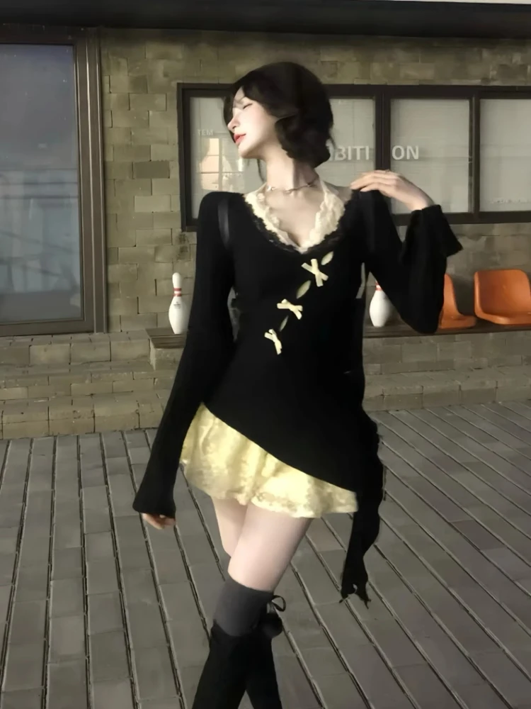 Fall Winter Women Y2k Shoujo Girl 2000s Kpop Korean Outfits 2 Piece Set Long Sleeve Tops + Coquette Ballet Core Mini Lace Dress