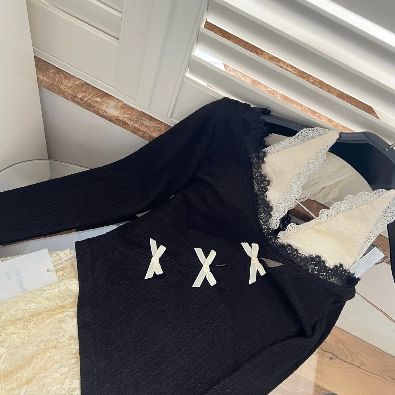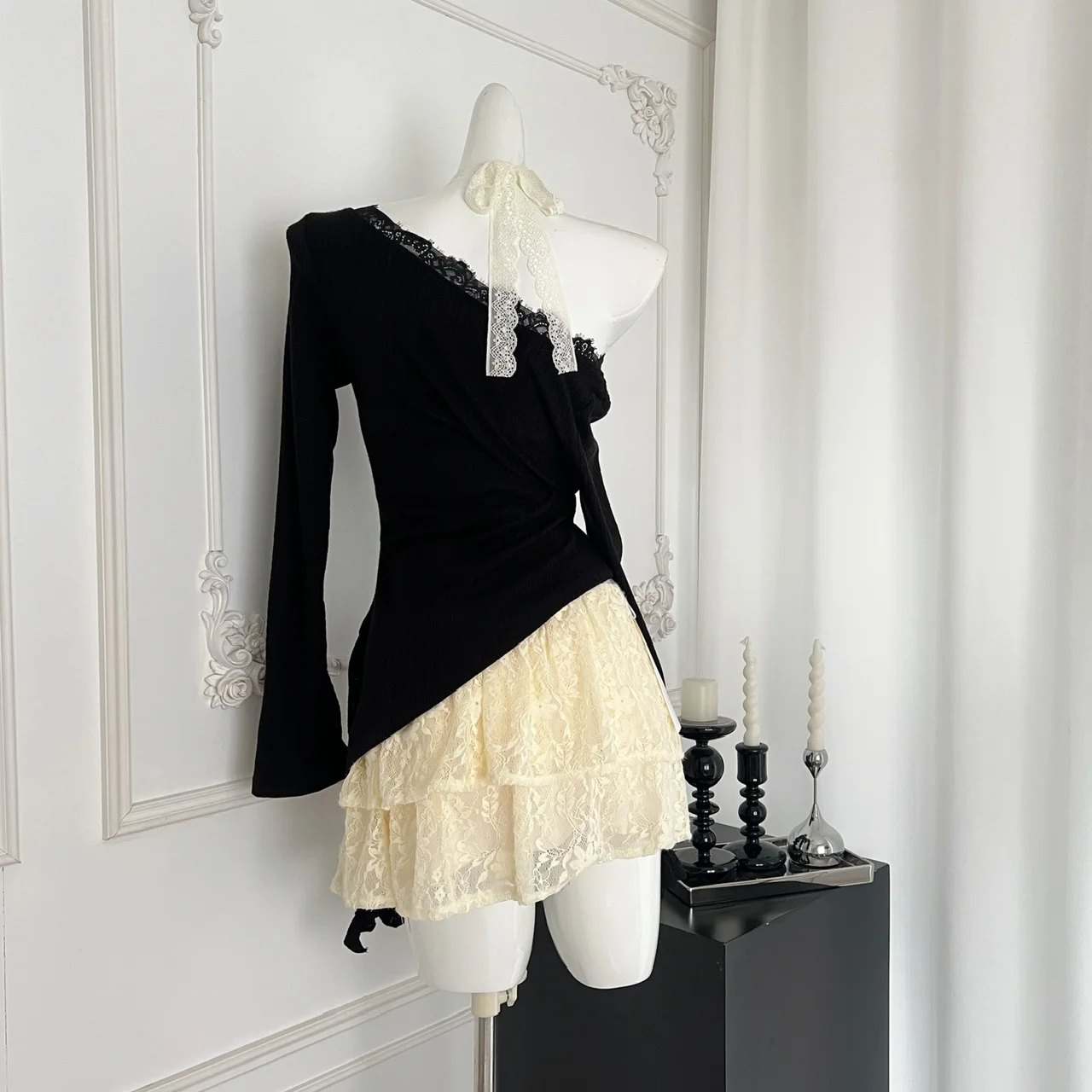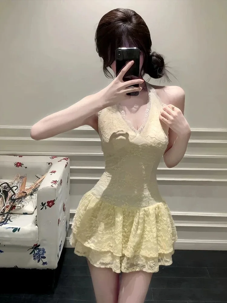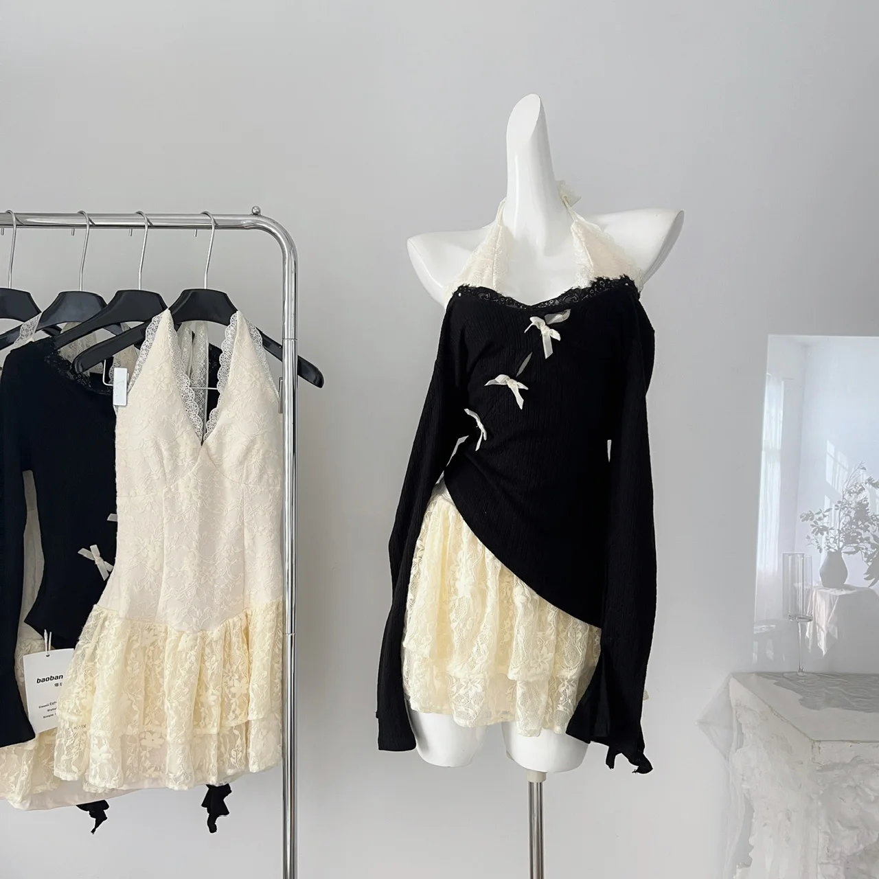 Fall Winter Women Y2k Shoujo Girl 2000s Kpop Korean Outfits 2 Piece Set Long Sleeve Tops + Coquette Ballet Core Mini Lace Dress
