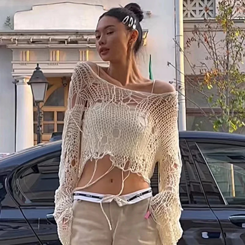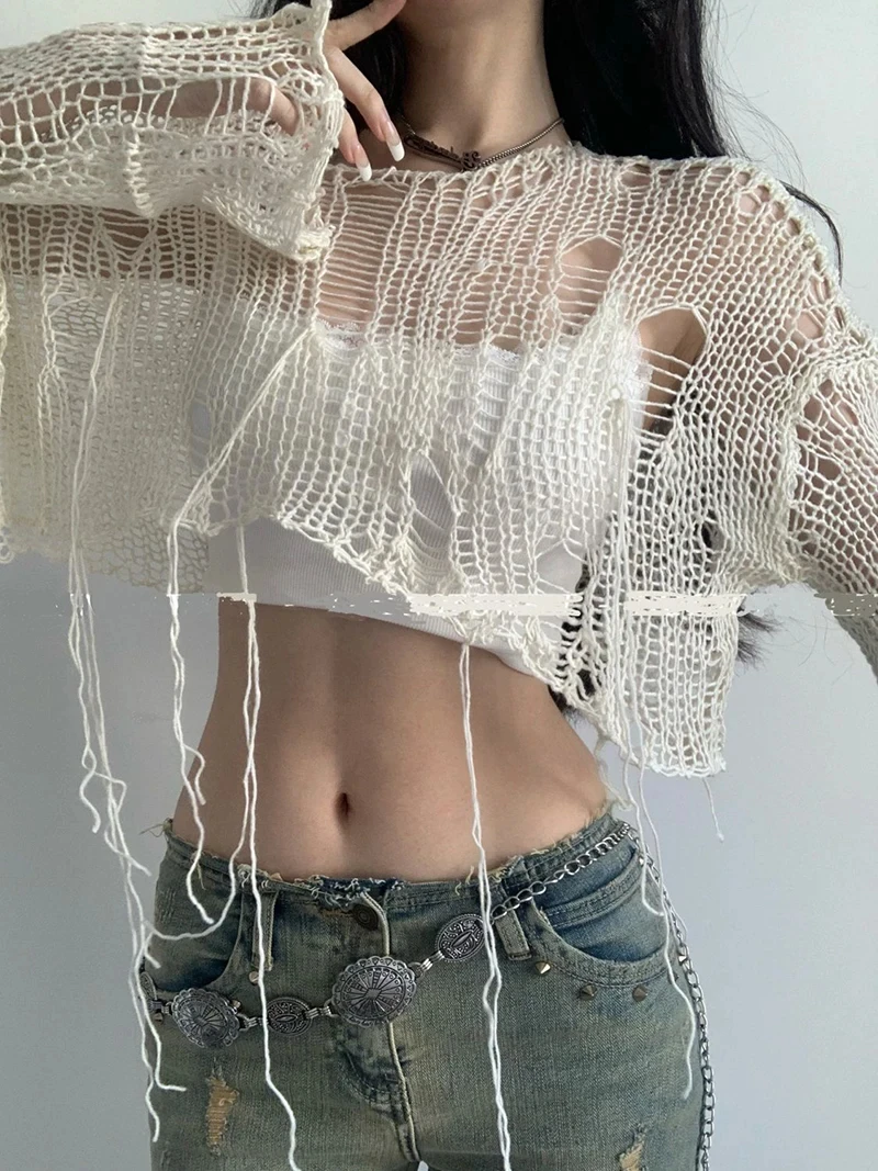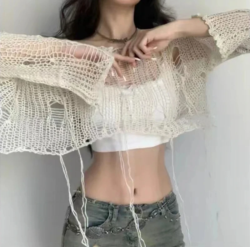 Fashion Boho Women Knitted T Shirt Y2k Hollow Out Loose Female Crop Tees Vintage Korean Ripped Long Sleeve Match Ladies Jumpers