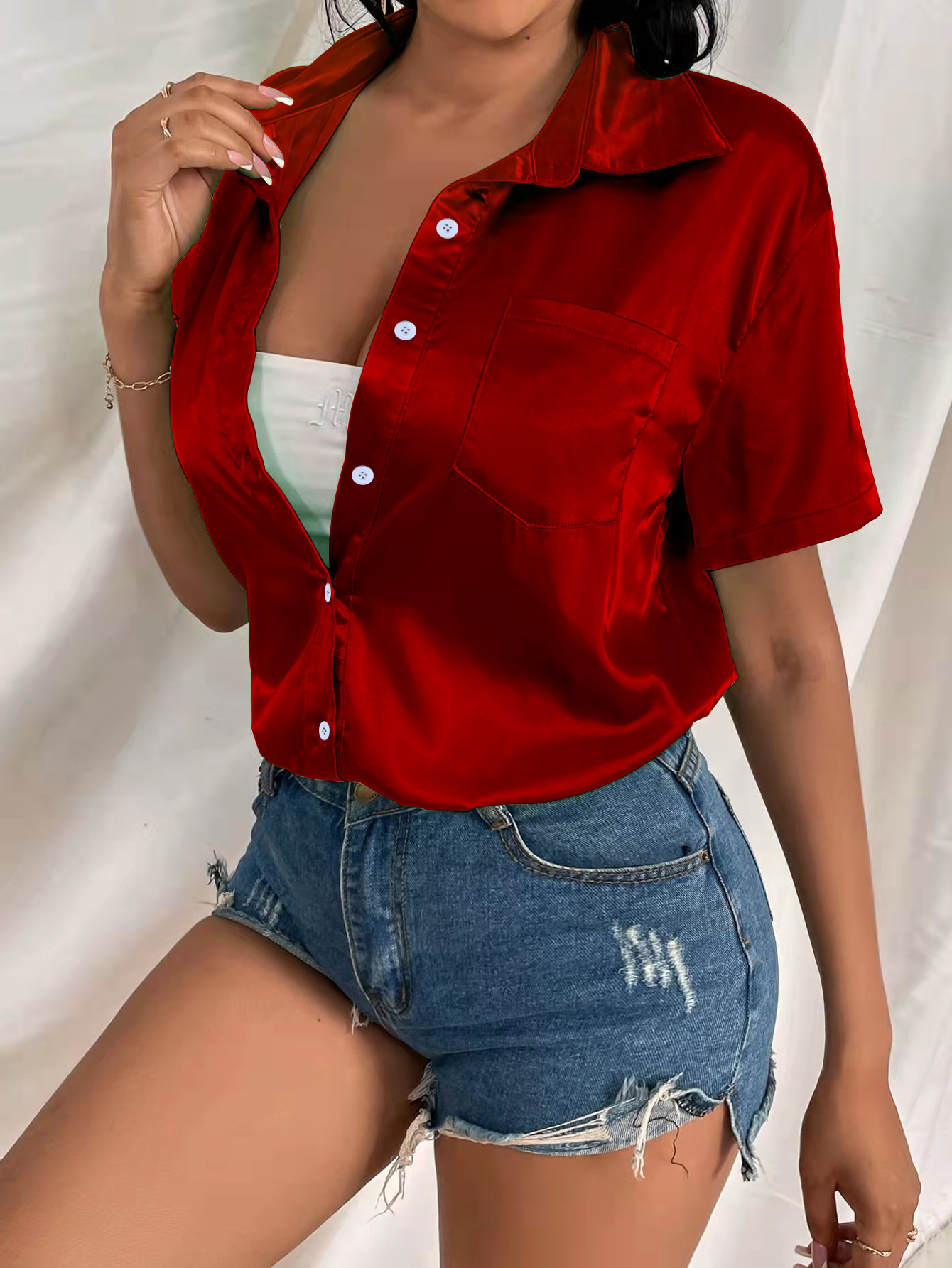 Fashion Casual Satin Blouse Women Summer Loose Button Up Silk Women Shirt Solid Office Lady Short Sleeve Blouses Tops