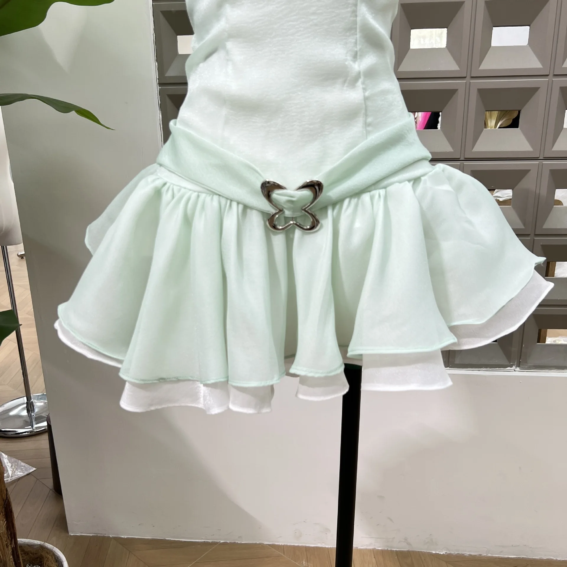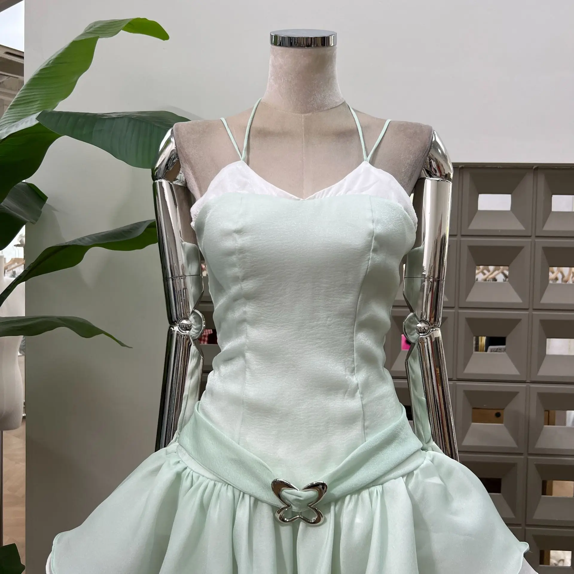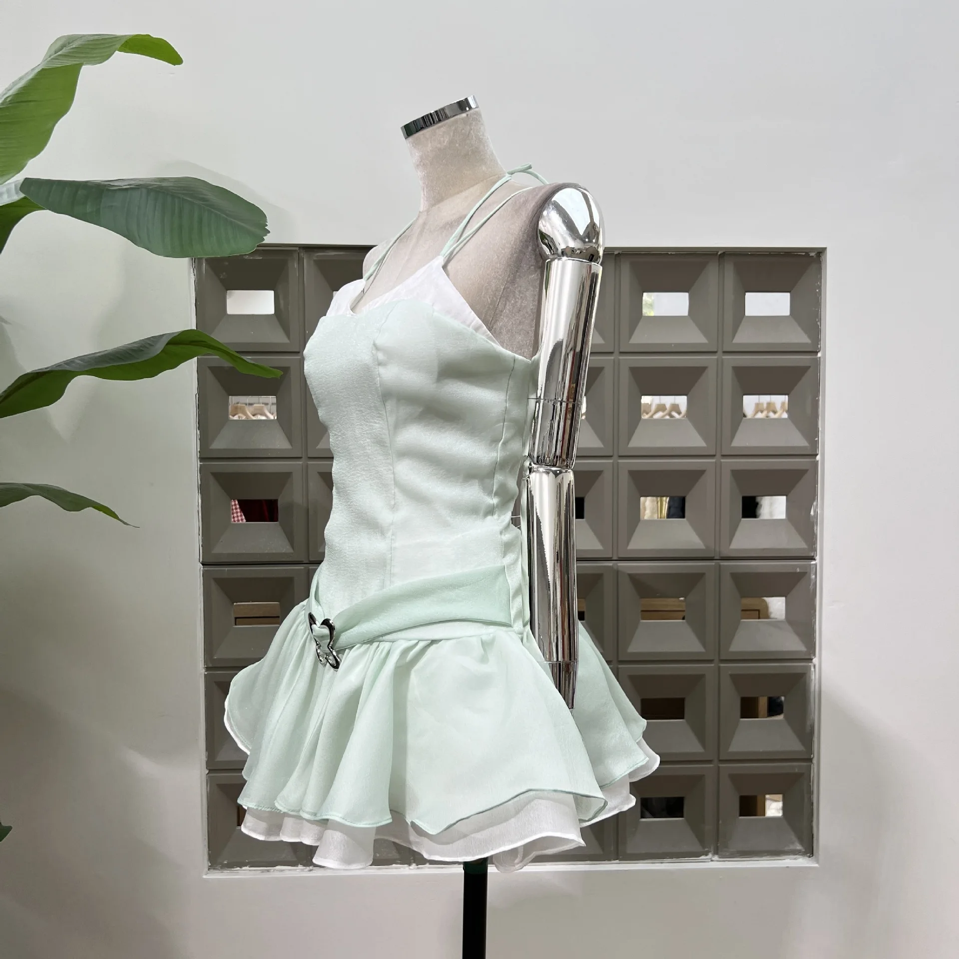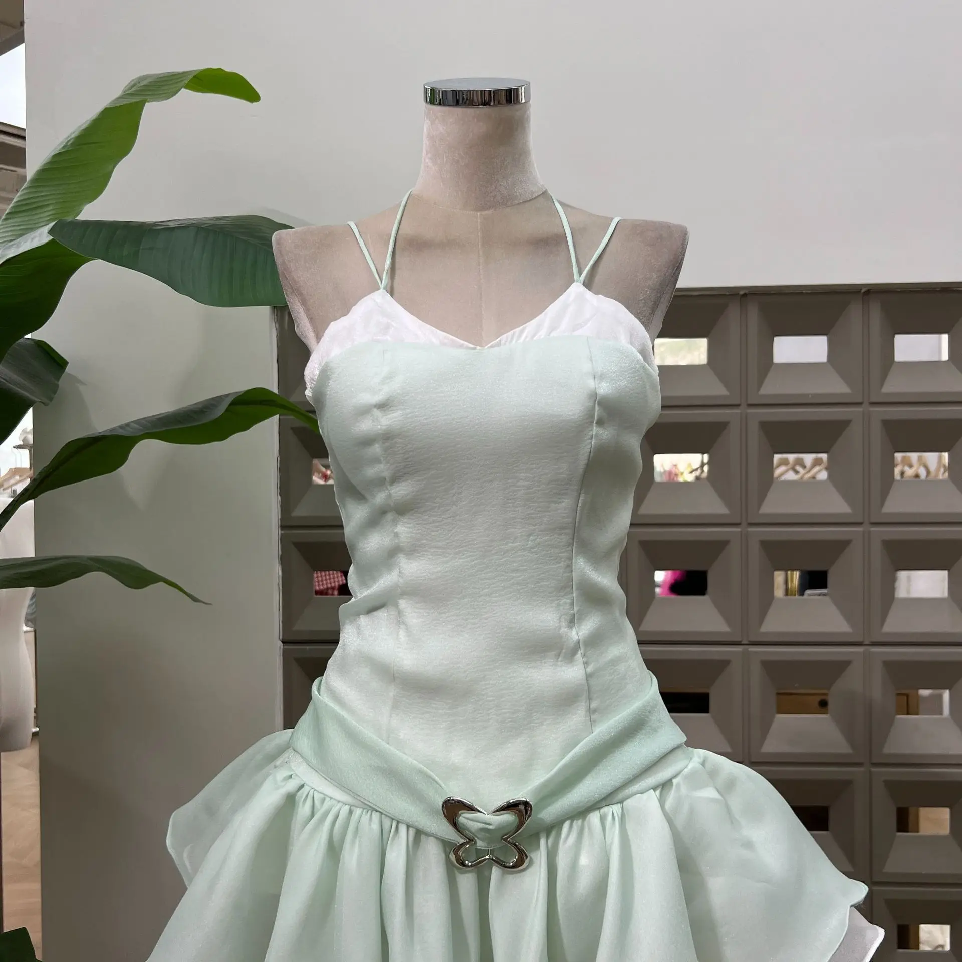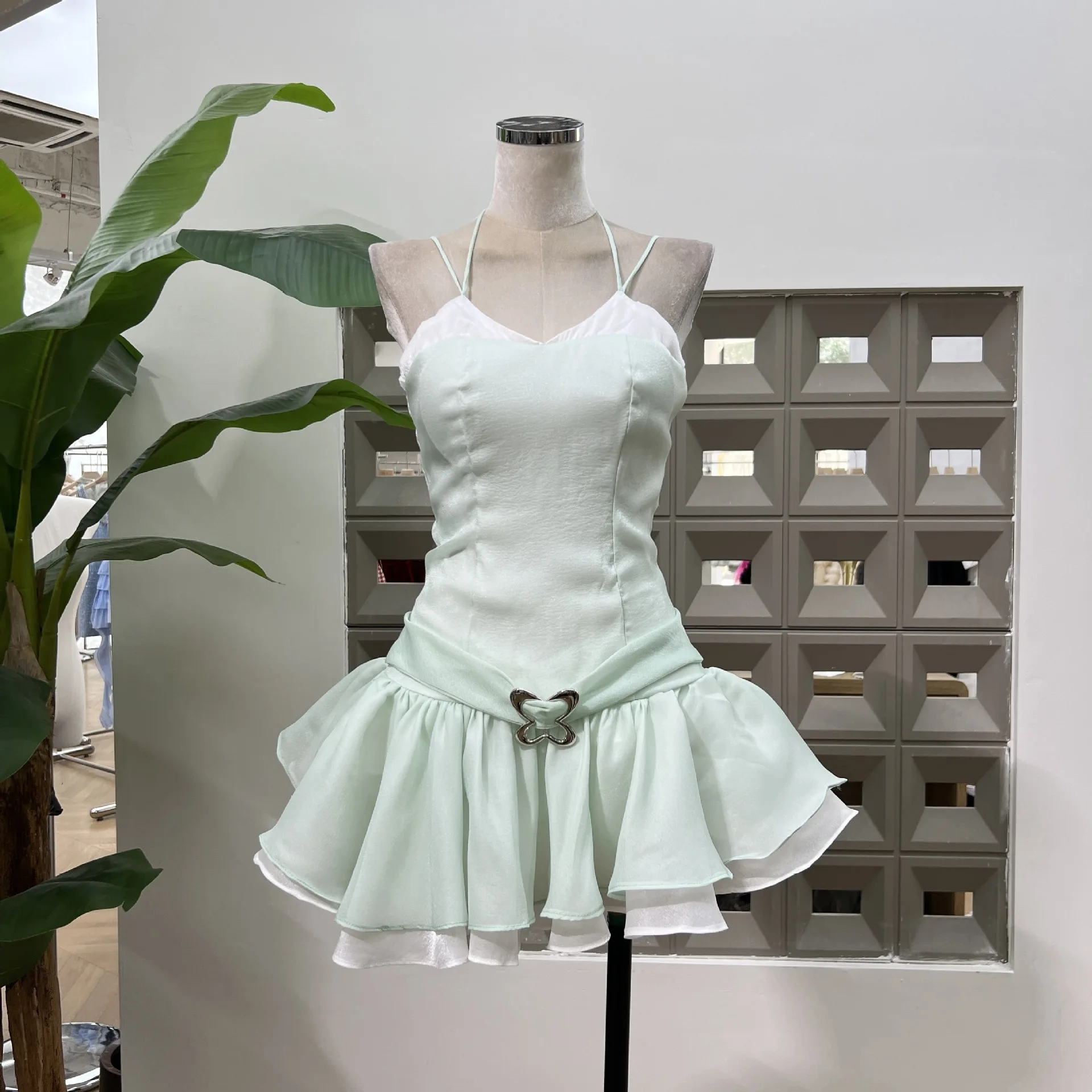 Fashion Contrast Color Green Spaghetti Strap Dress Women's Slim Metal Buckle Bottom Shorts Mini Dresses Summer New 3A106