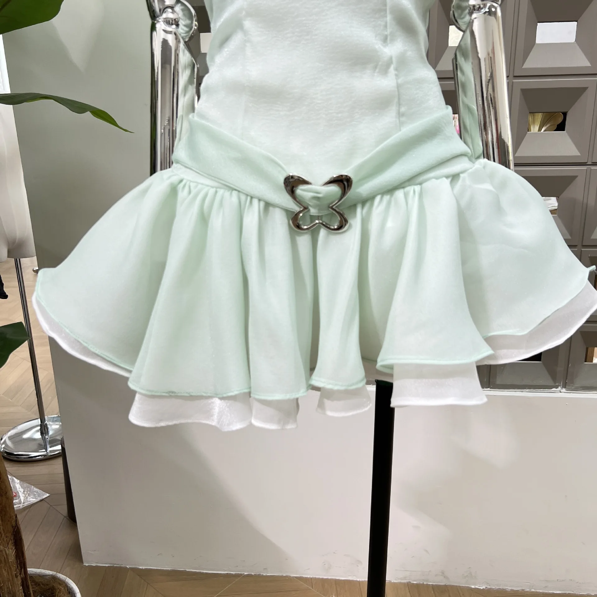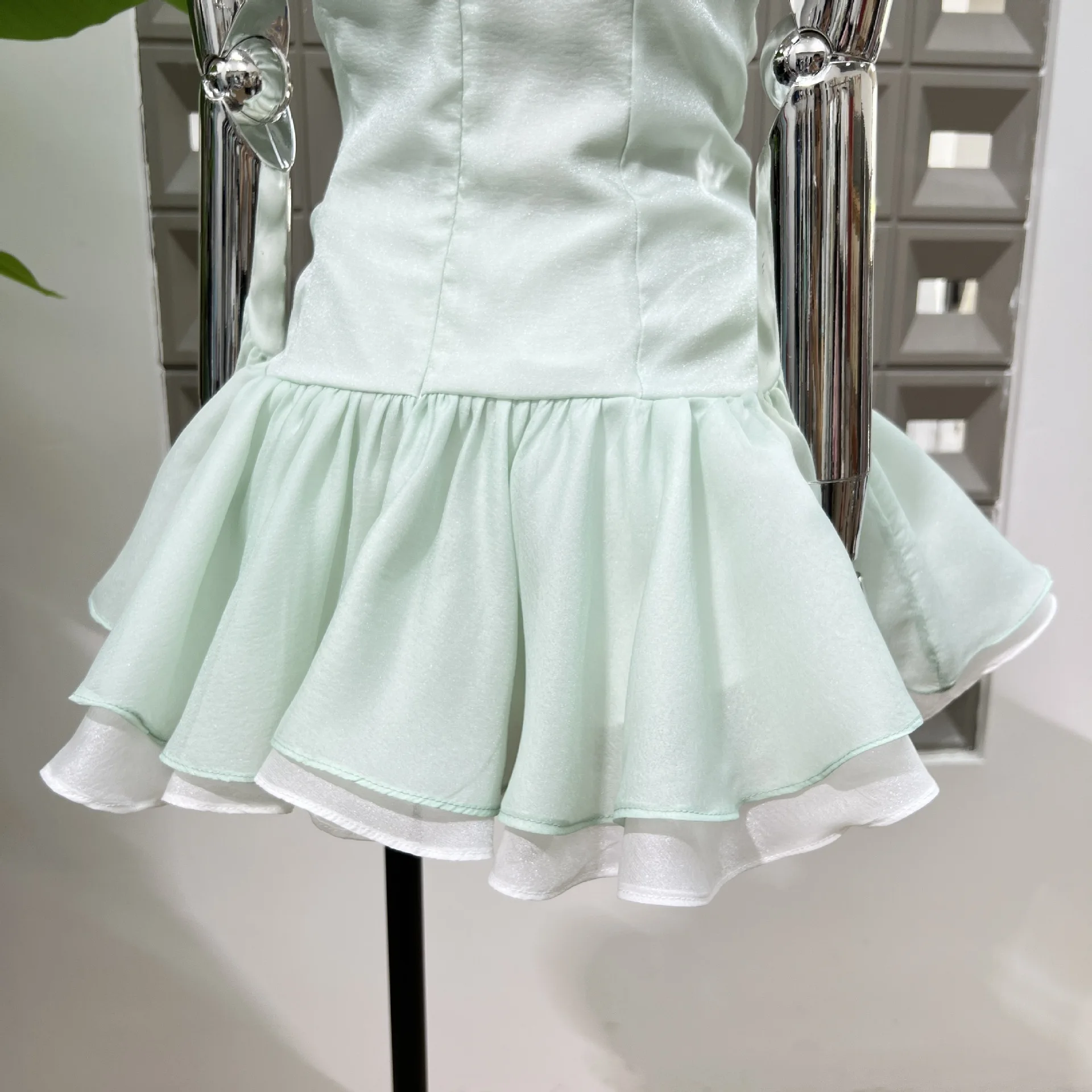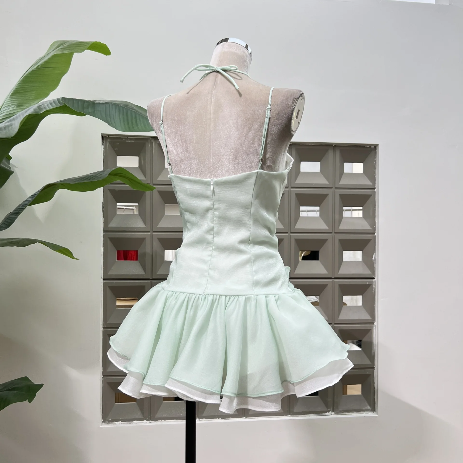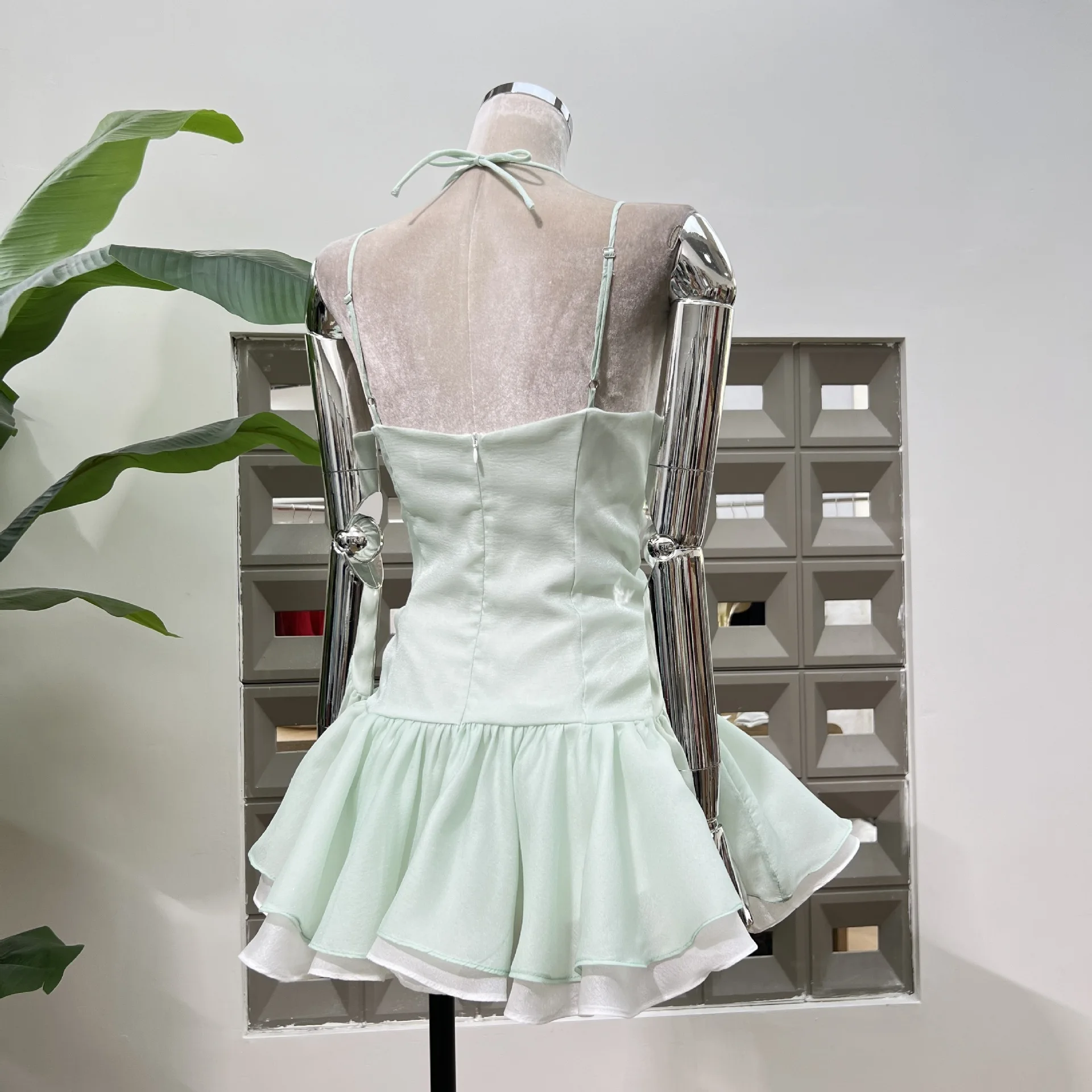 Fashion Contrast Color Green Spaghetti Strap Dress Women's Slim Metal Buckle Bottom Shorts Mini Dresses Summer New 3A106