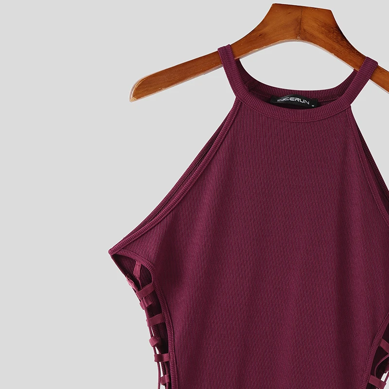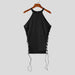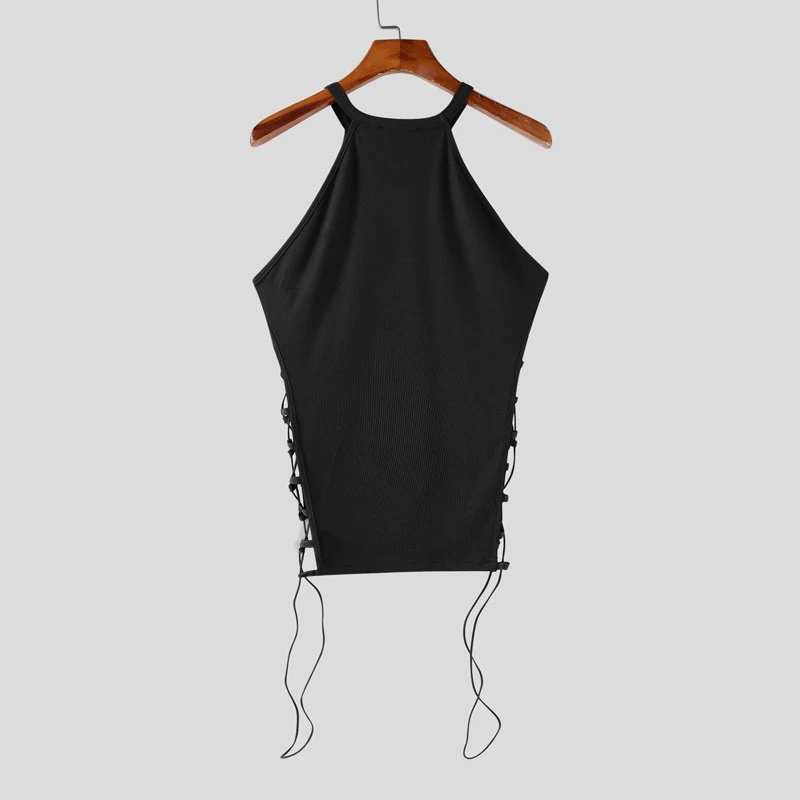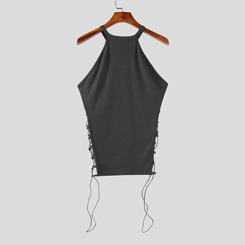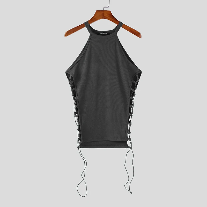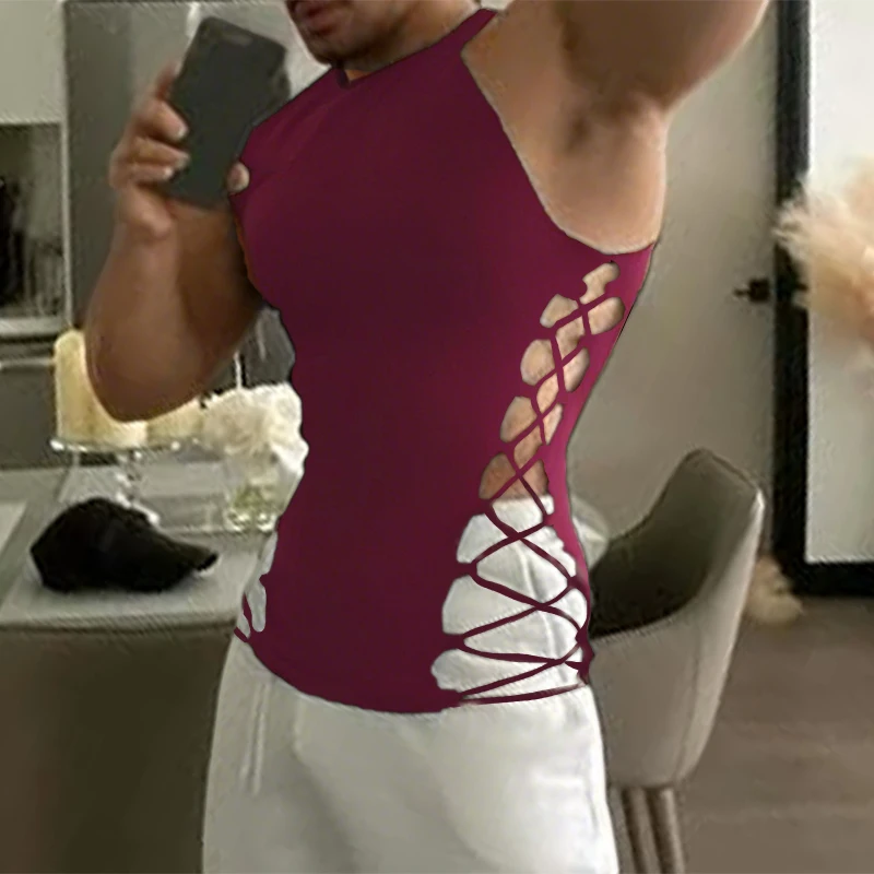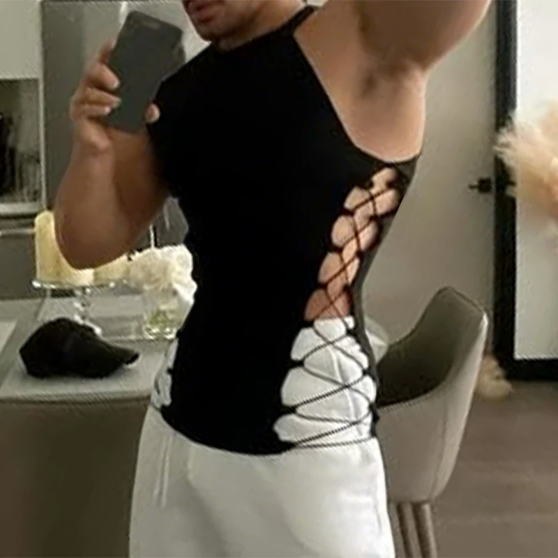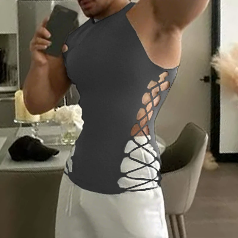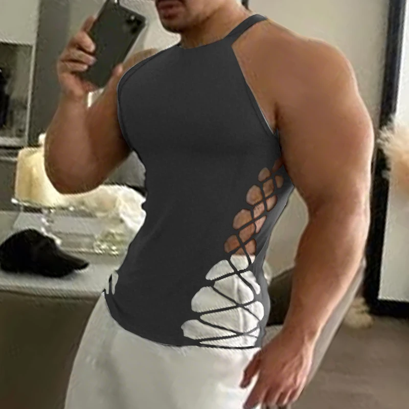 Fashion Men Tank Tops Solid Color Drawstring Hollow Out Sexy Male Vests Summer Streetwear 2025 Skinny Men Clothing S-3XL