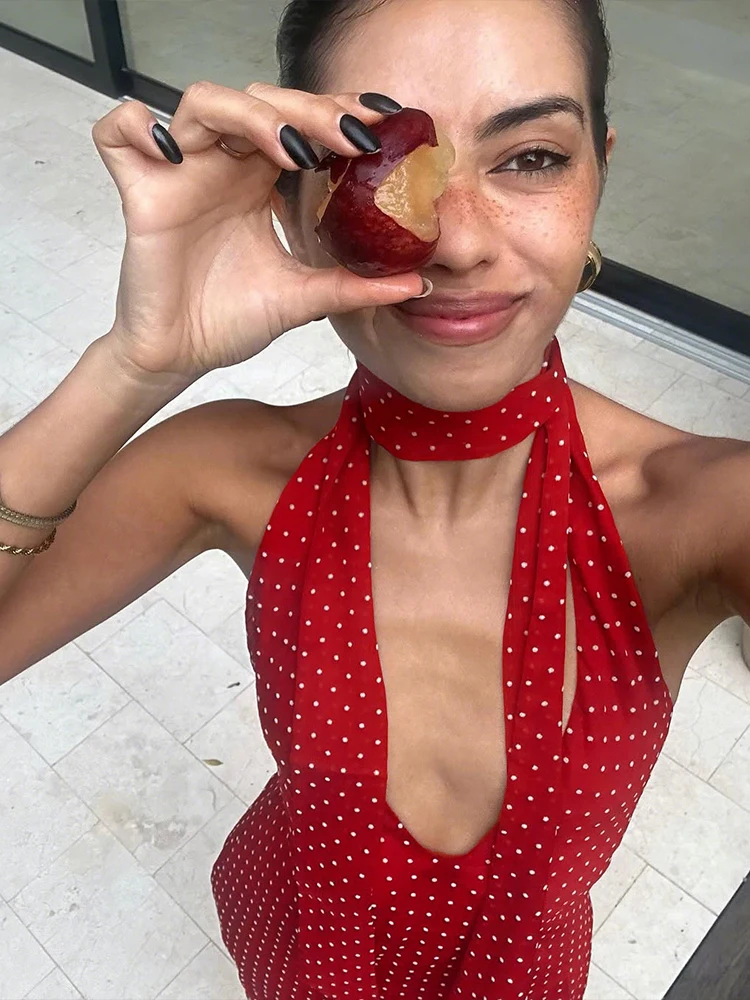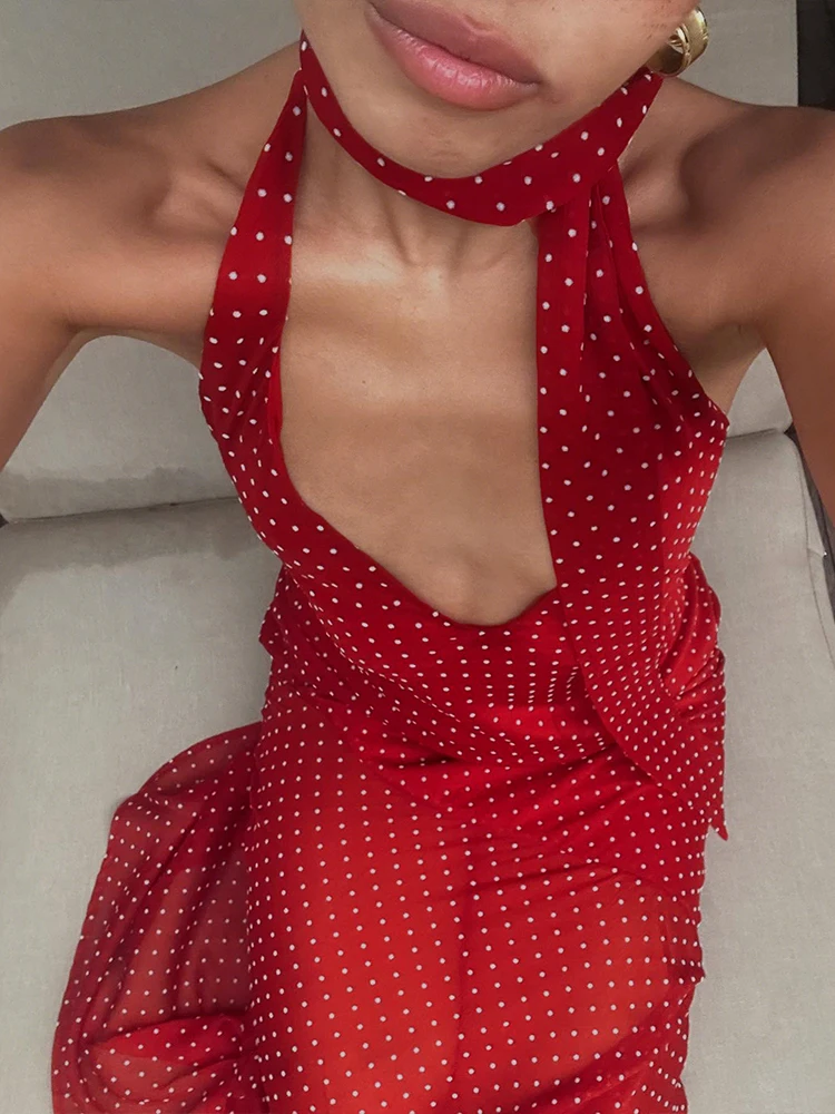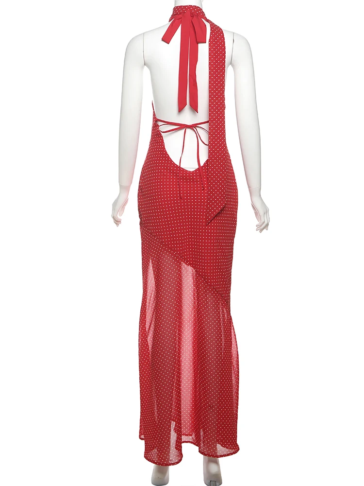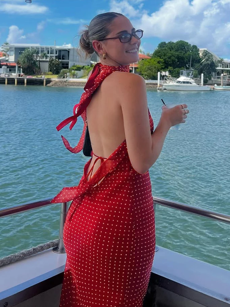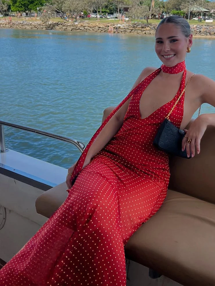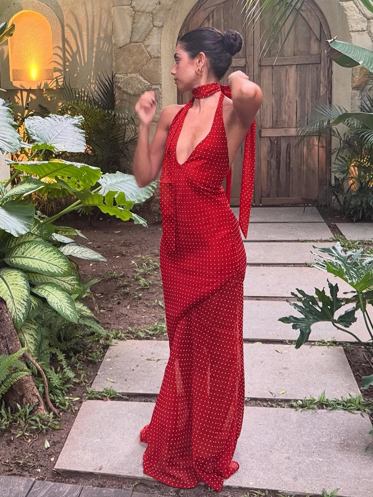 Fashion Polka Dot Print Maxi Dress Women Scarf+Halter Low-Neck Bandage Backless Robe Vacation Trend Elegant Vestidos