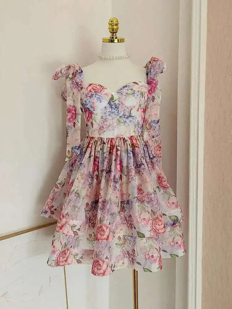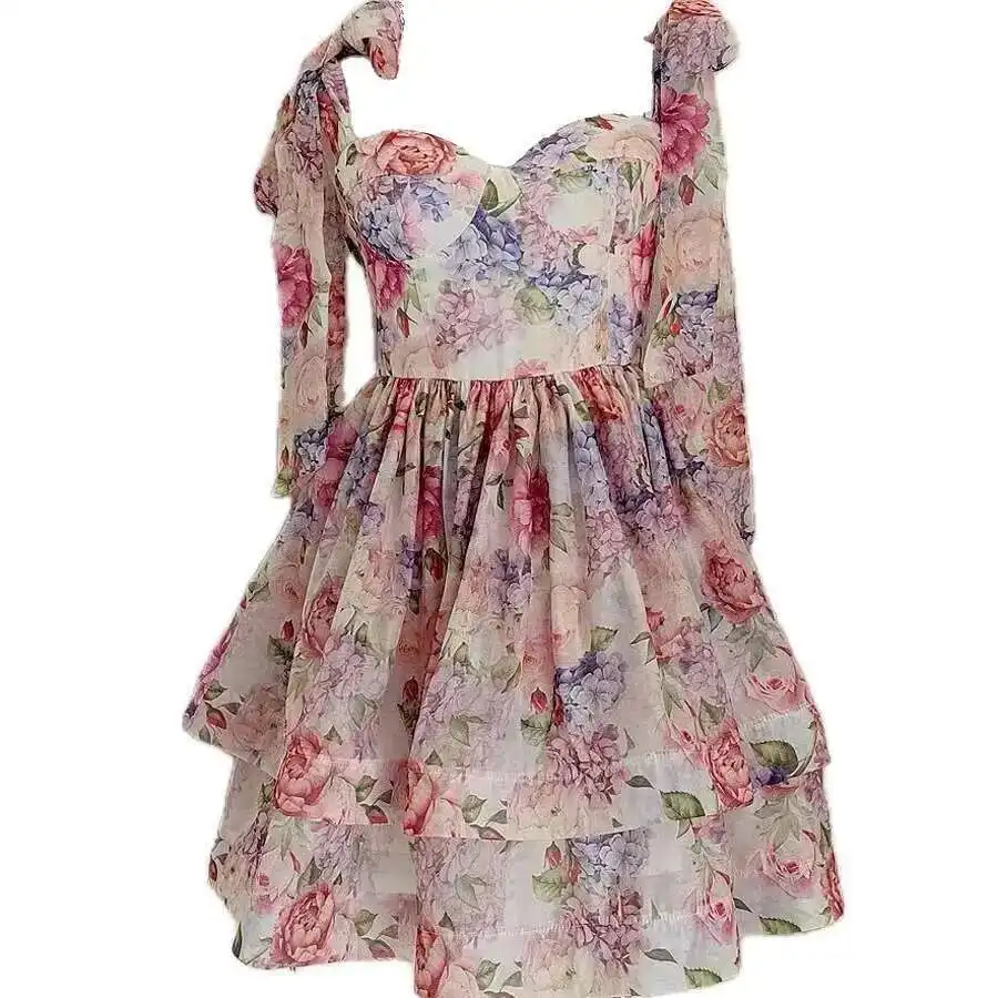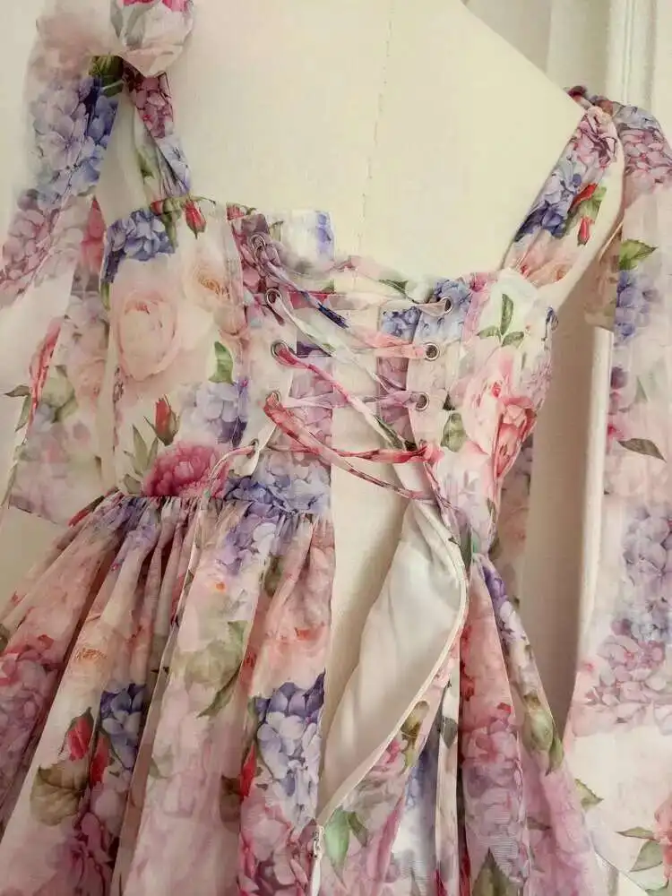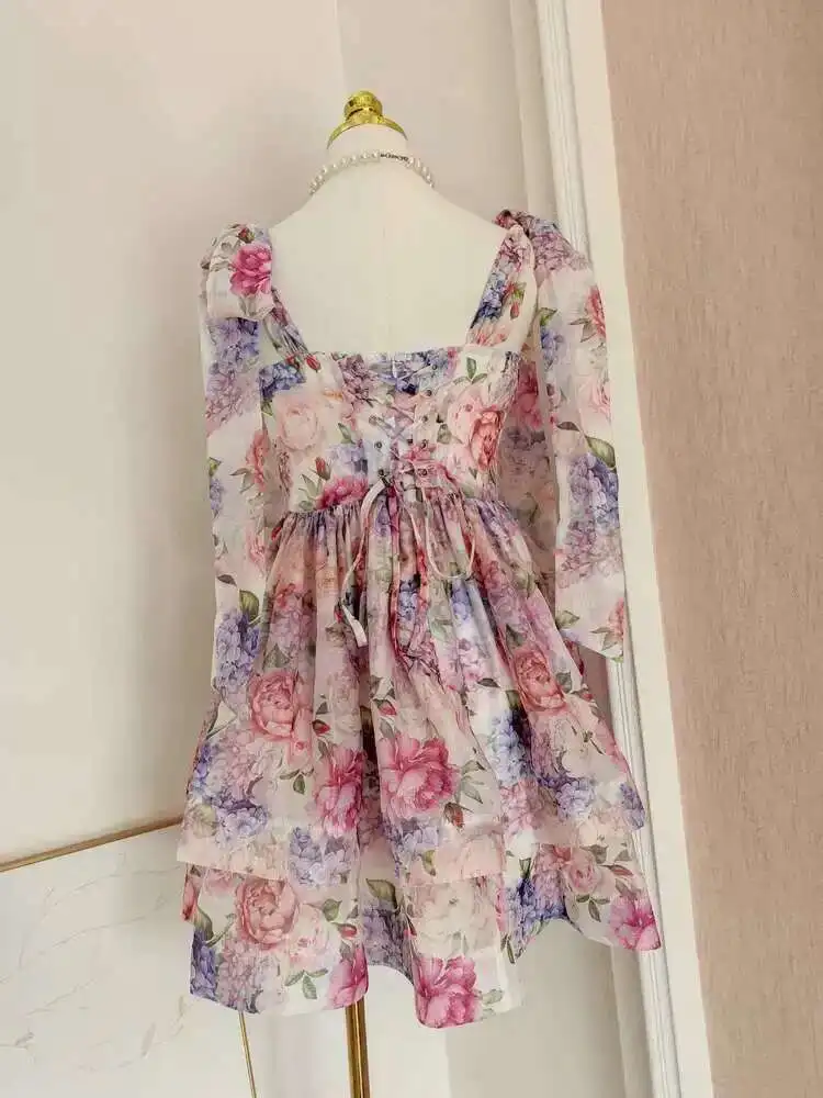 Fashion Women Dress Full Sleeve Square Collar Print Lace Up Bow Female Party Dress New Tide