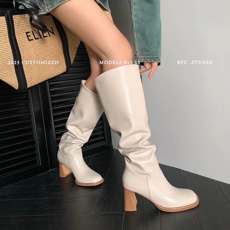 Fashion Women Knee High Boots Square Toe Split Leather Long Boots High Heels Casual Shoes Woman Autumn Winter Size 34-42