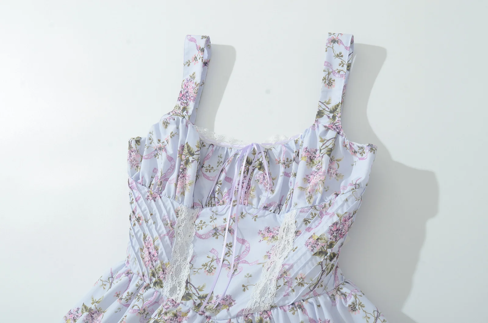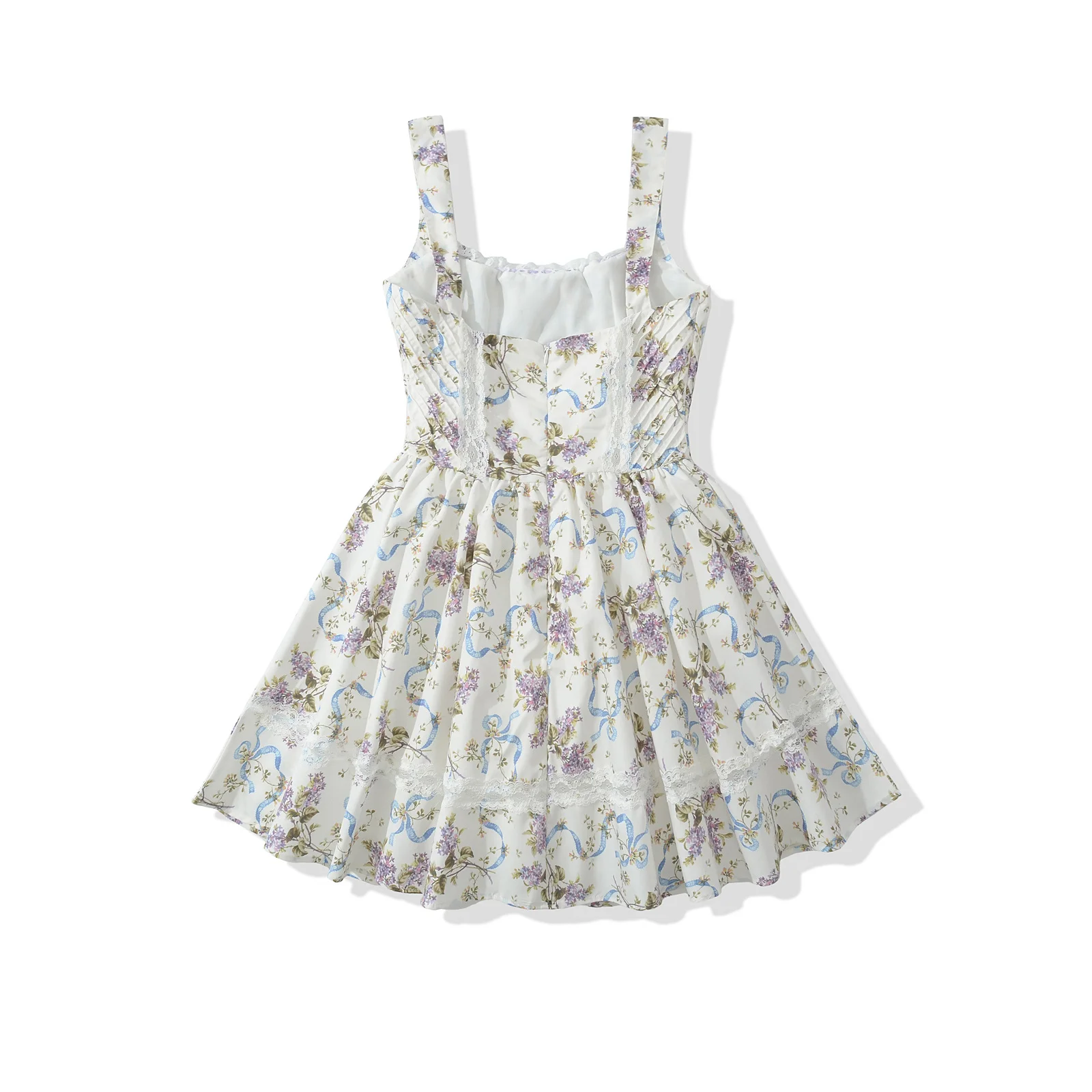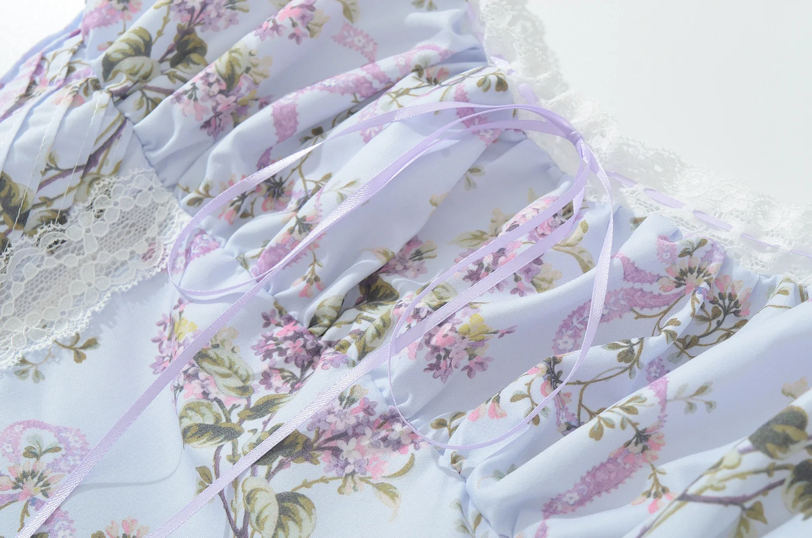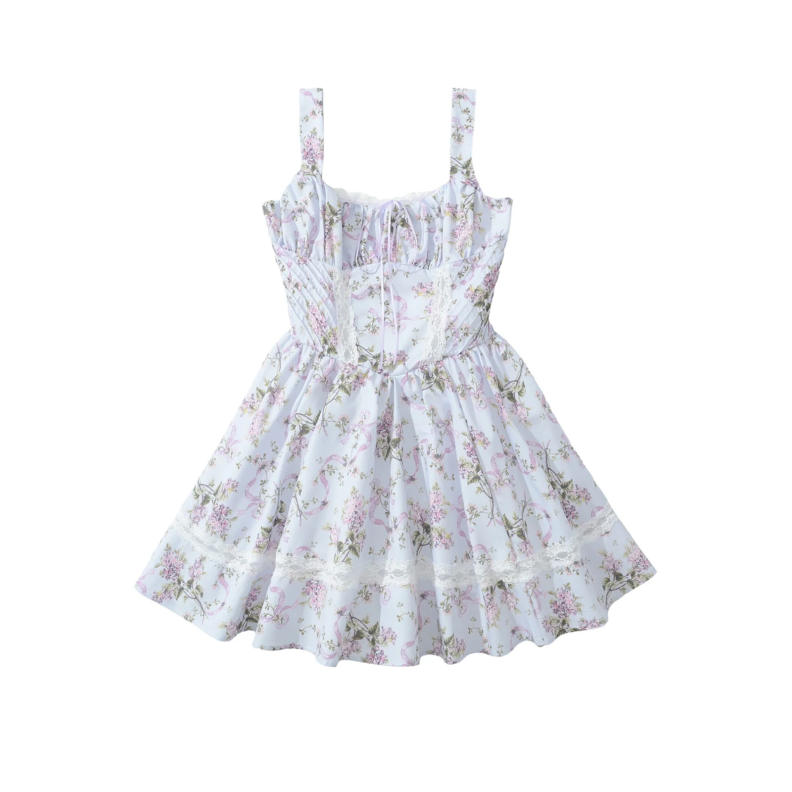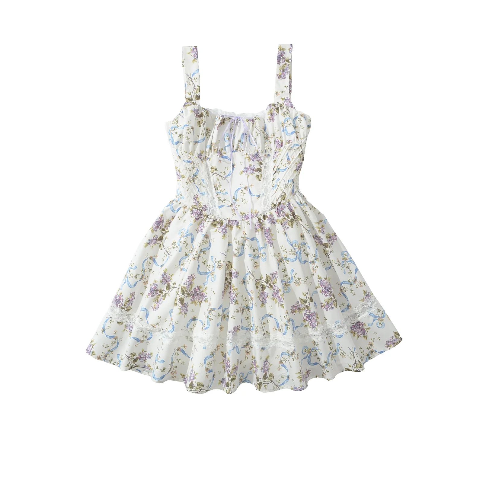 Floral Print Tank Mini Dress Women Lace Spliced O Neck Sleeveless A-line Holiday Casual Summer Dresses Party Robe