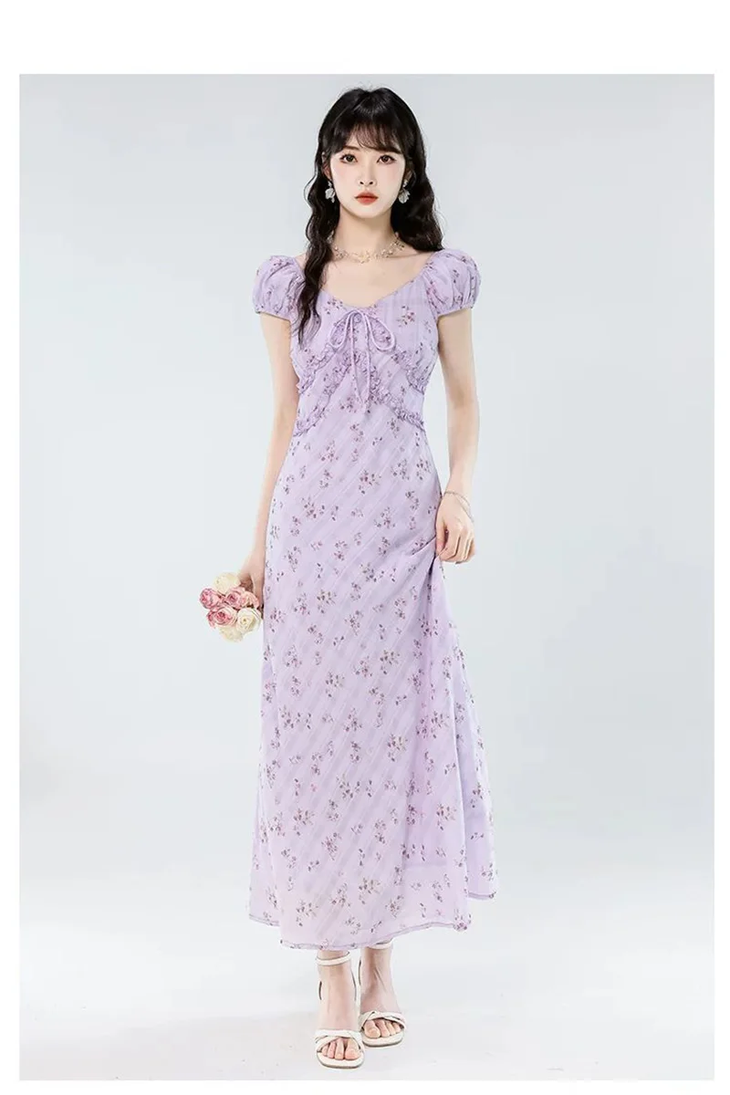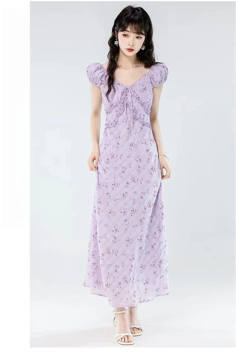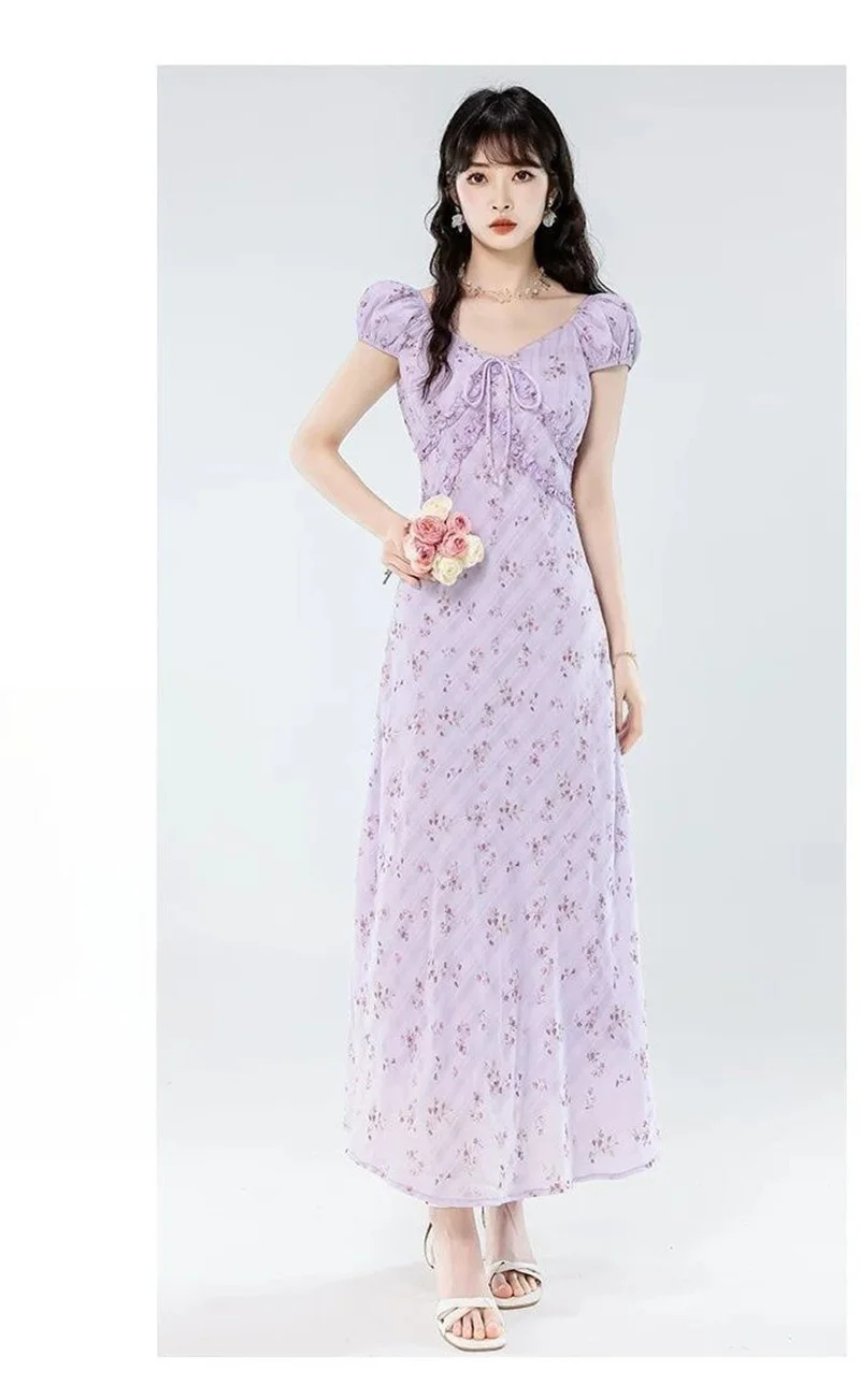 Floral Women Sweet Long Dress Elegant Vintage V Neck Slim Dress Casual Short Sleeve French Summer Retro Lady Vestidos New