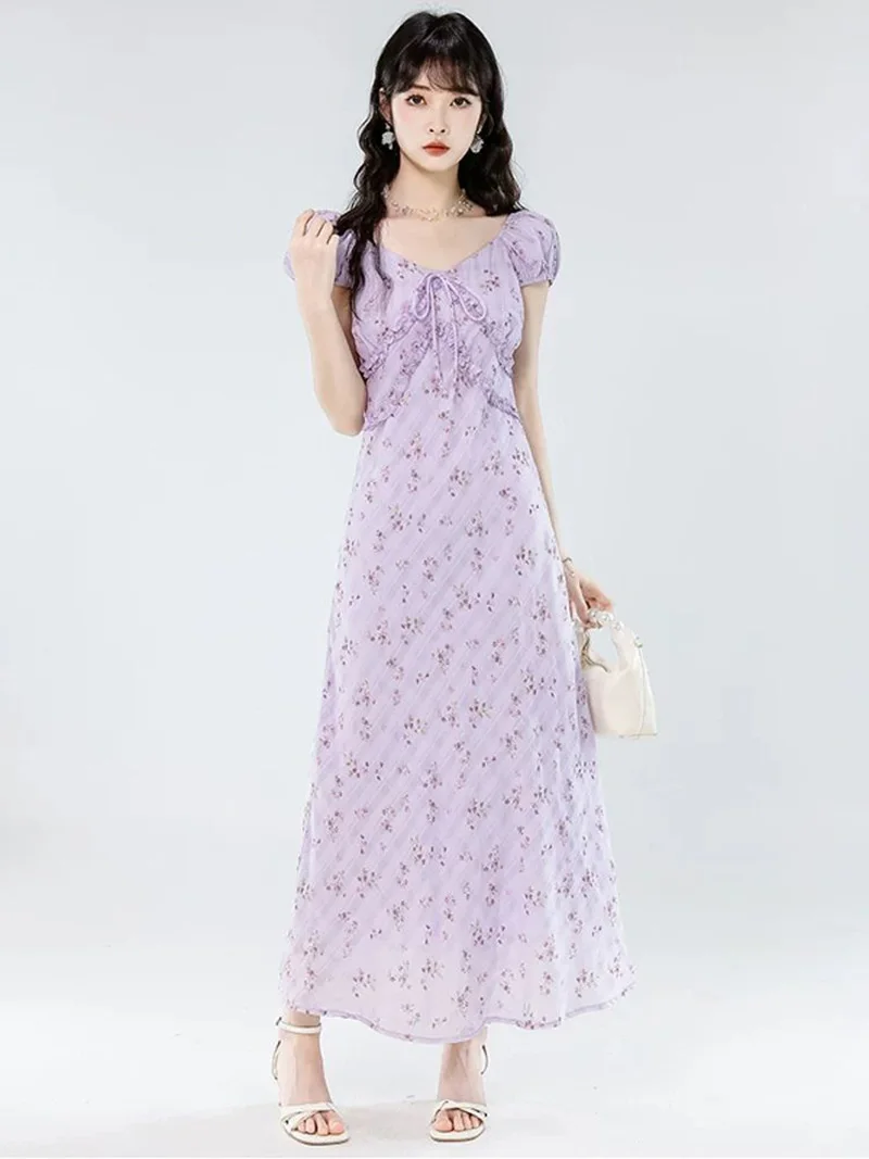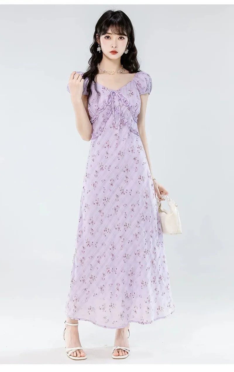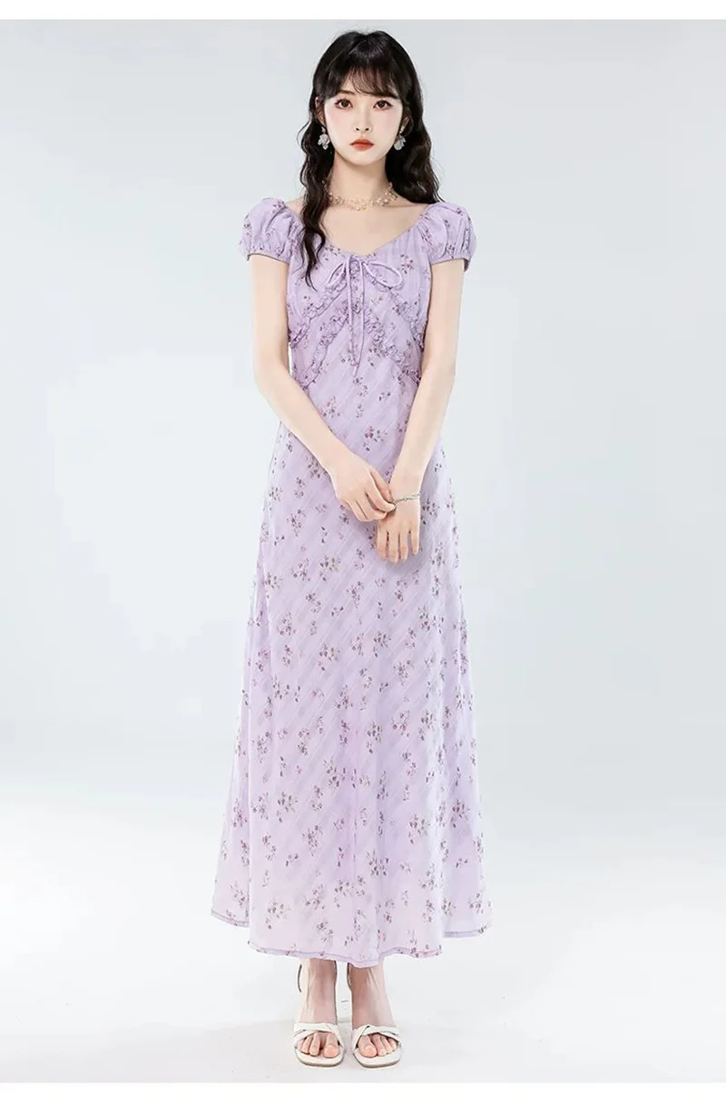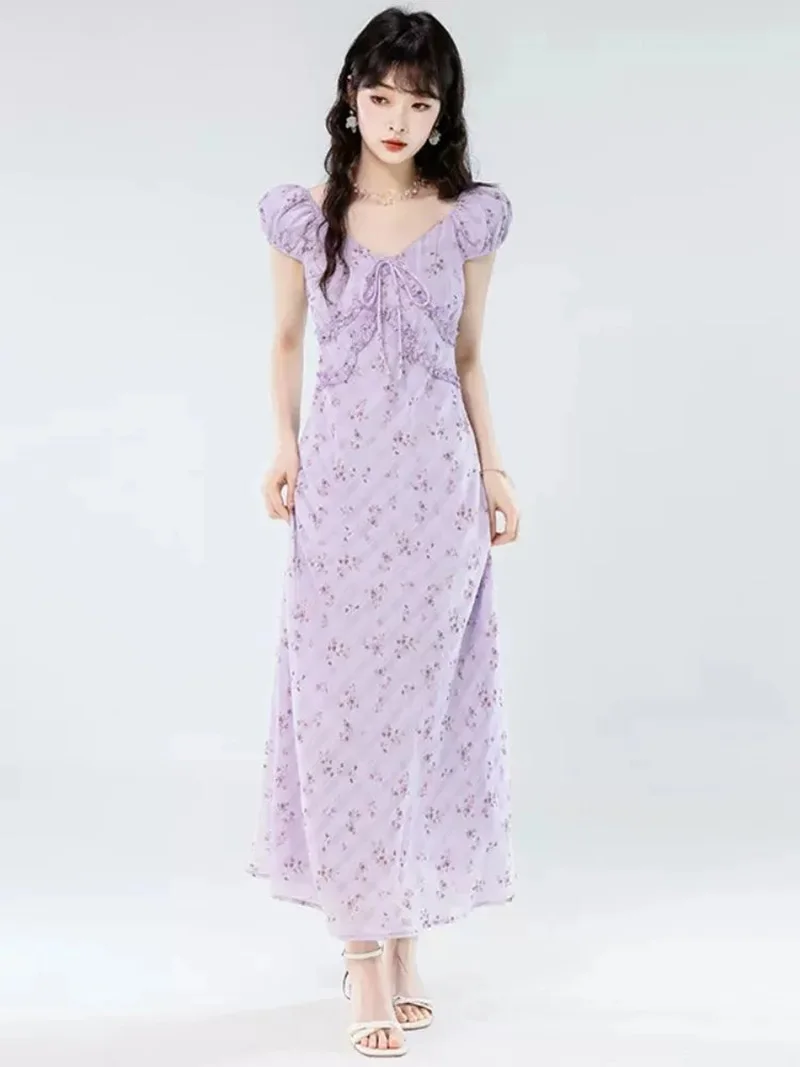 Floral Women Sweet Long Dress Elegant Vintage V Neck Slim Dress Casual Short Sleeve French Summer Retro Lady Vestidos New