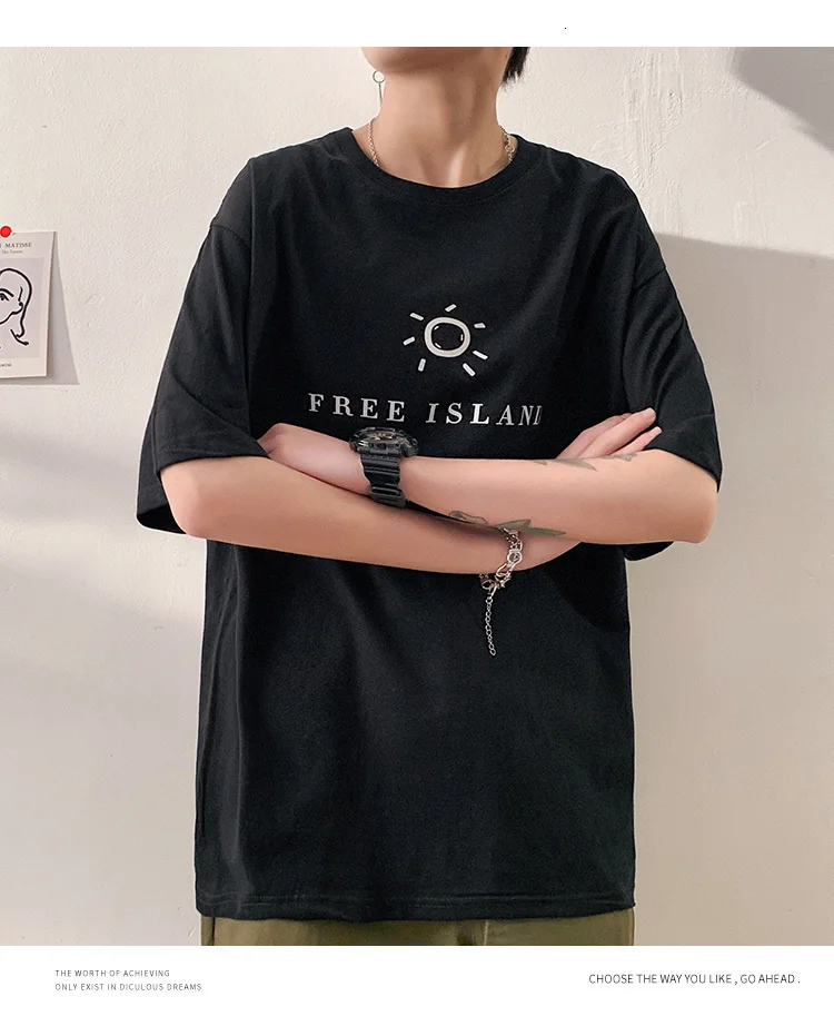 Free Island Pure Cotton Men Tshirt Short Sleeve Sun Graphic Oversize T-shirt Summer Man T shirt Men's Clothing voguable