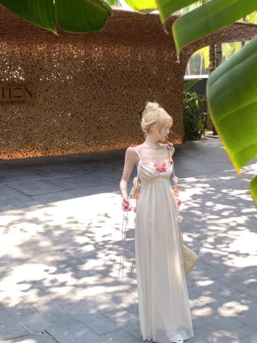 French 3D Flower Tank Dress Women's Summer Soft Mesh Long Dress White Open-back Waist-fitted A- line Skirt