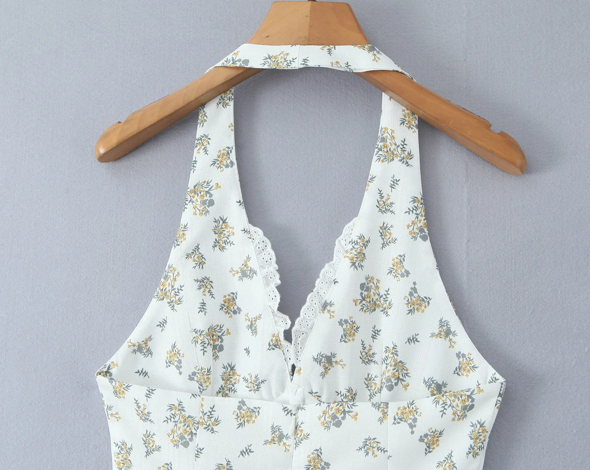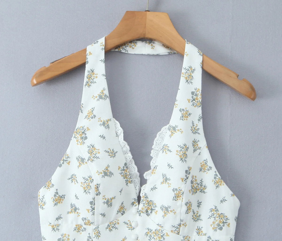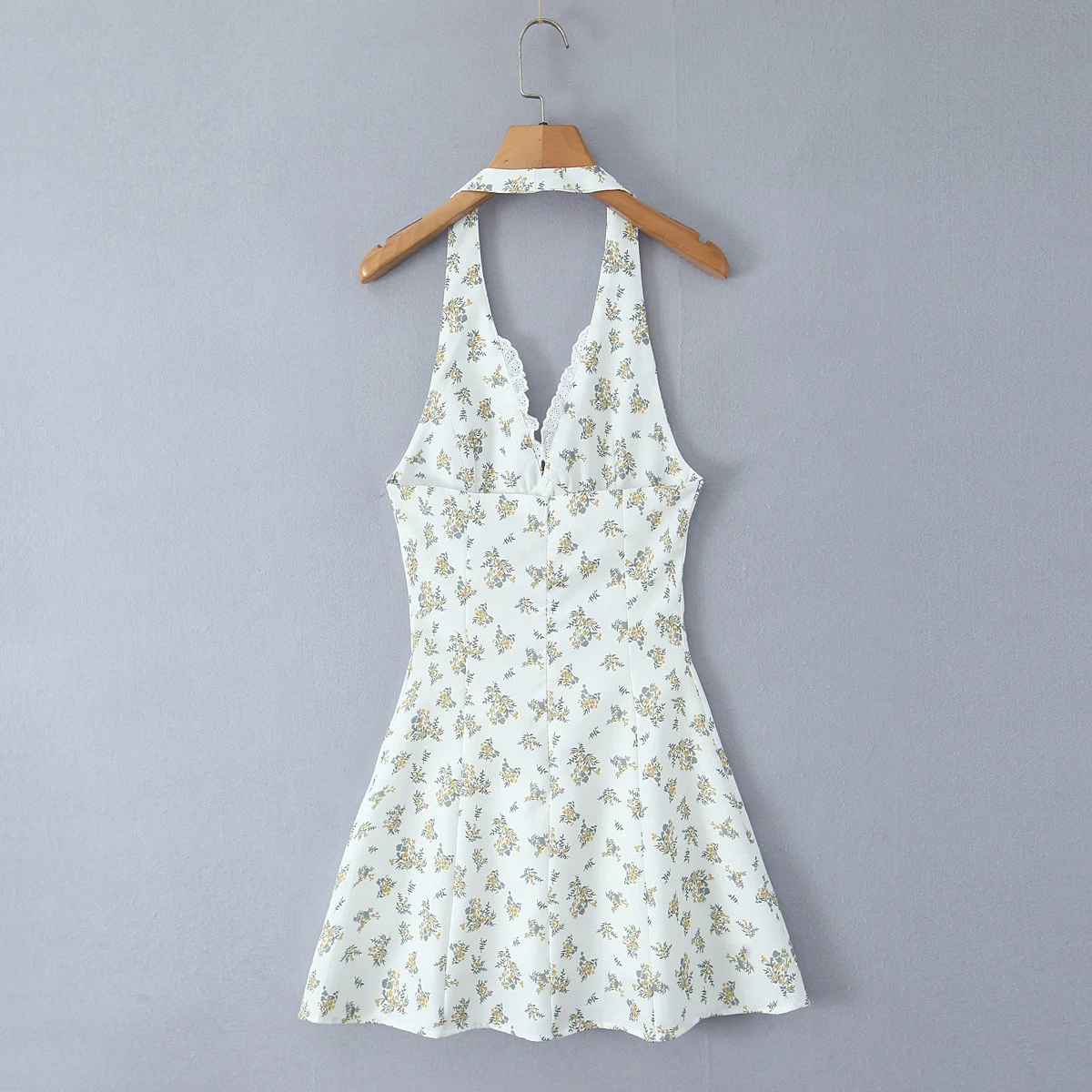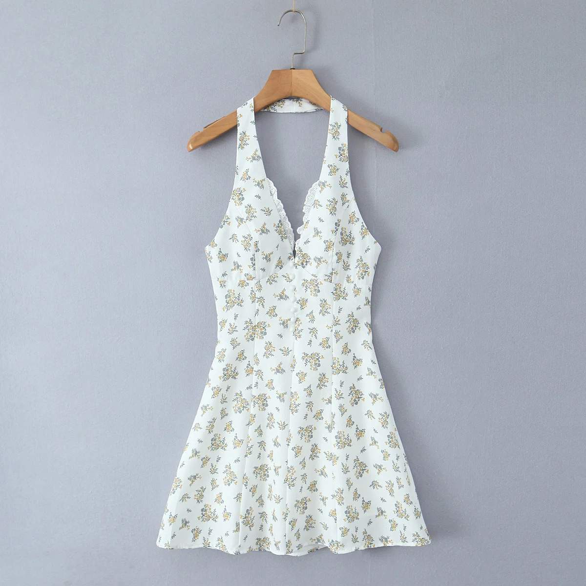 French Style Vintage Print Halter Dress Women Lace Trim A-line Short Summer Dresses Sweet Robe Holiday Vestidos