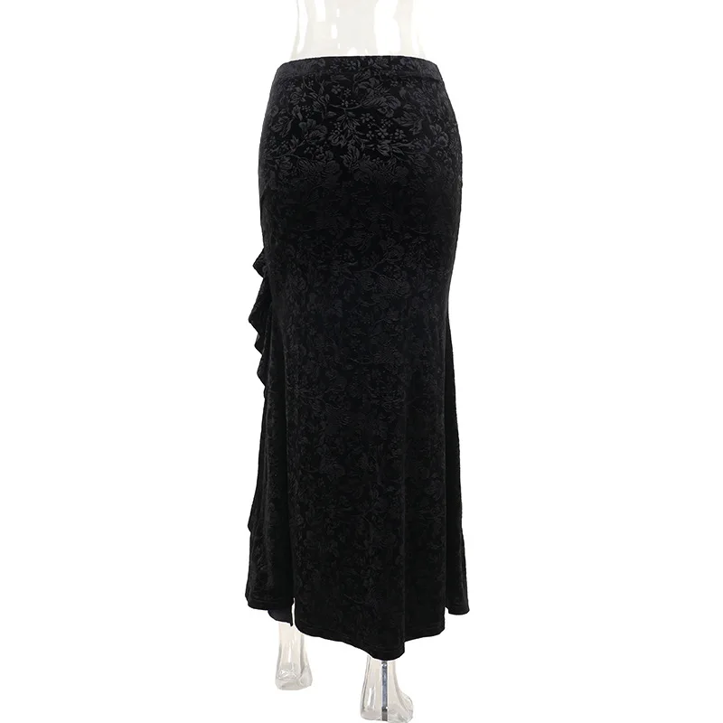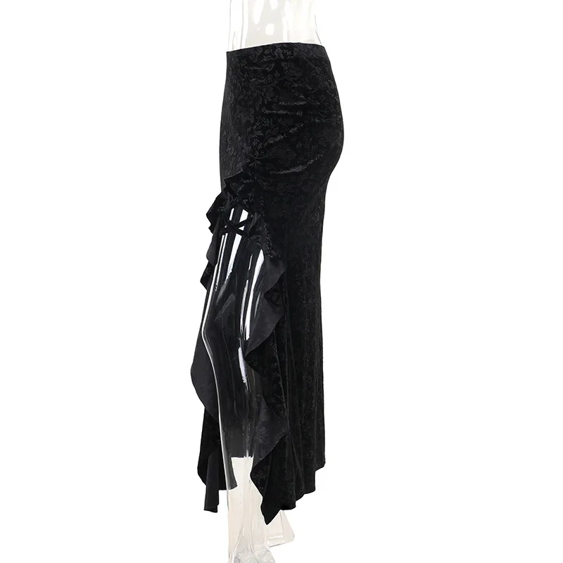 Goth Dark Elegant Fashion Flocking Long Skirt Women Mall Gothic Irregular Split Hem Ruffles Skirts Autumn Bottoms Alt Clothing