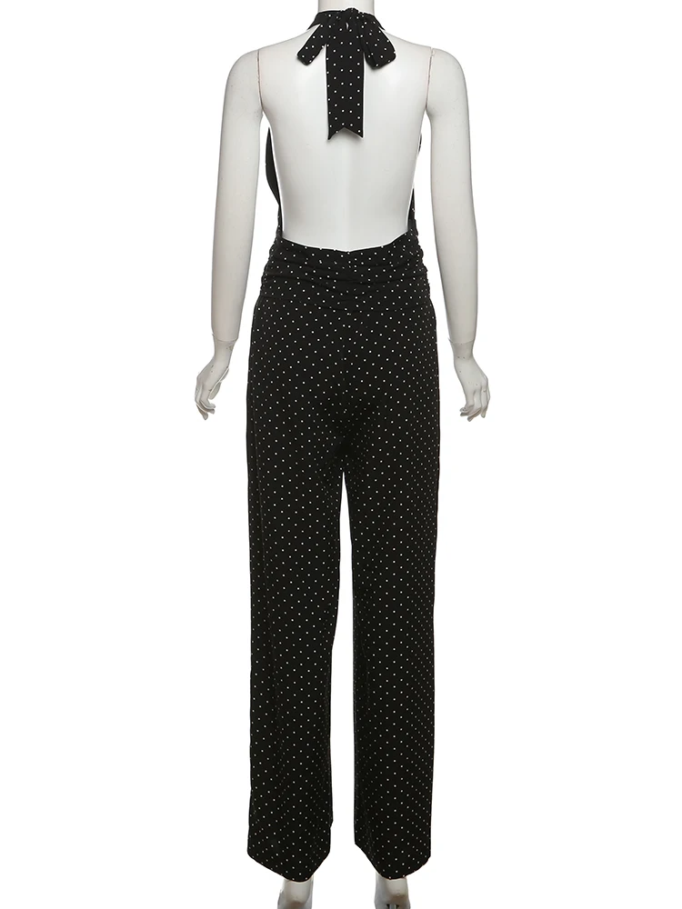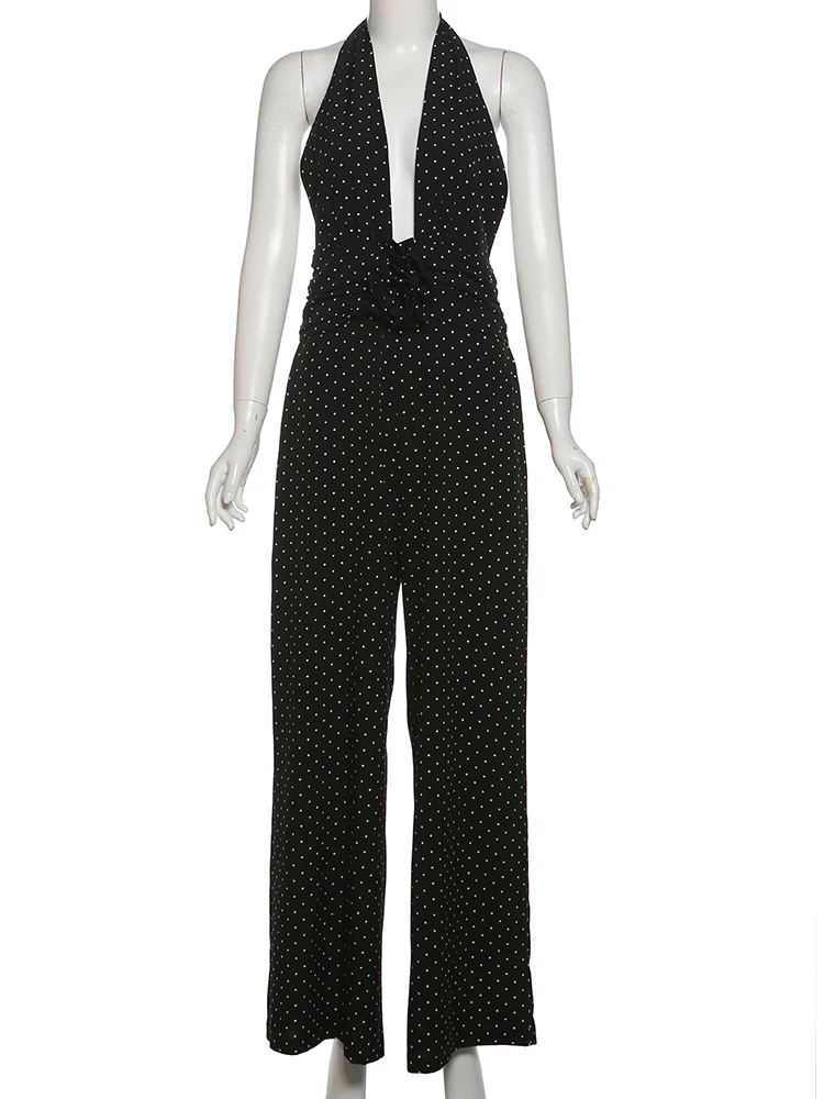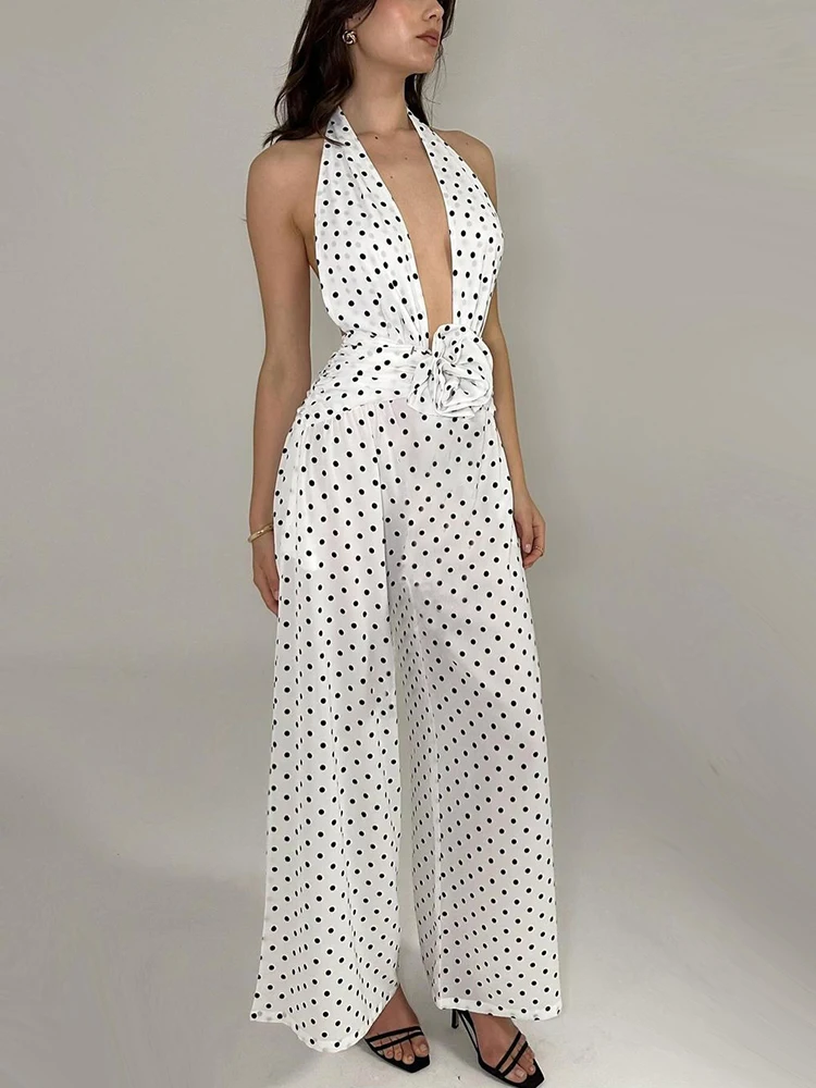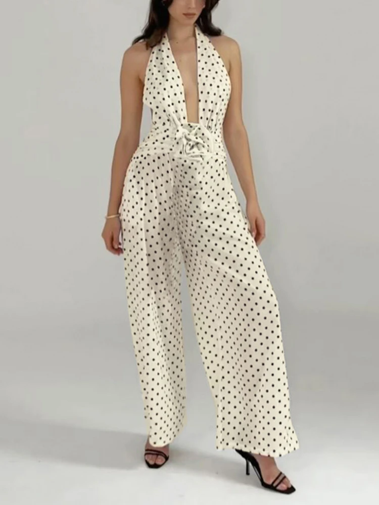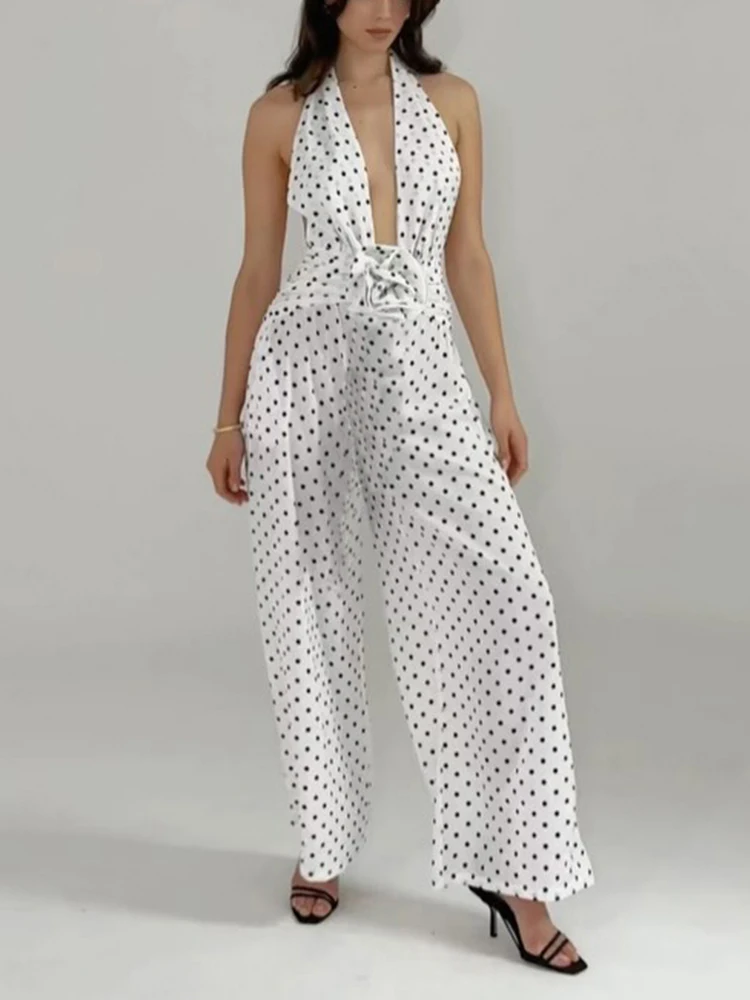 Halter Backless Jumpsuit Women Polka Dot Prin Bandage Sleeveless v-Neck Wide Legs Office Street Skinny Sexy Overalls