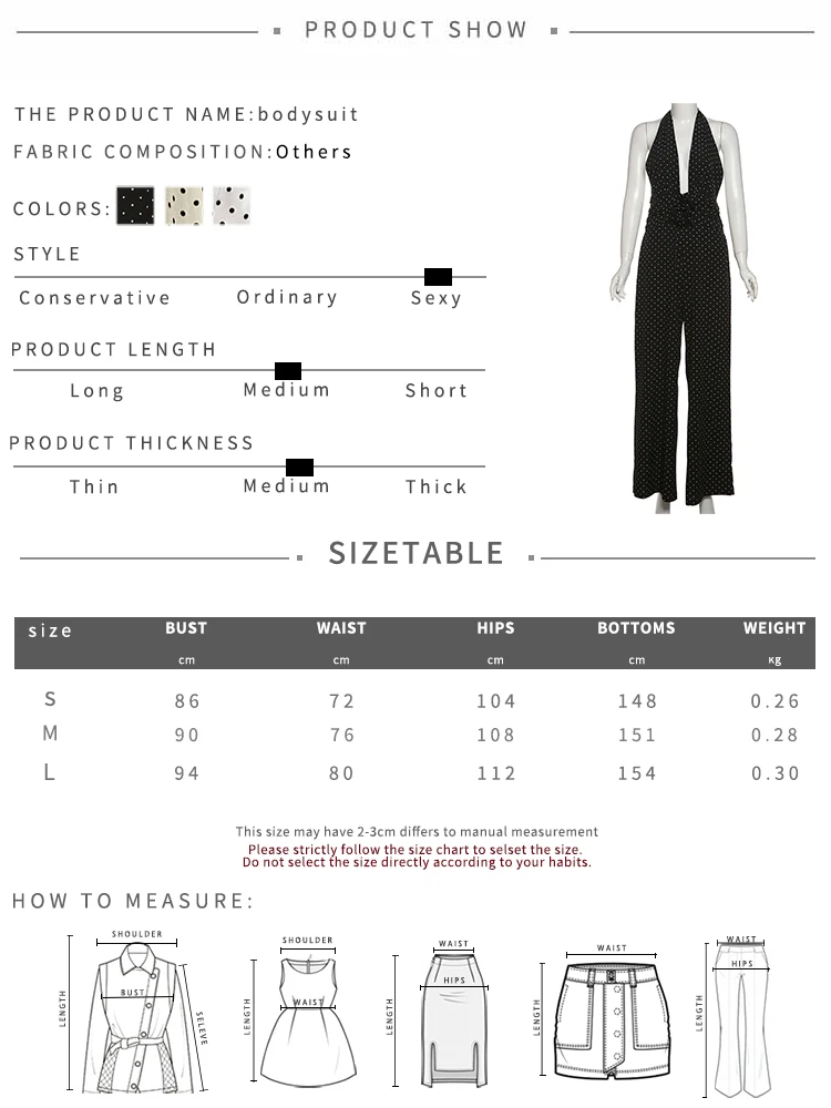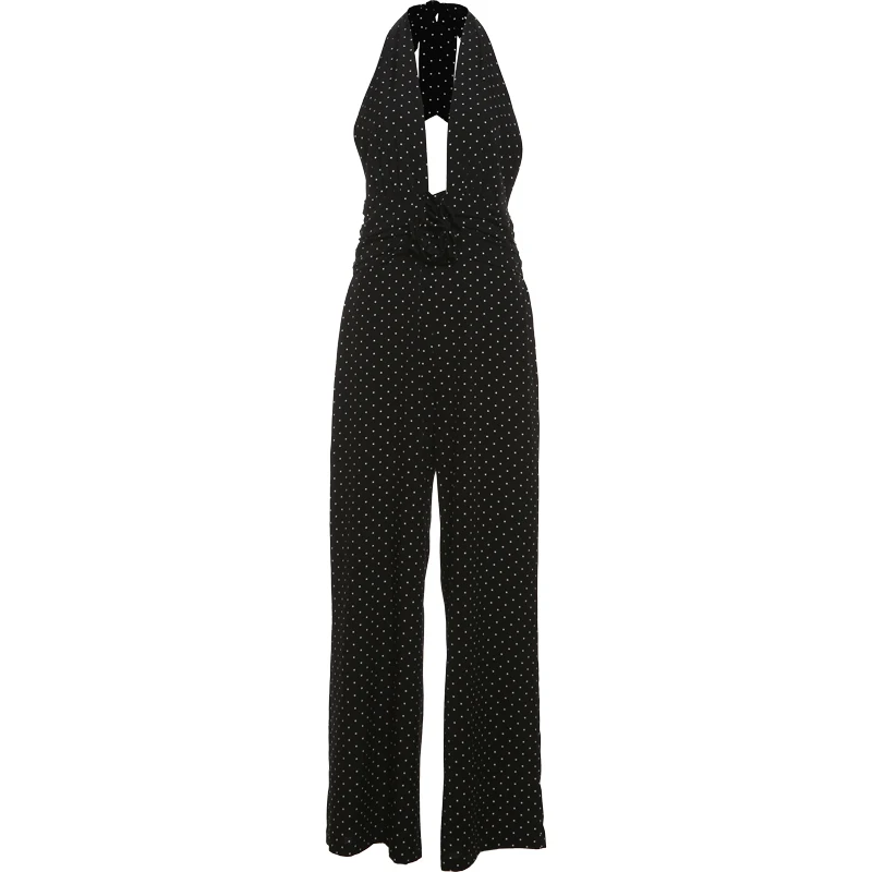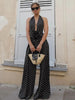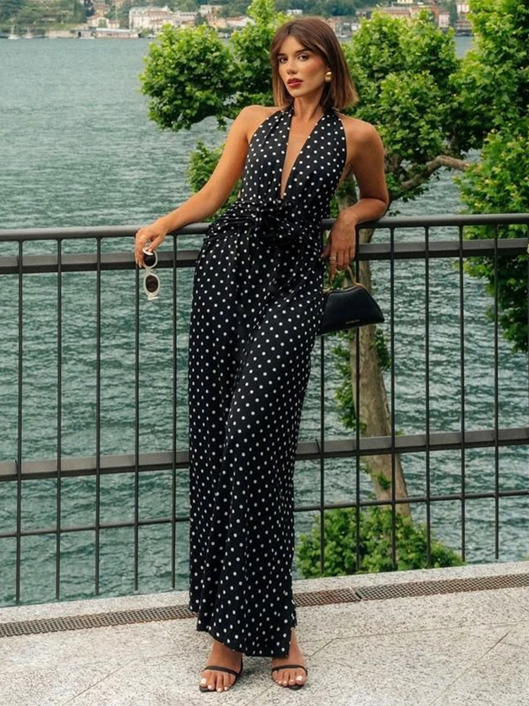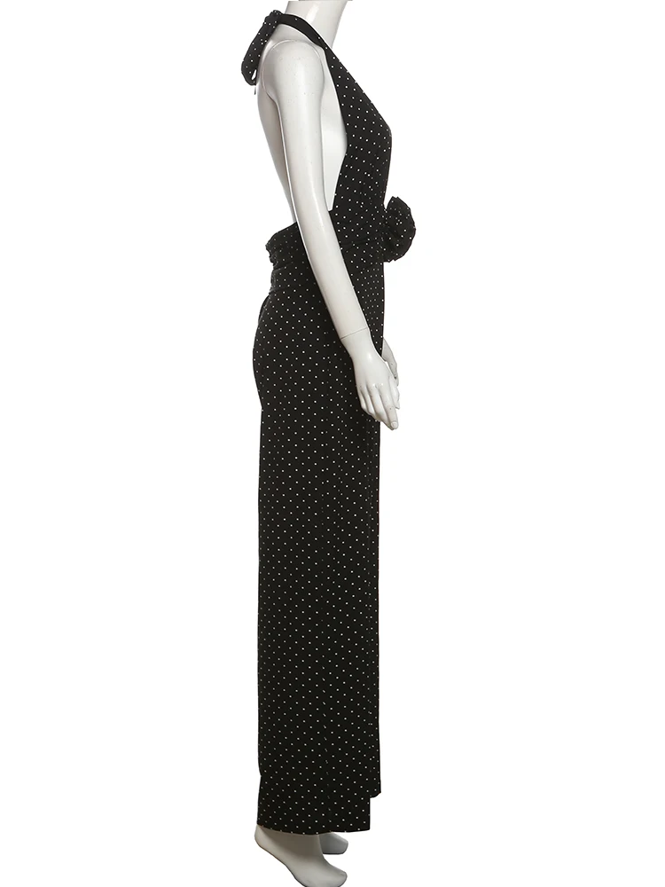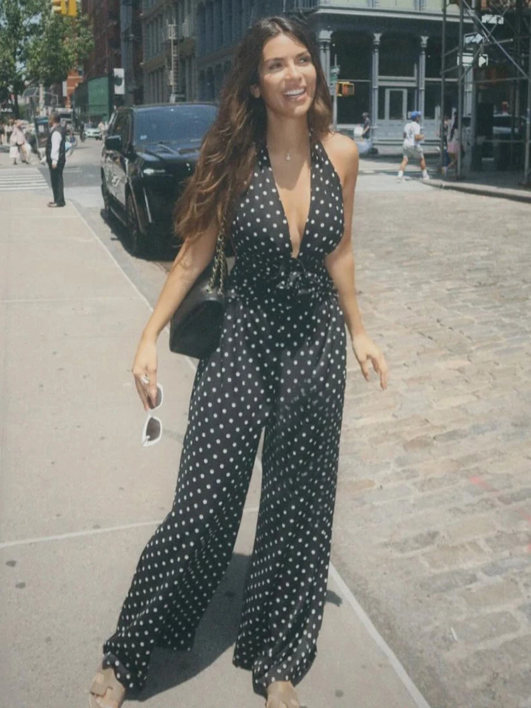 Halter Backless Jumpsuit Women Polka Dot Prin Bandage Sleeveless v-Neck Wide Legs Office Street Skinny Sexy Overalls