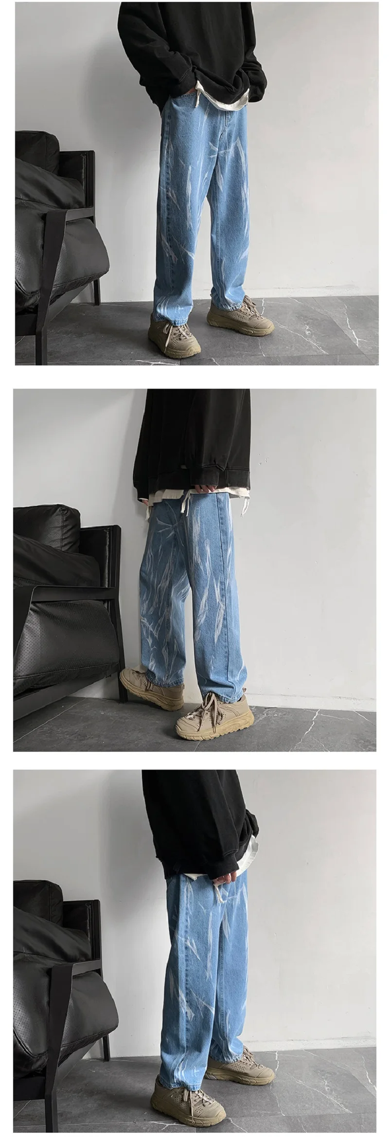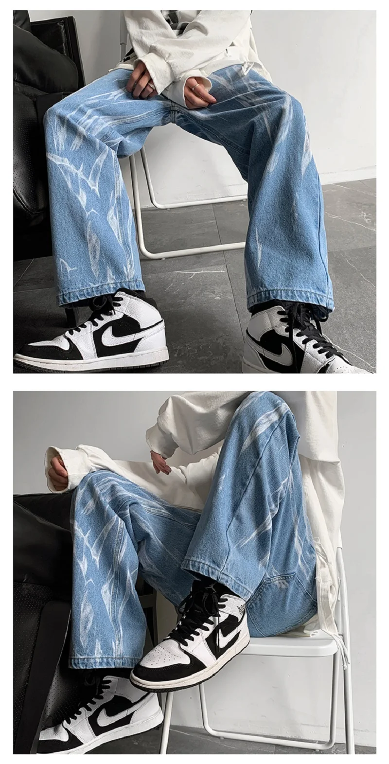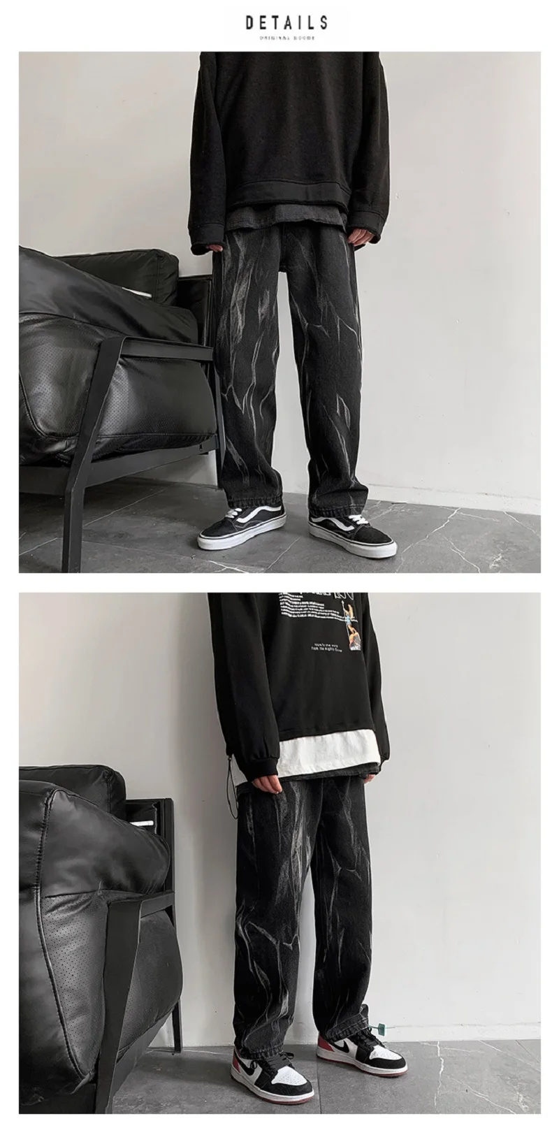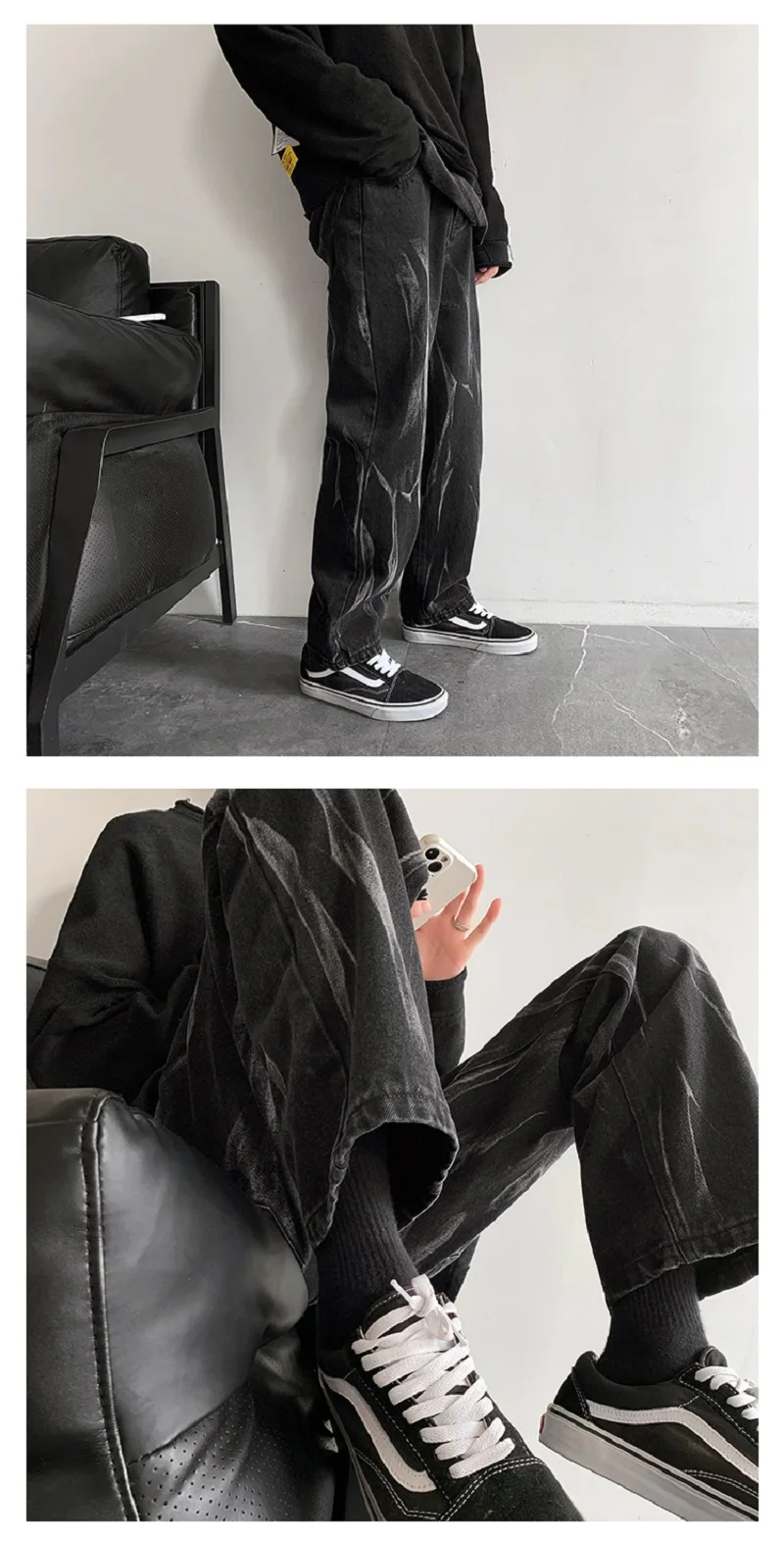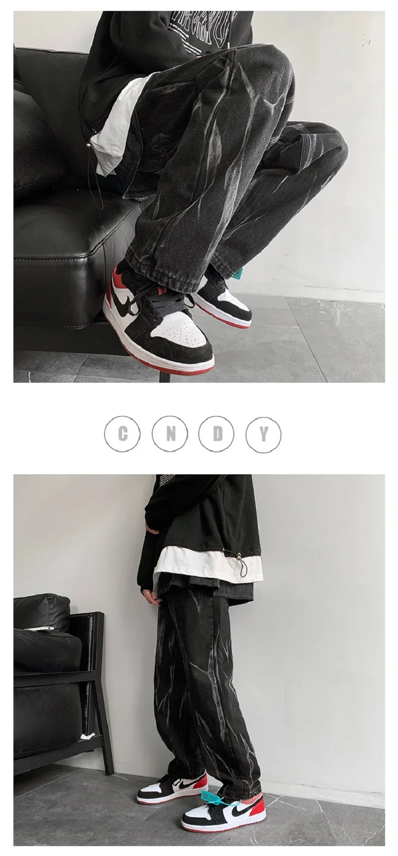 Harajuku Fashion Casual Black Tie-Dye Jeans Men Straight Leg Chic Baggy Handsome American Oversize Pants High Street Ins Trend