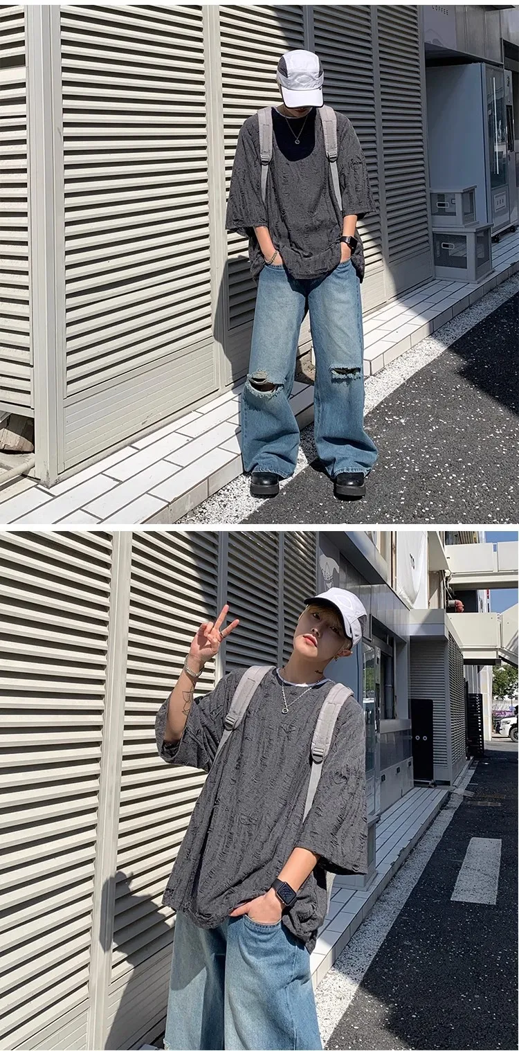 Harajuku T-Shirts Men Ripped Design Chic Korean Style High Street Half Sleeve Summer Fashion Solid Hip Hop Tees All-match Unisex