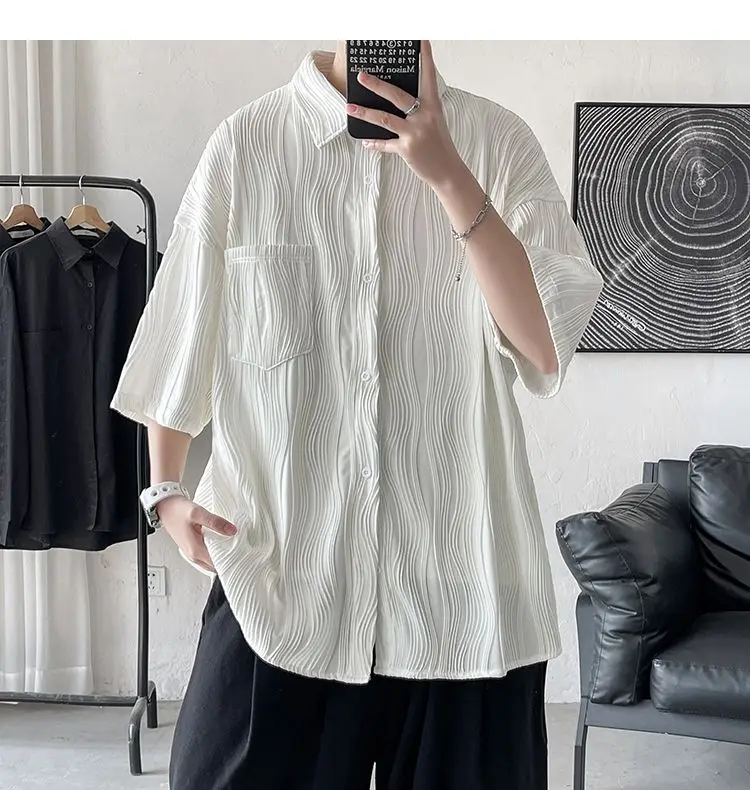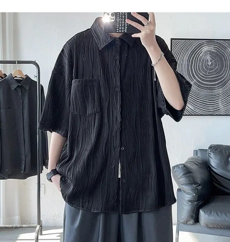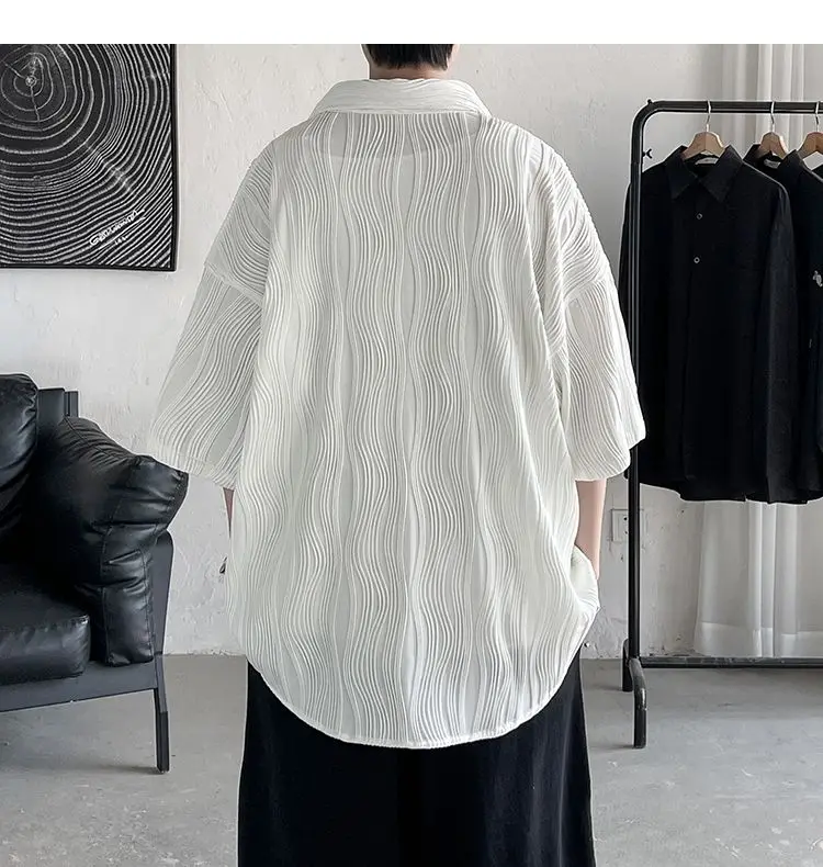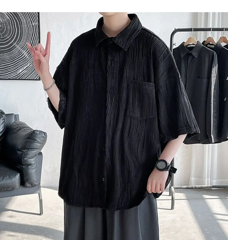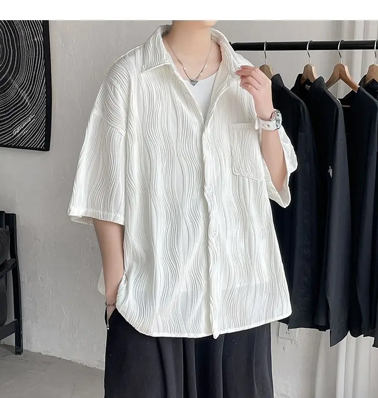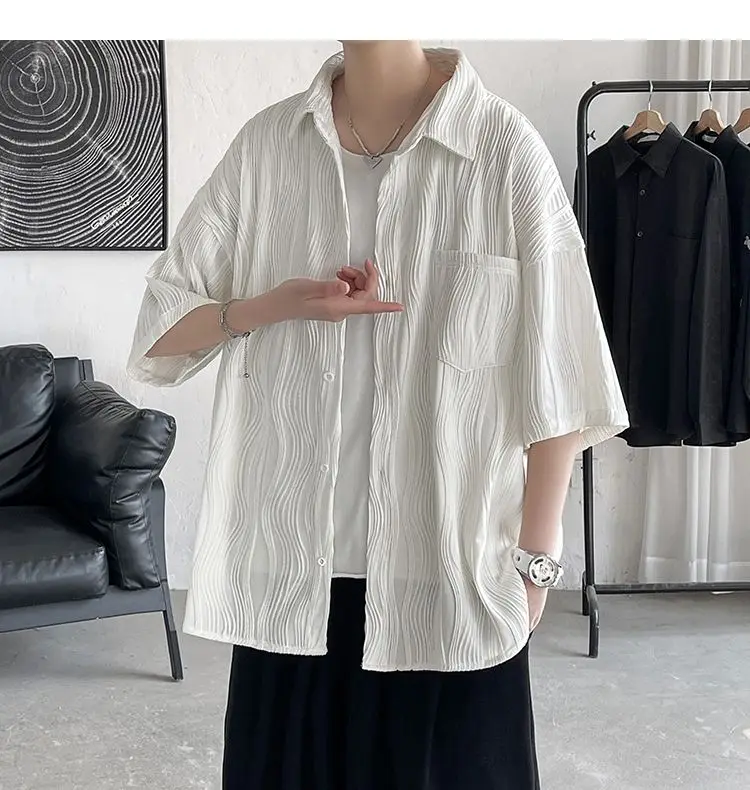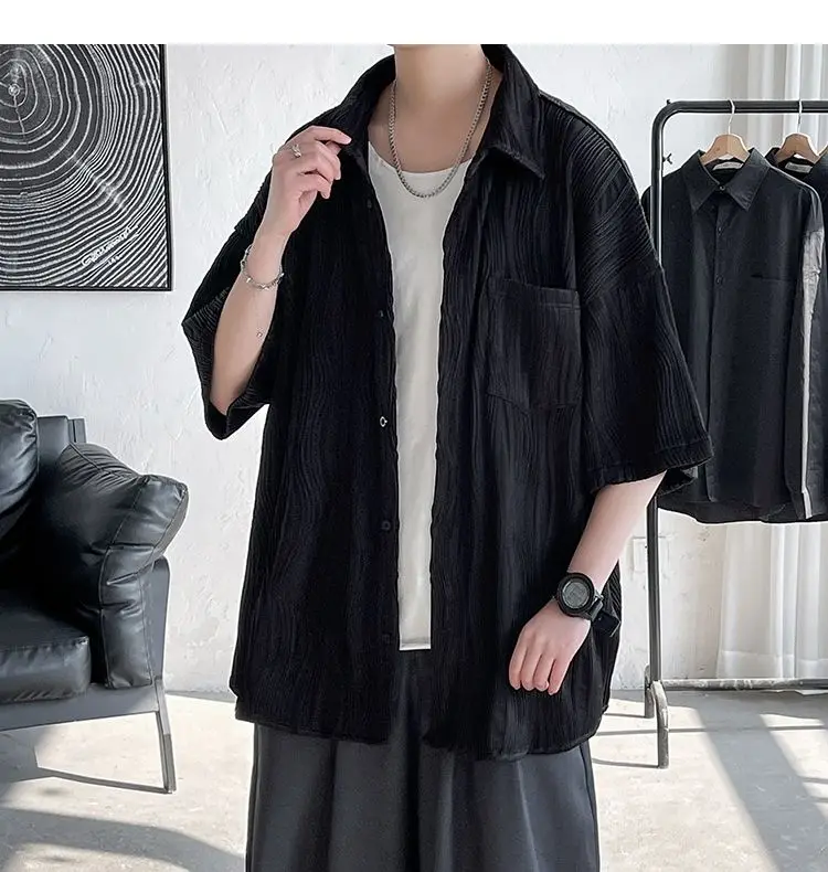 High-end three-quarter sleeve shirt men's short-sleeved summer thin fashion brand ins handsome ice silk shirt casual large size