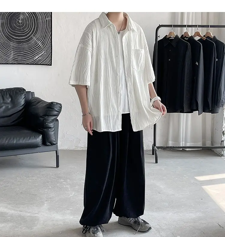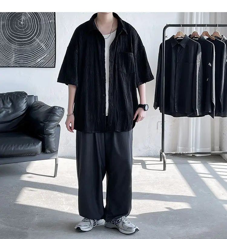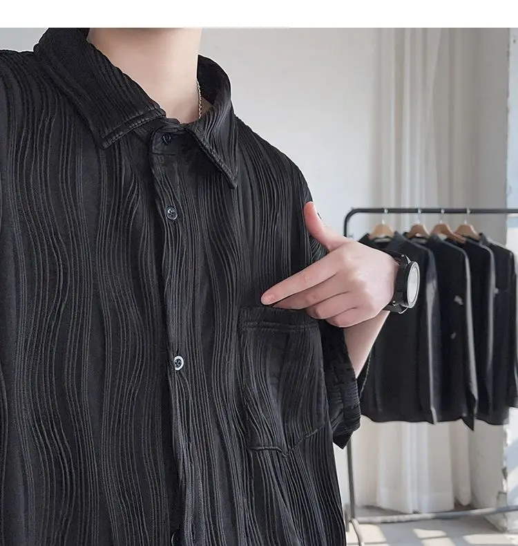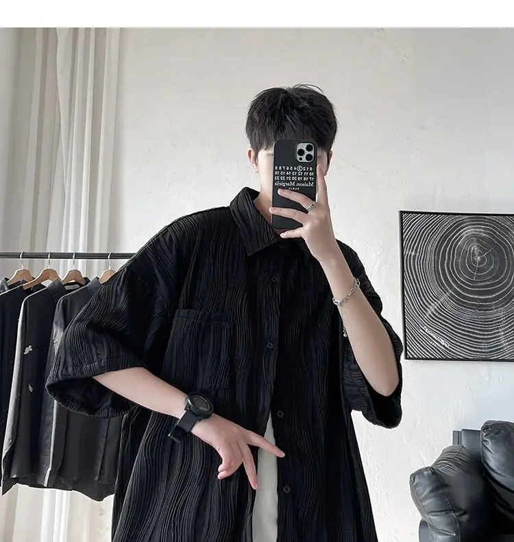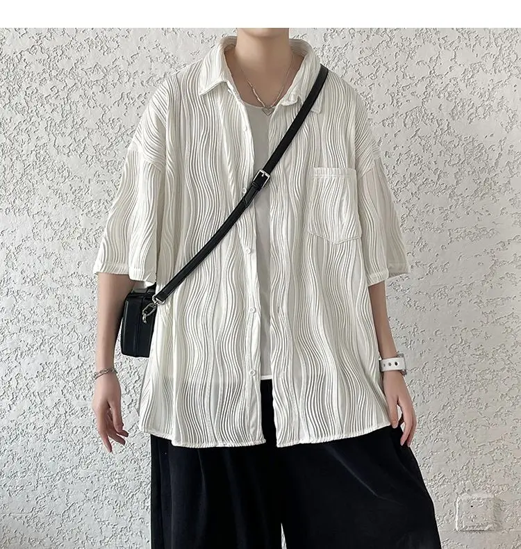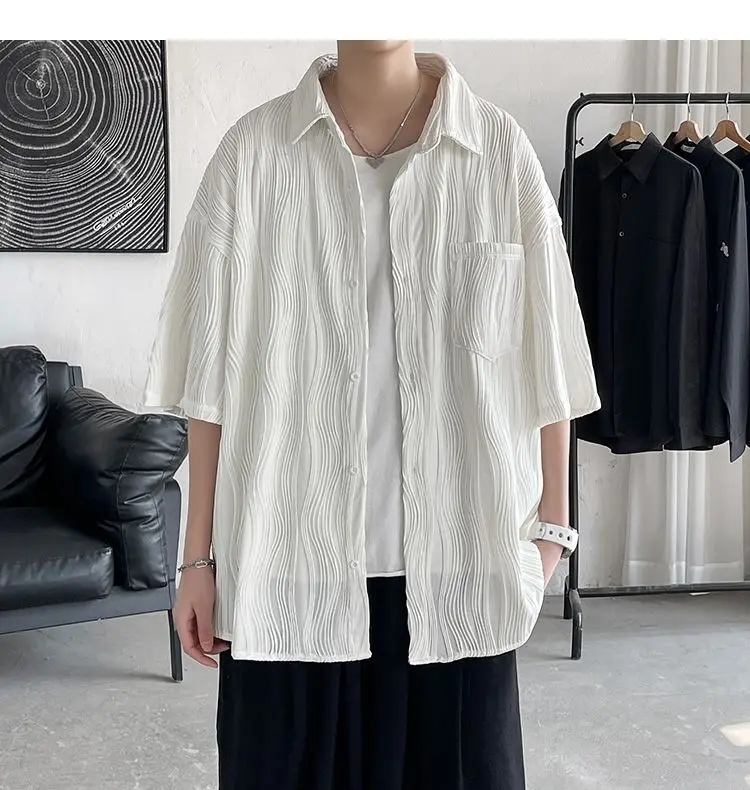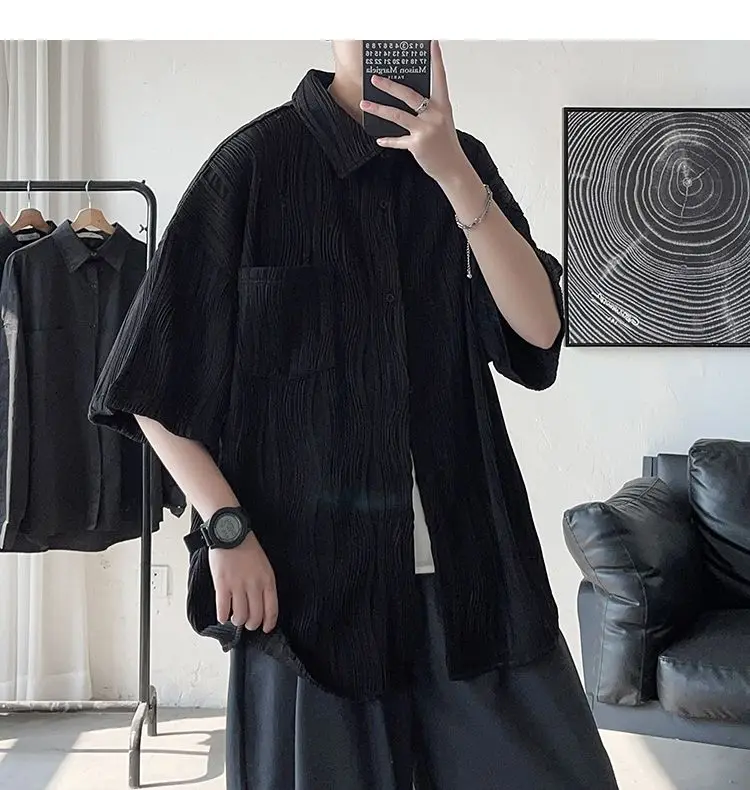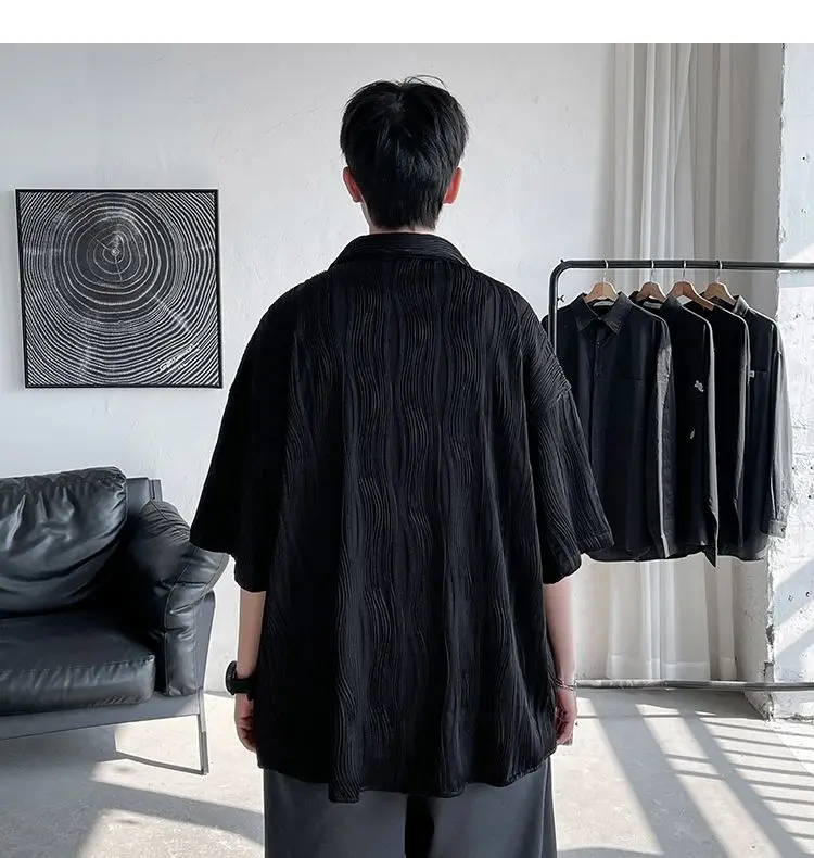 High-end three-quarter sleeve shirt men's short-sleeved summer thin fashion brand ins handsome ice silk shirt casual large size