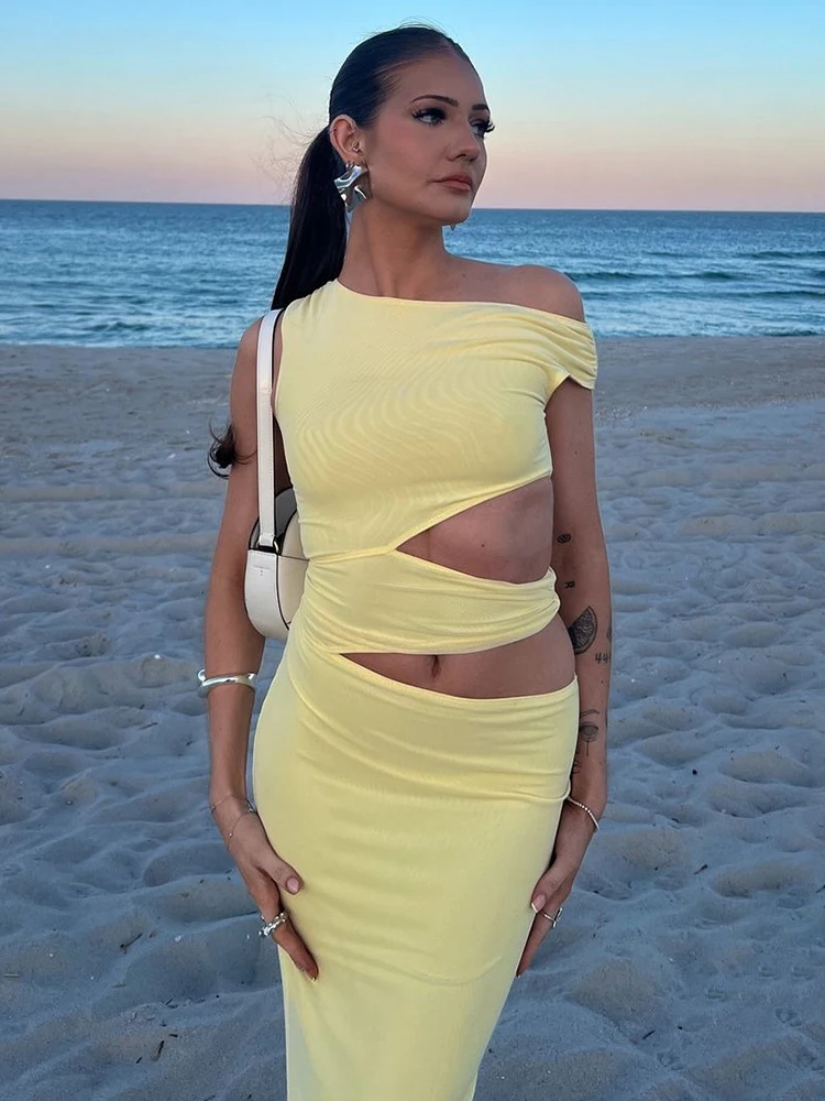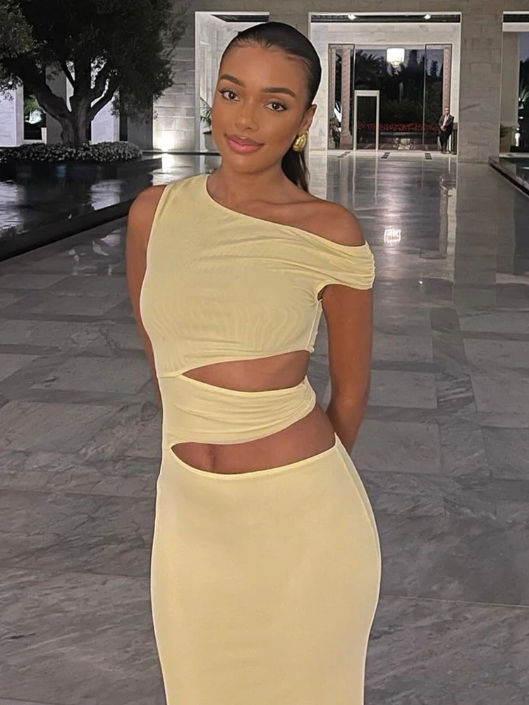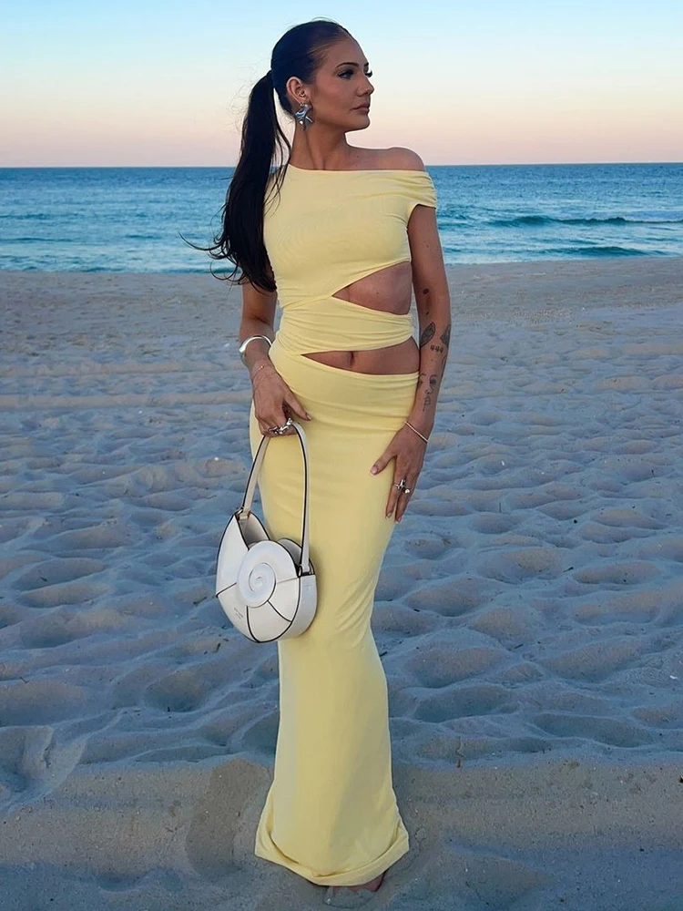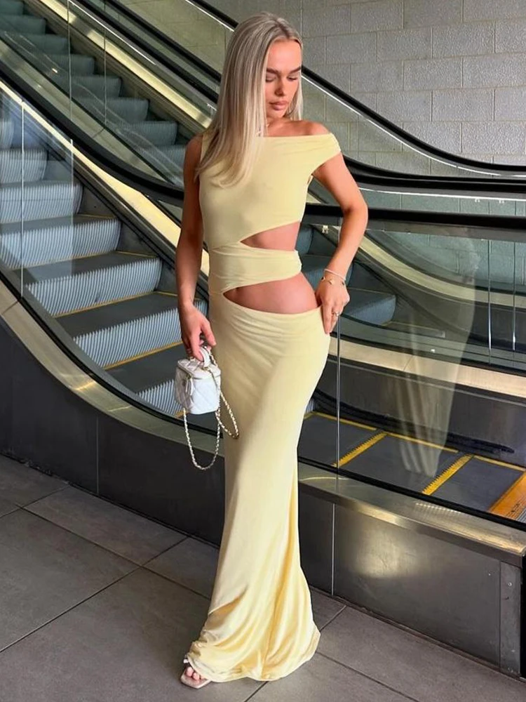 Hollow Sexy Maxi Dress Women Irregular Skinng Ruched Diagonal Collar Sleeveless Vacation Beach Party Fashion Vestidos