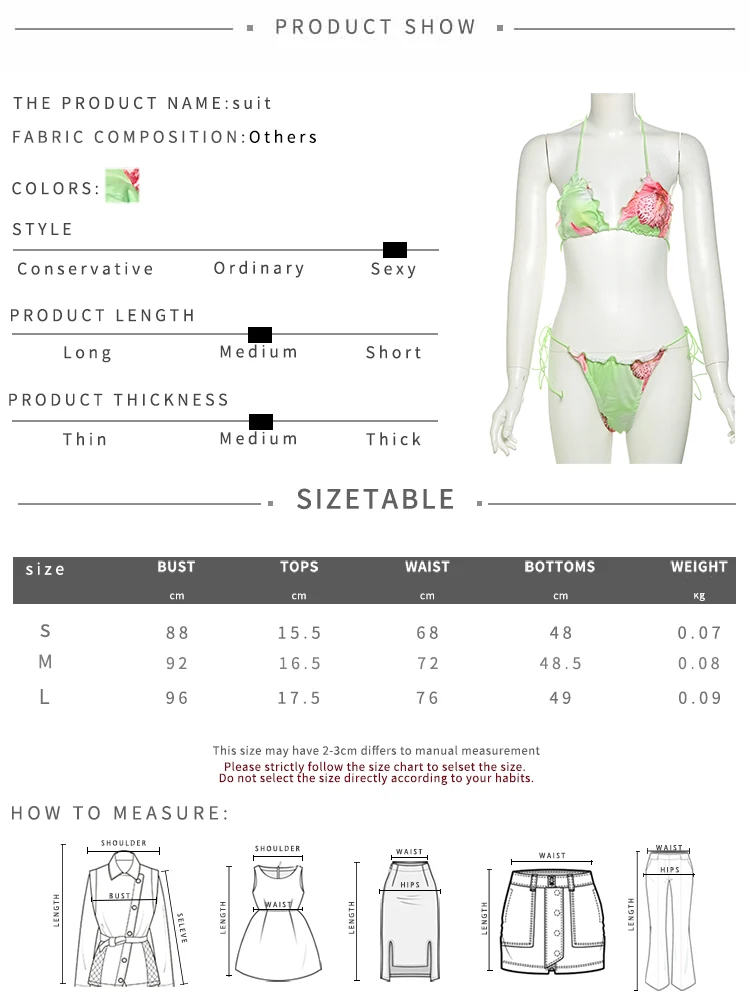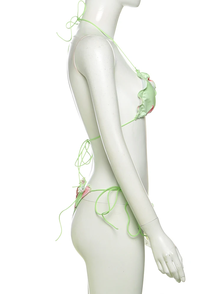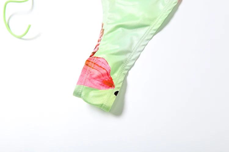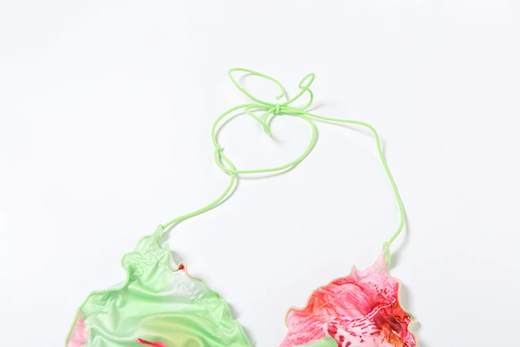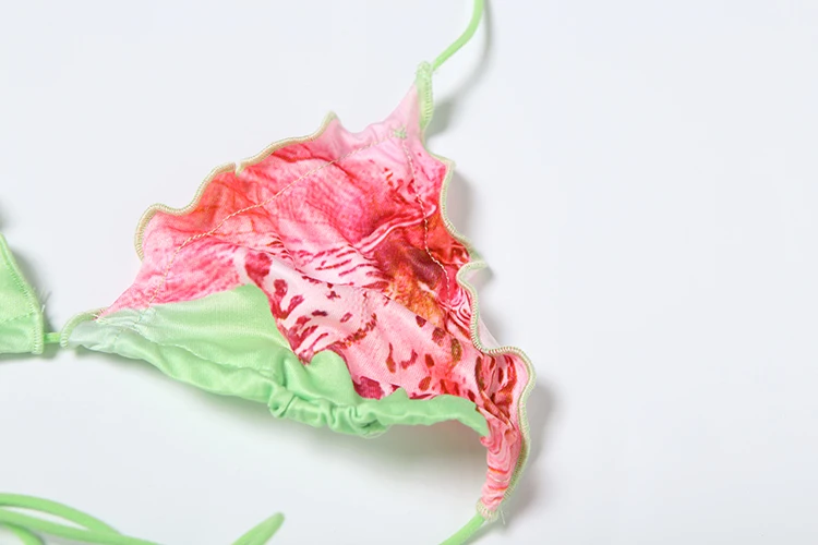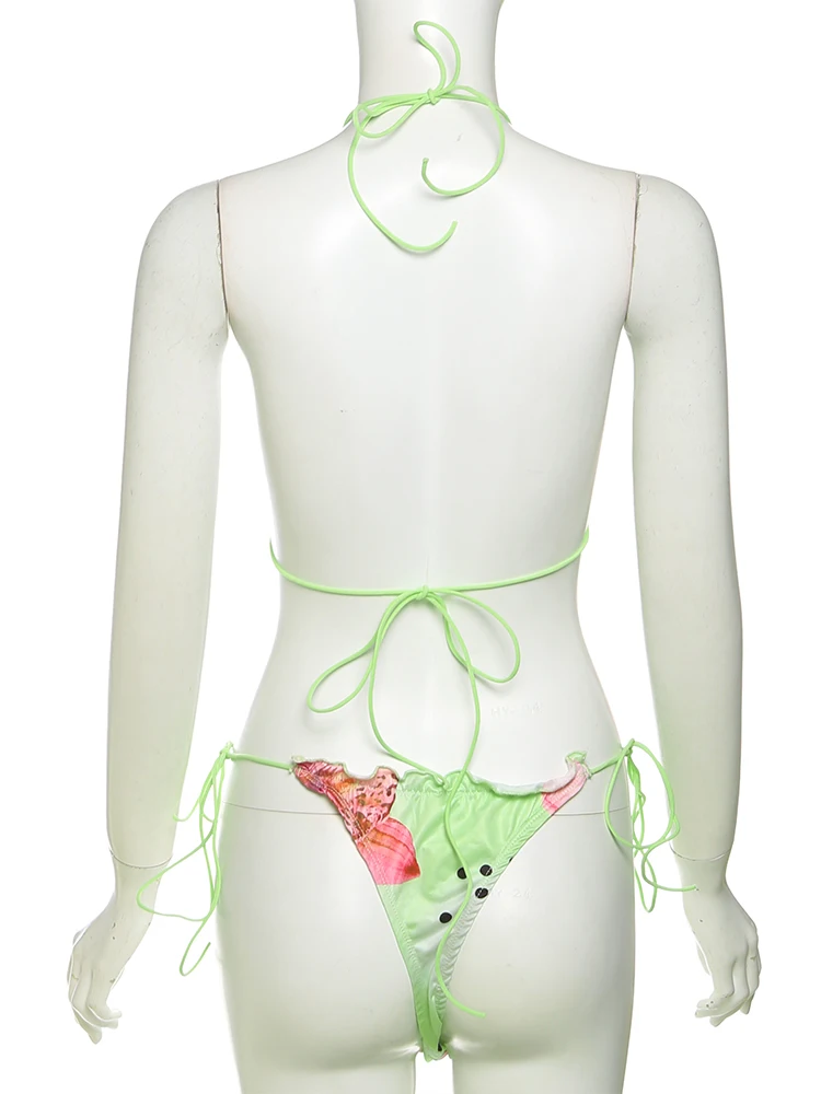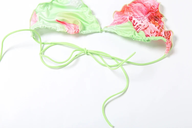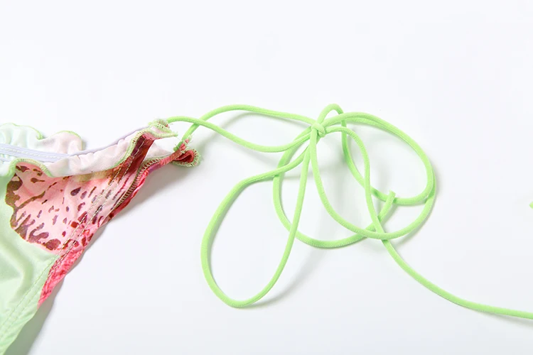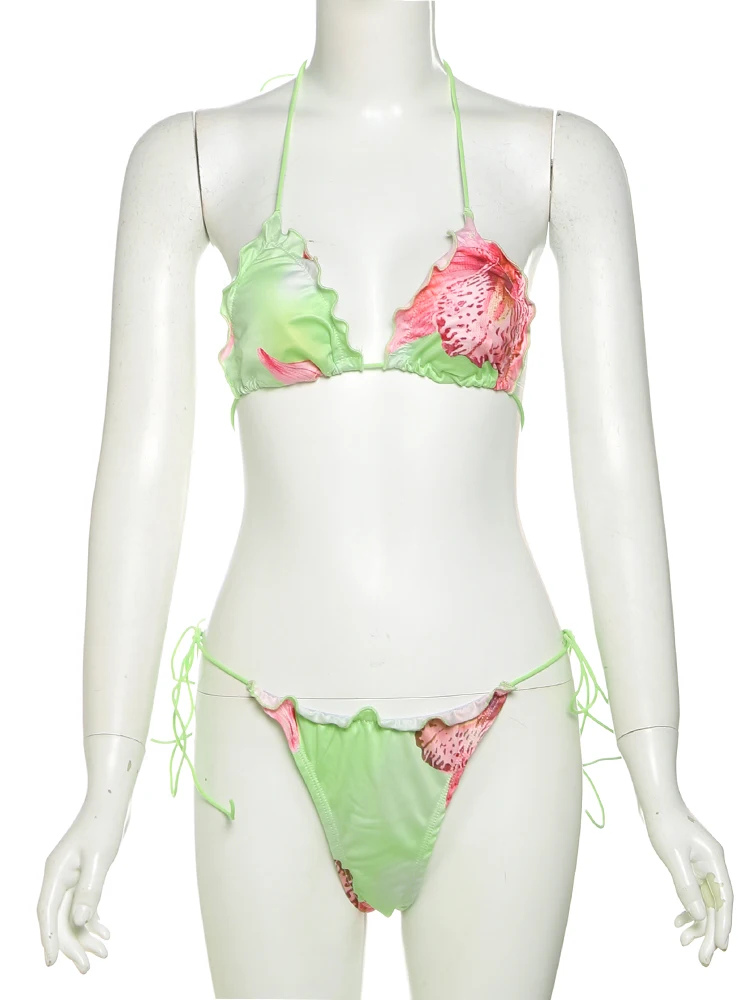Lace Colorful Flower Print Bikini Shirring 2 Piece Set Women Halter Bra Tops+Skinny Briefs Vacation Beach Style Outfits