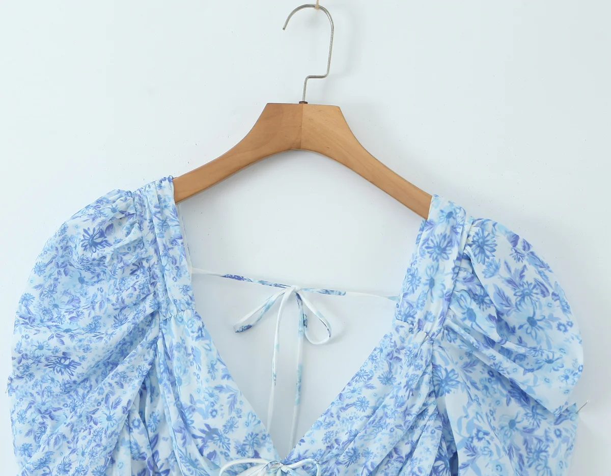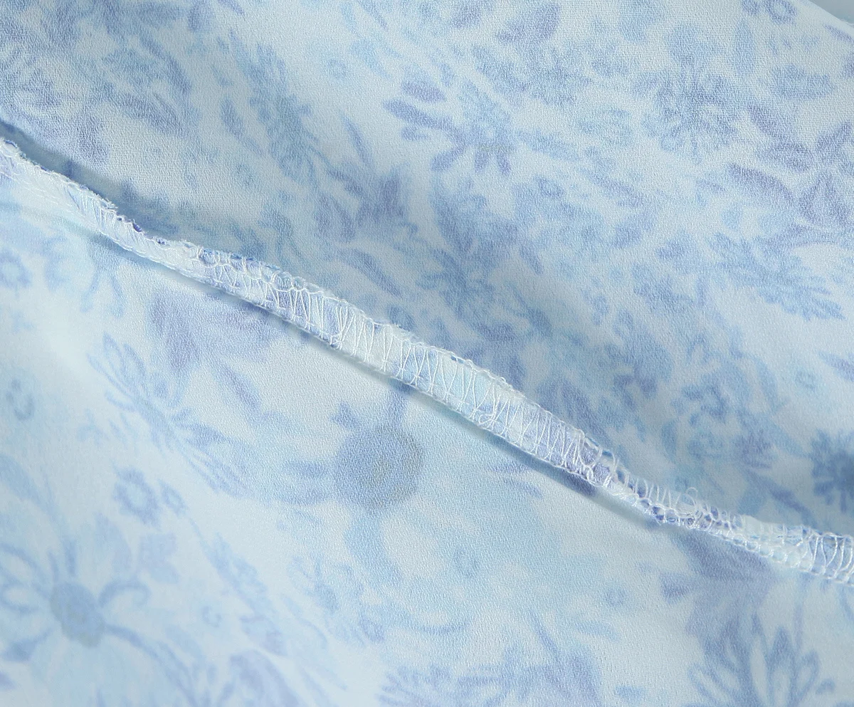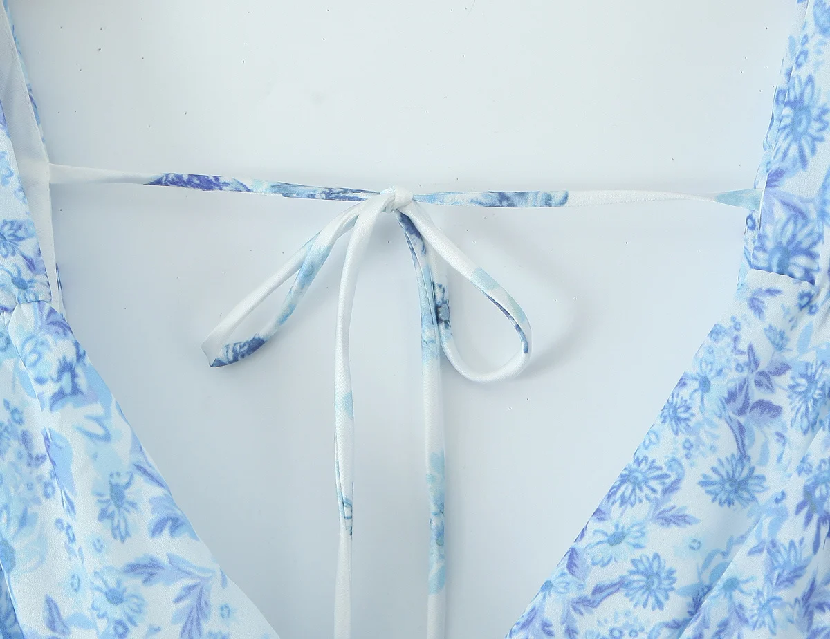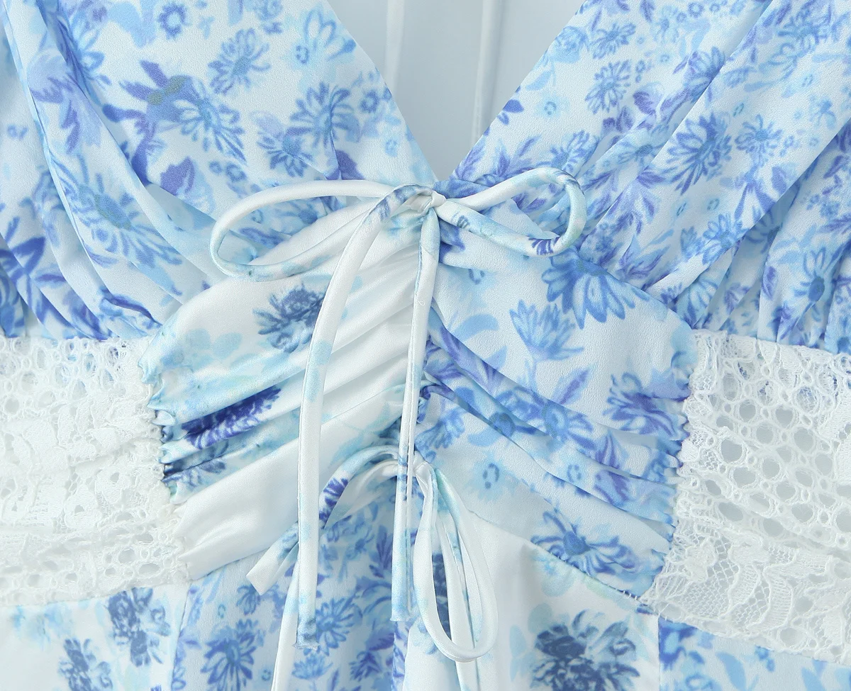 2025 Lace Spliced Blue Floral Print Summer Dress Women Sexy Backless V Neck A-line