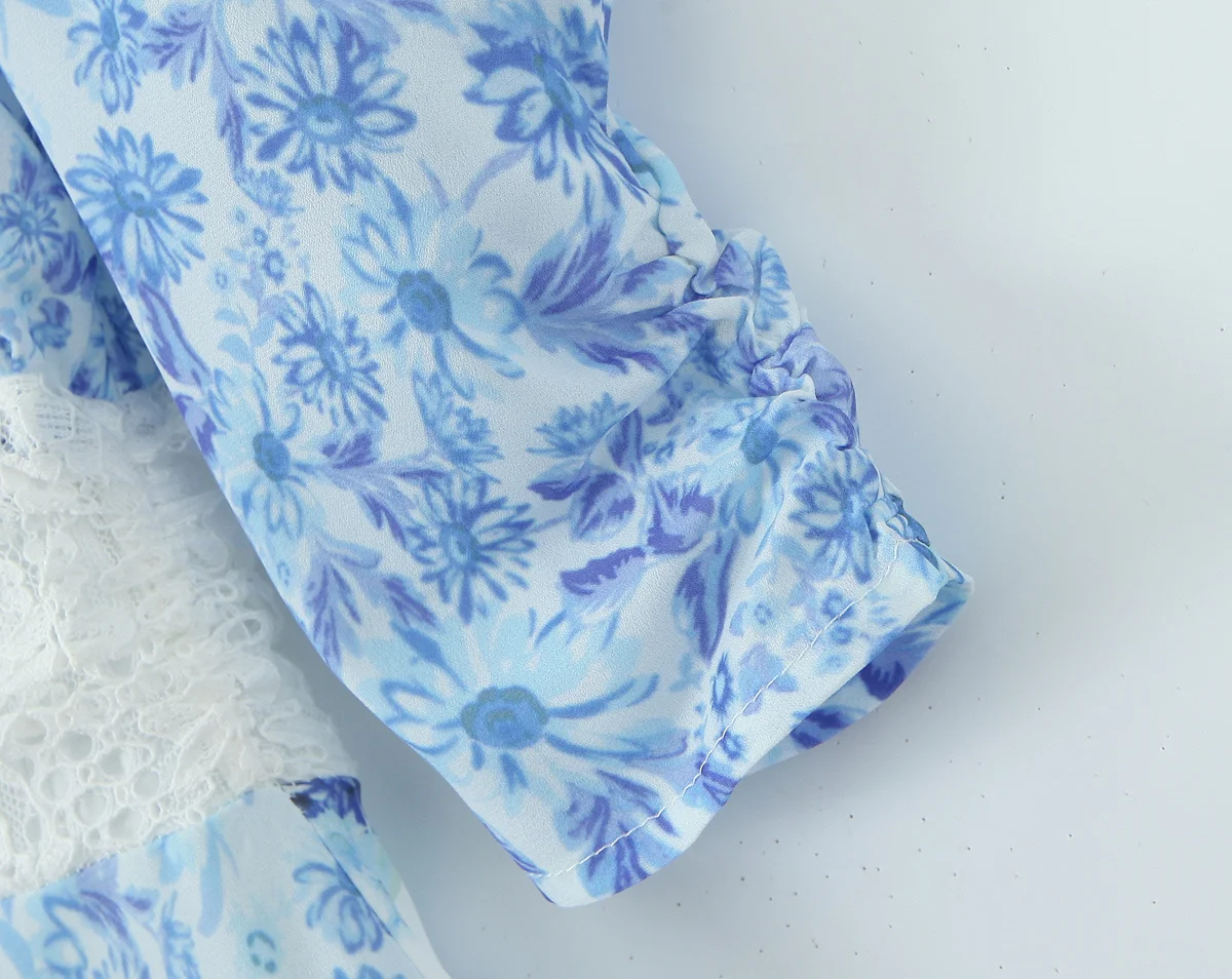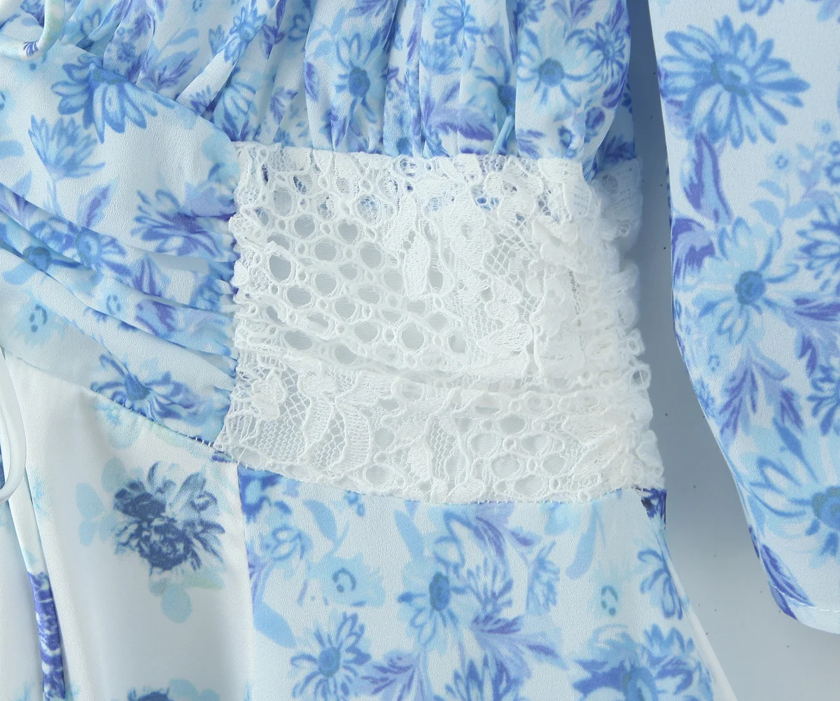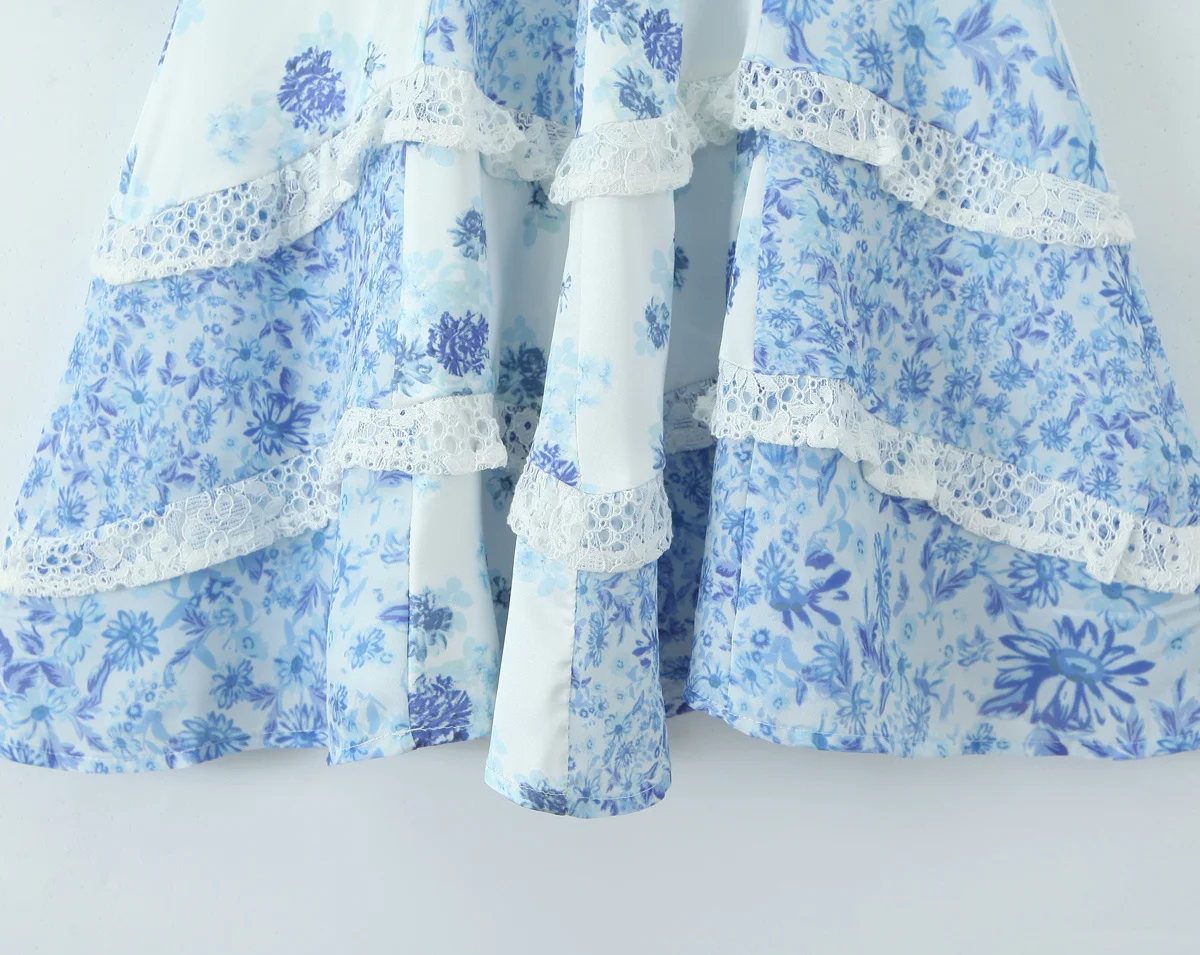 2025 Lace Spliced Blue Floral Print Summer Dress