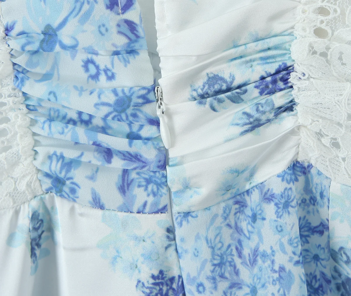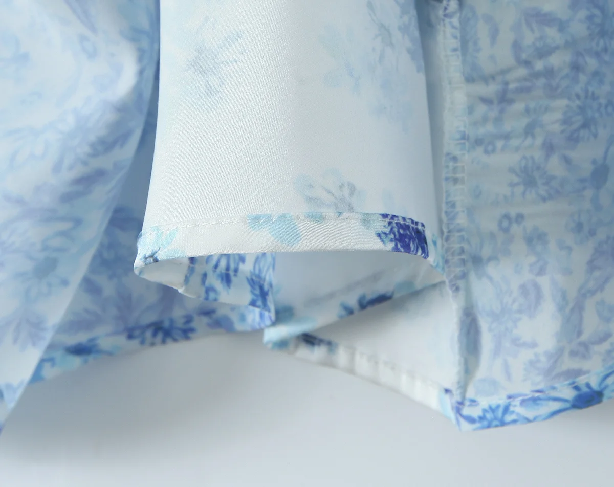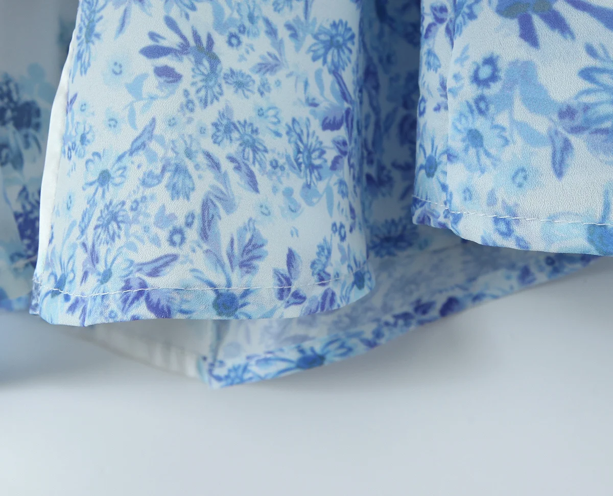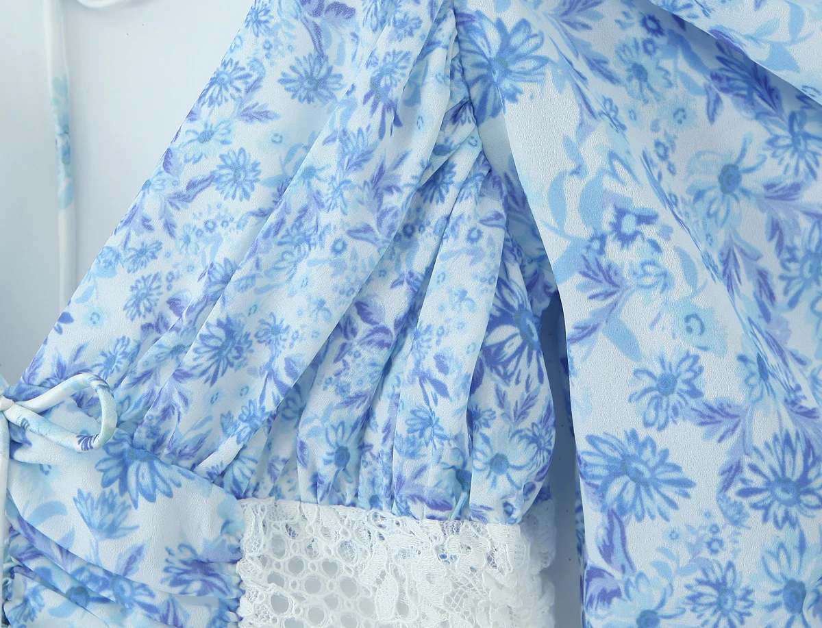 2025 Lace Spliced Blue Floral Print Summer Dress
