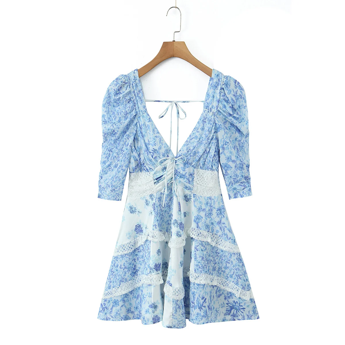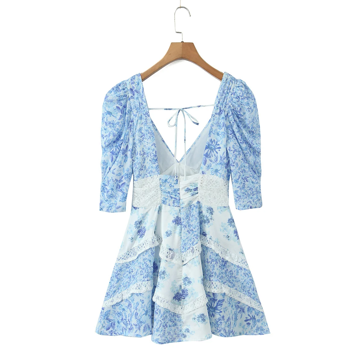 Lace Spliced Blue Floral Print Summer Dress Women Sexy Backless V Neck A-line Mini Dresses Holiday Vestido Boho Robe