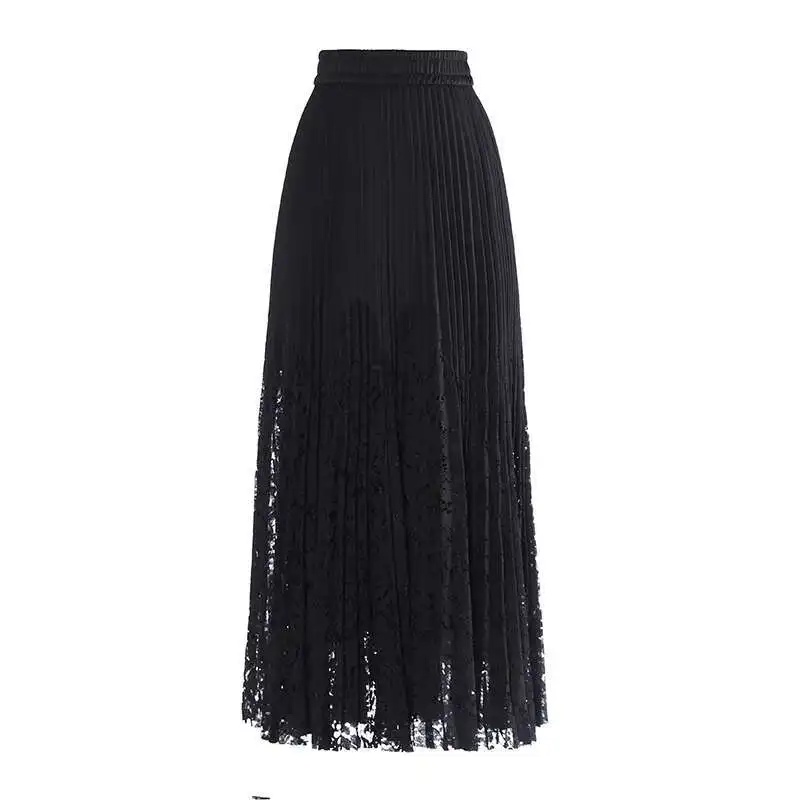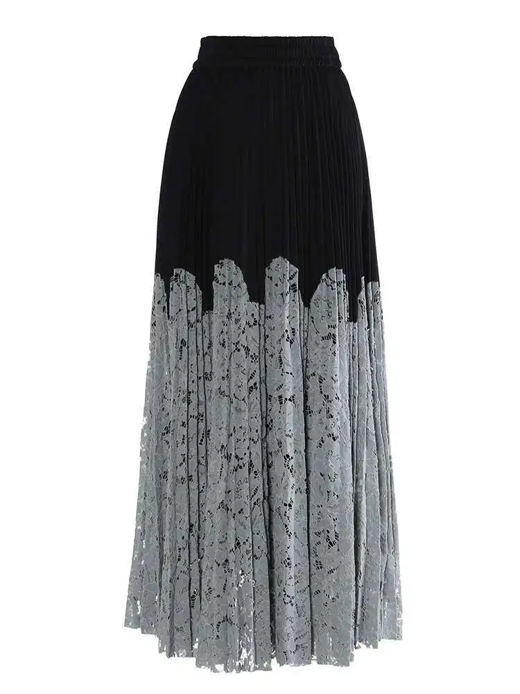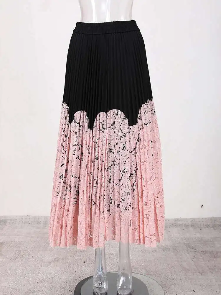 Lace Spliced Printing Pleated Skirts For Women High Waist Loose Causal Colorblock Skirt Female Fashion New Clothes