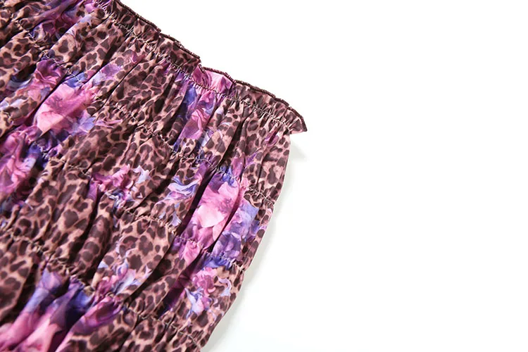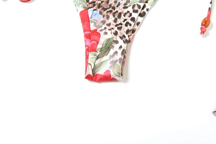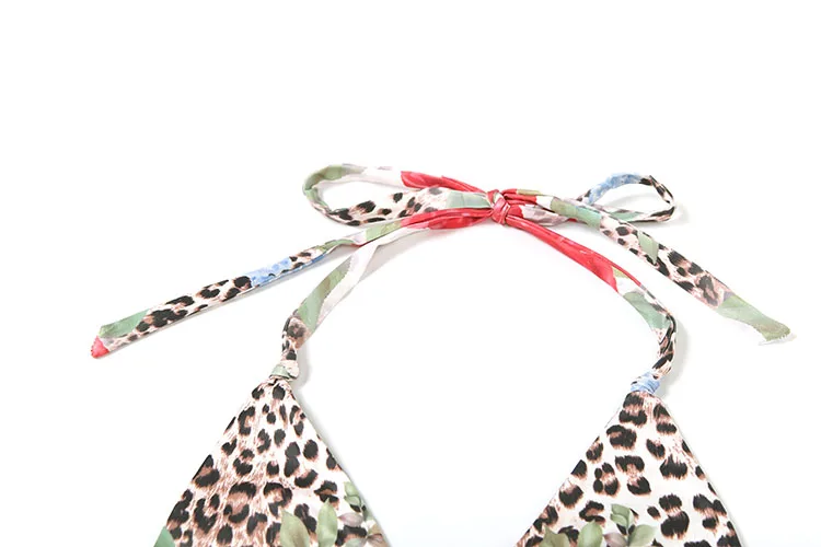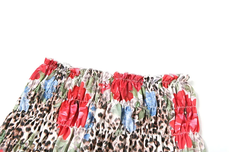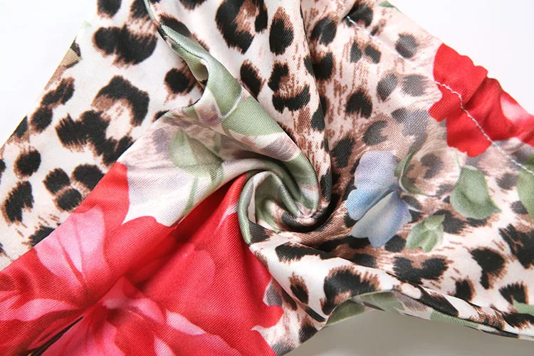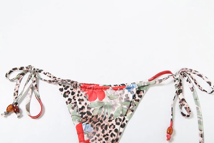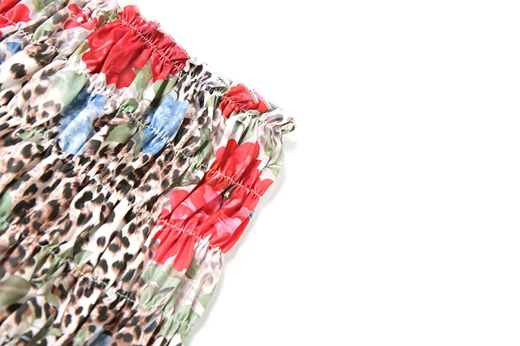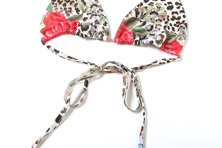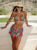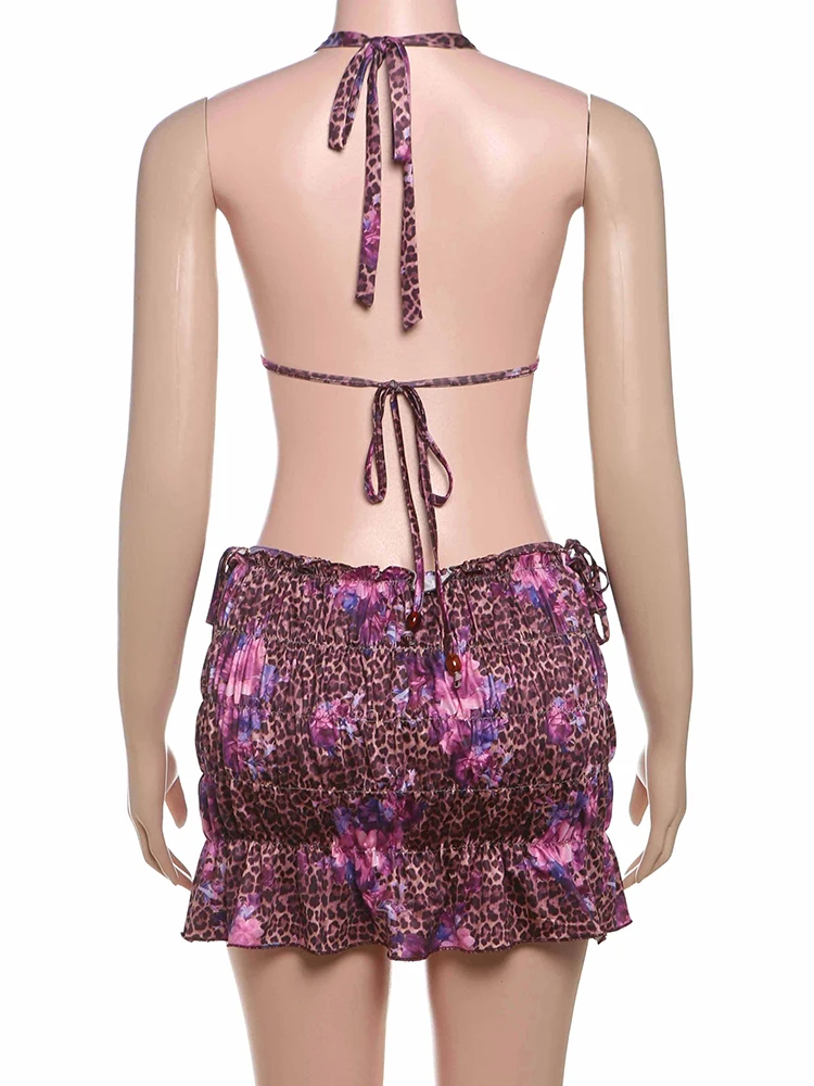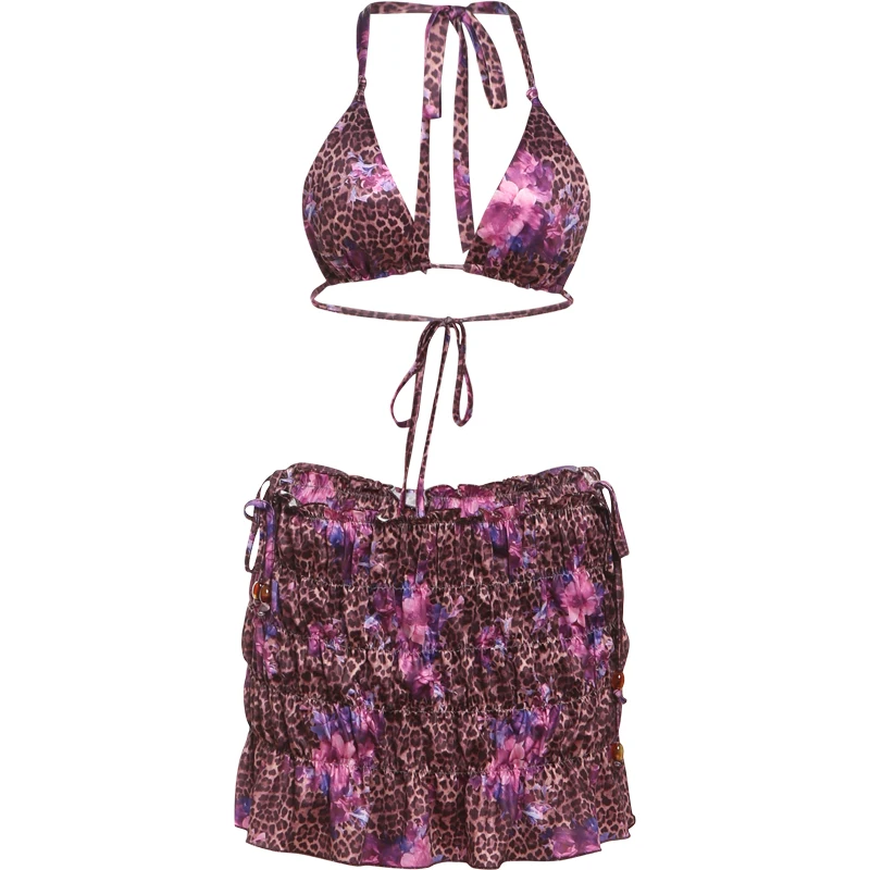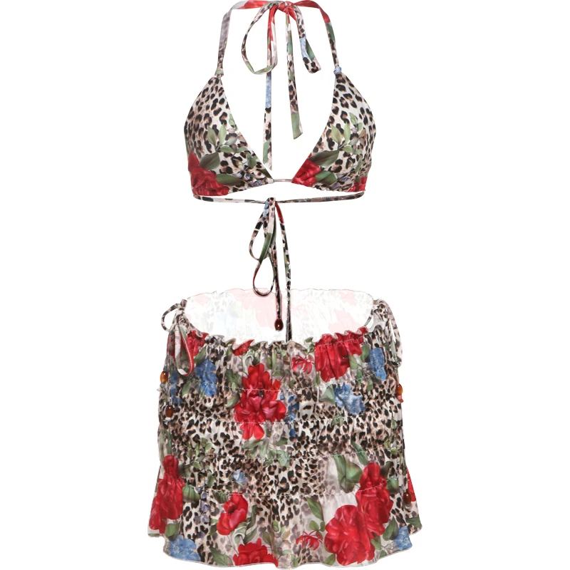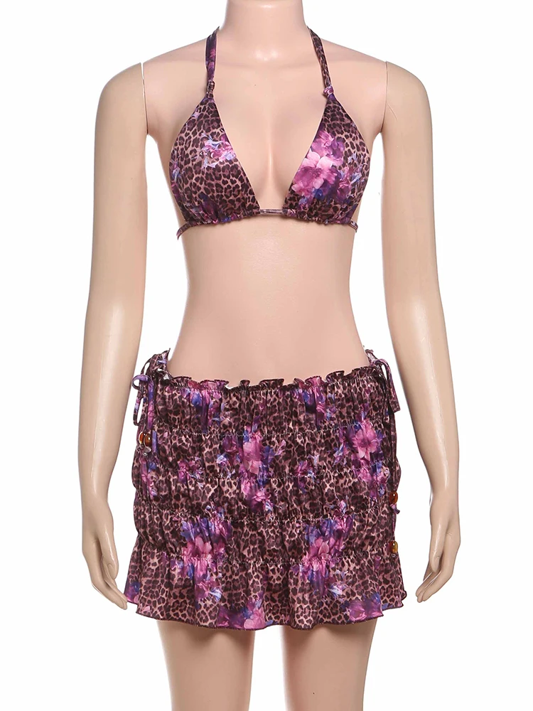 Leopard Flower Print 3 Piece Set Women Halter Bra+Strap Shorts+Ruched Skirts Vacation Trend Beach Party Bikini Suits