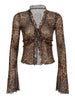 Leopard Print Lace-Up Blouse Shirts Women Semi-Sheer Mesh Elegant Fashion Sexy Flared Sleeve Ruffled Cardigan Tops