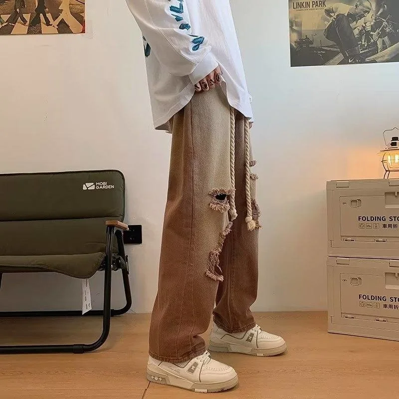 Loose Spring Casual Worn Out Hemp Rope Jeans For Men High Street Fashion Design Straight Denim Pants Male Casual Trousers voguable