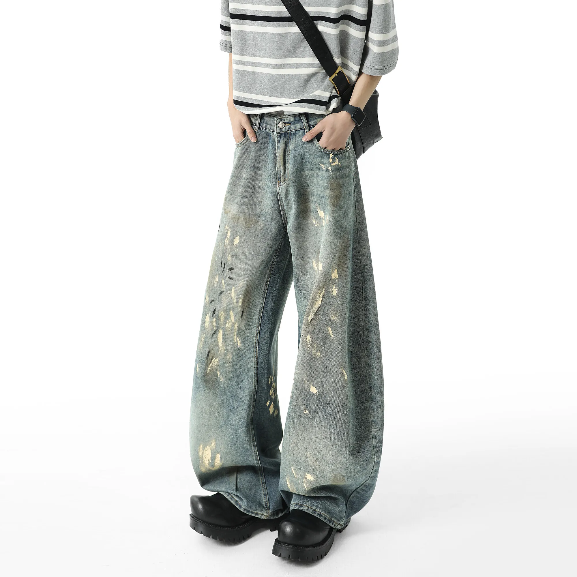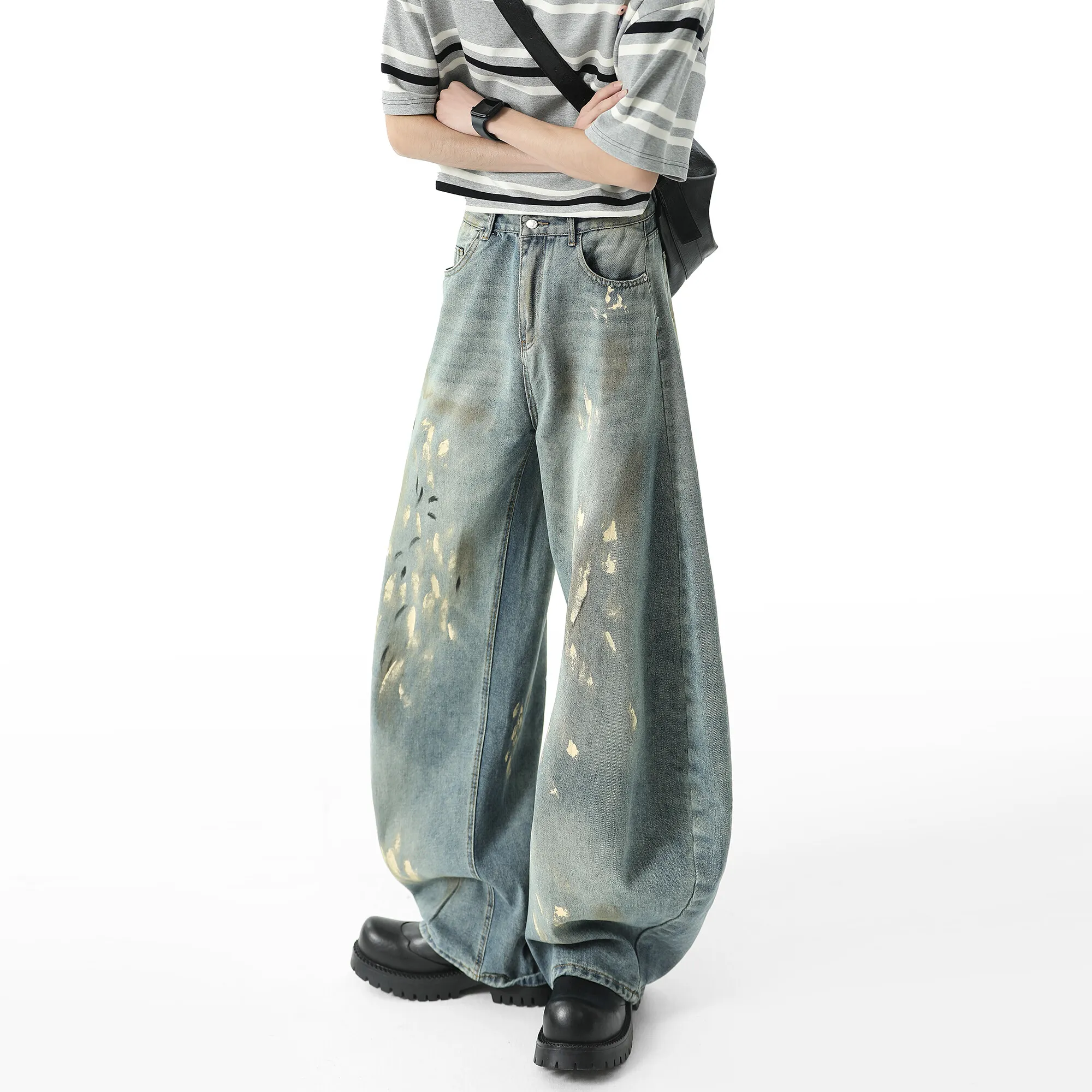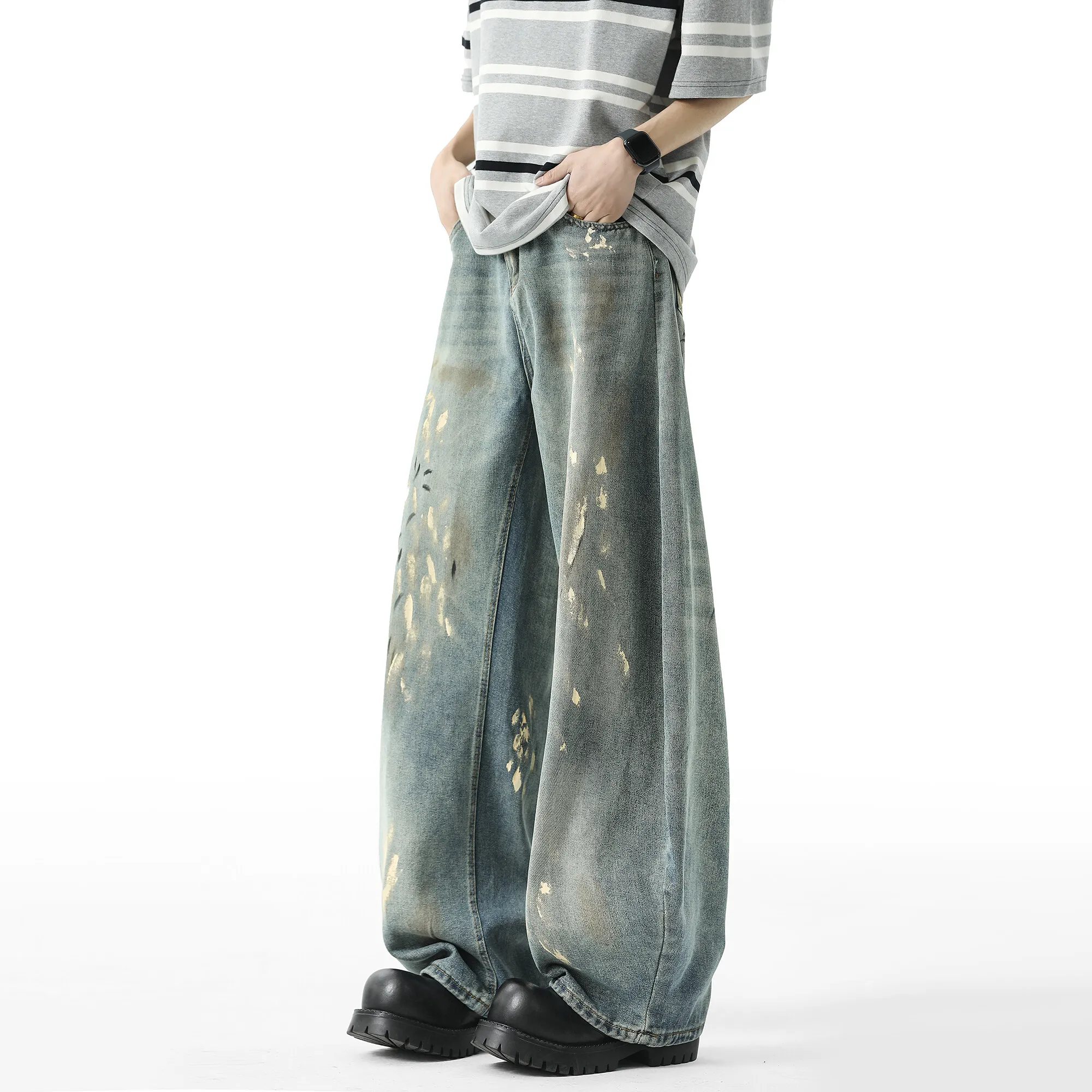 Men Blue Washed Denim Jeans Loose Fit Wide Leg Baggy Streetwear Casual Trousers Hip Hop Graffiti Design Fashion Stretch Comfort