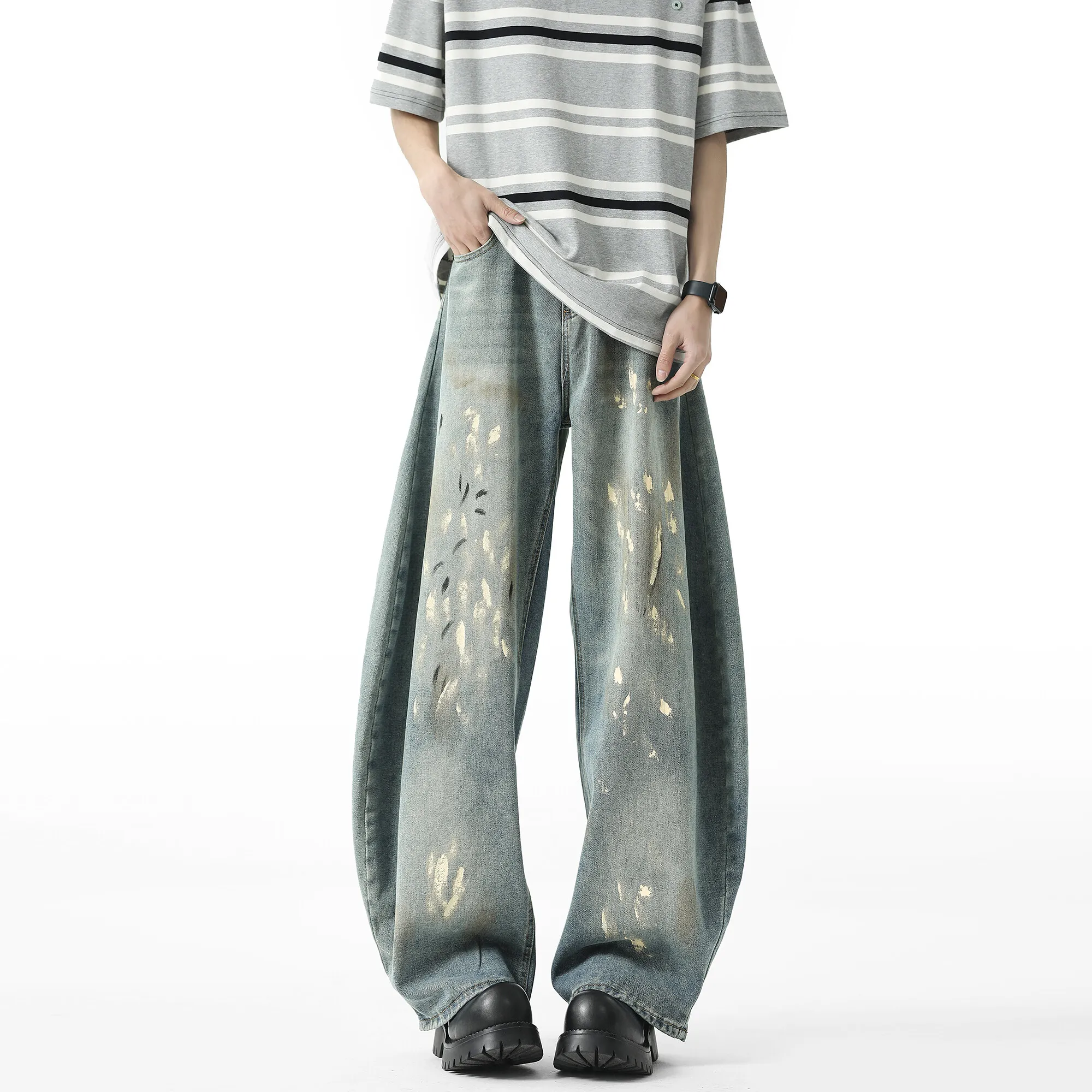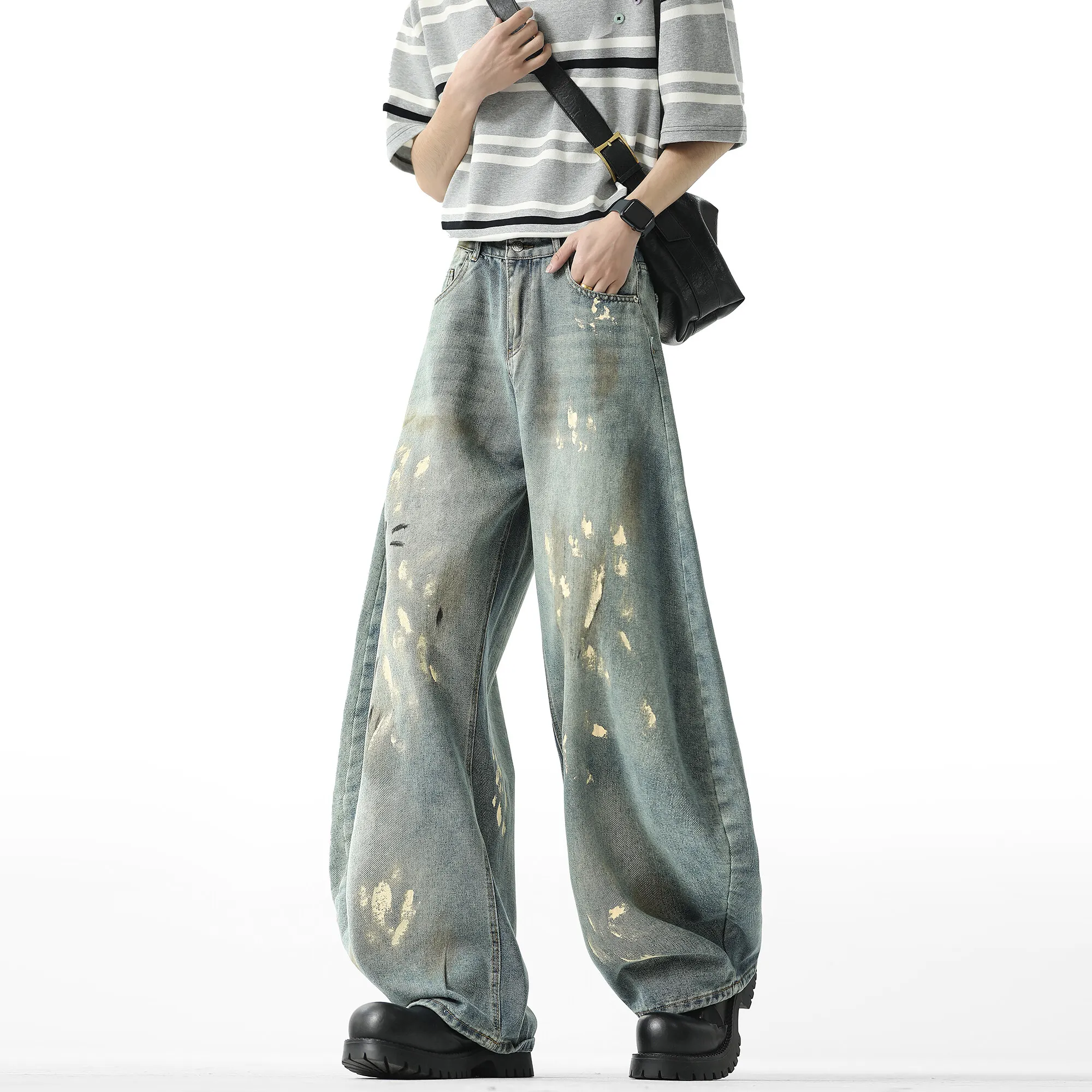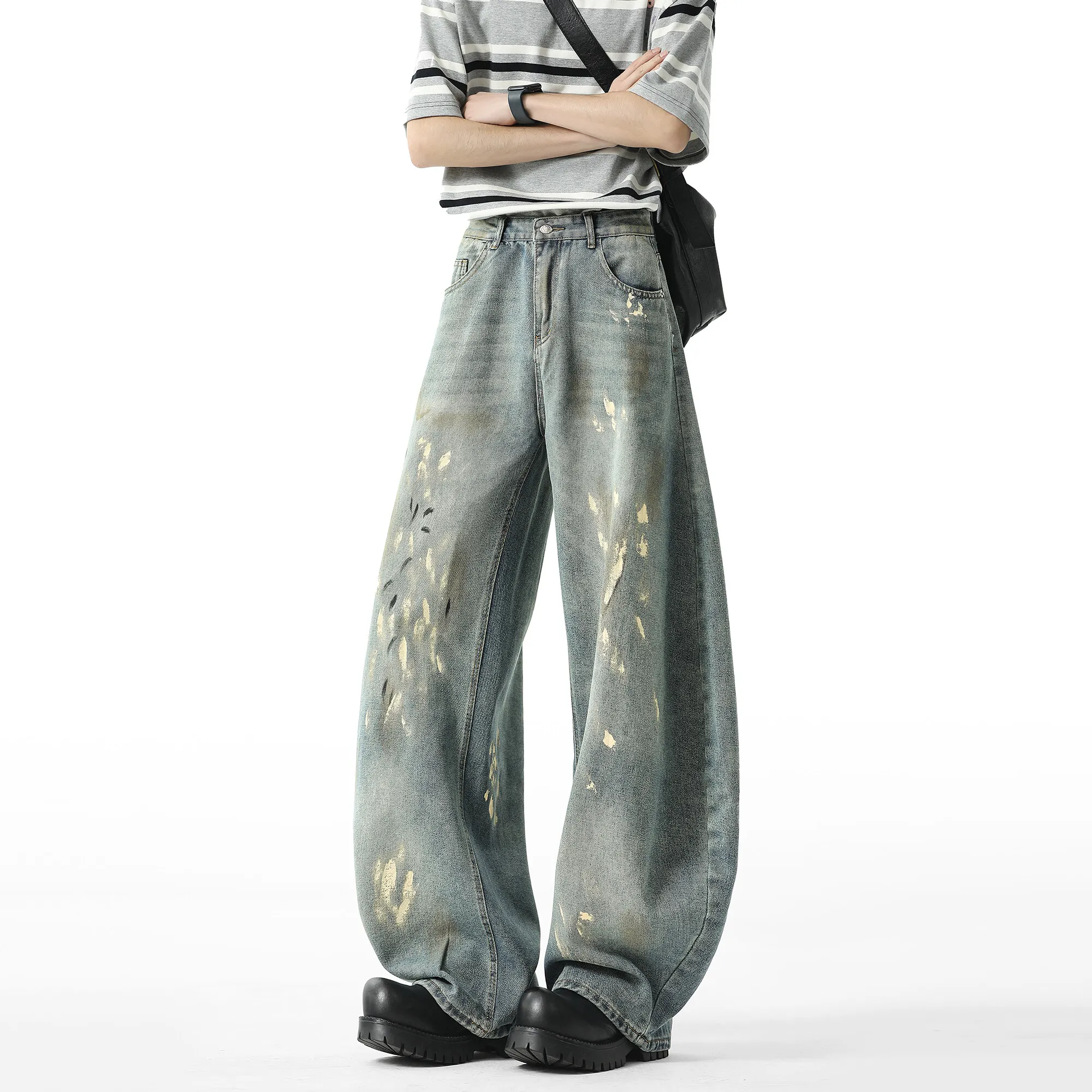 Men Blue Washed Denim Jeans Loose Fit Wide Leg Baggy Streetwear Casual Trousers Hip Hop Graffiti Design Fashion Stretch Comfort