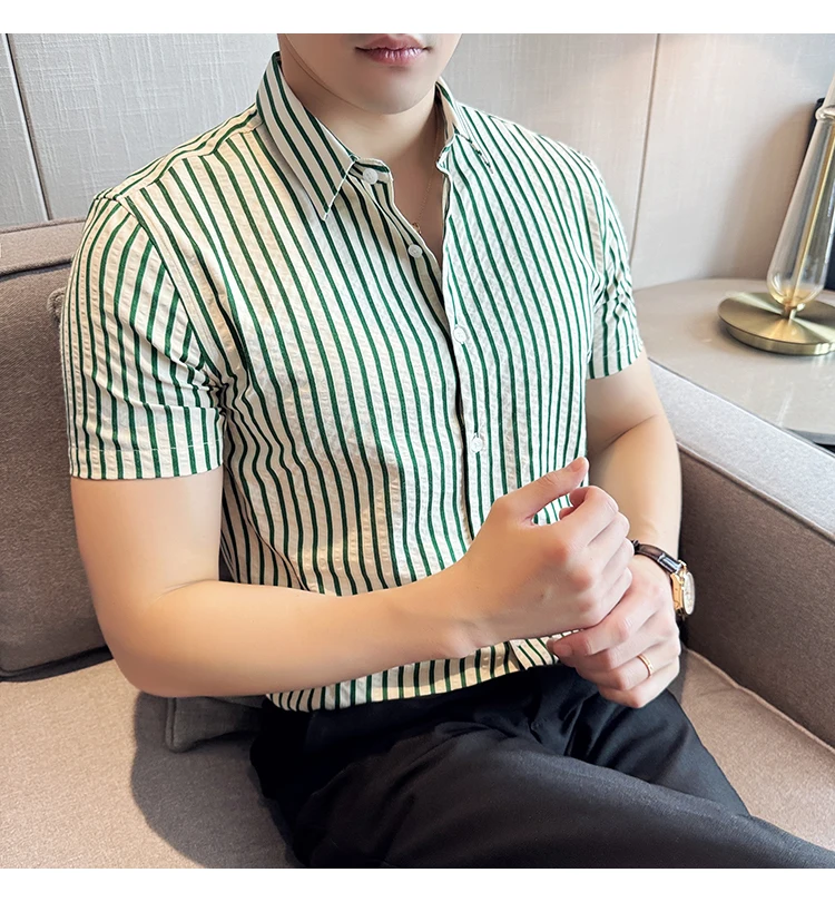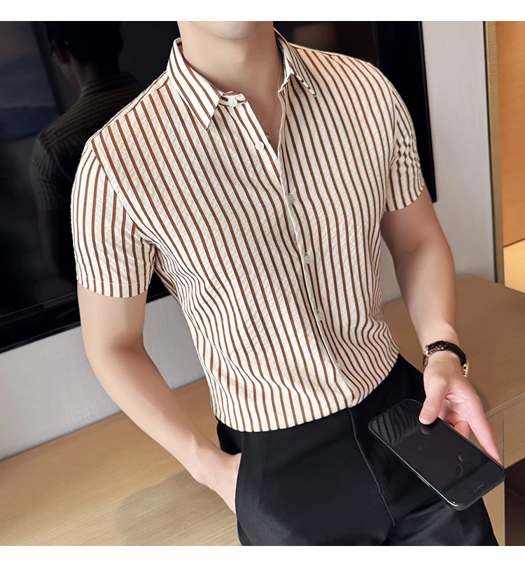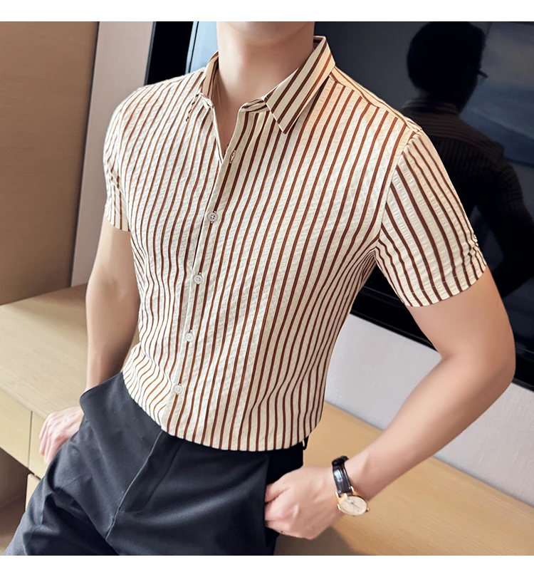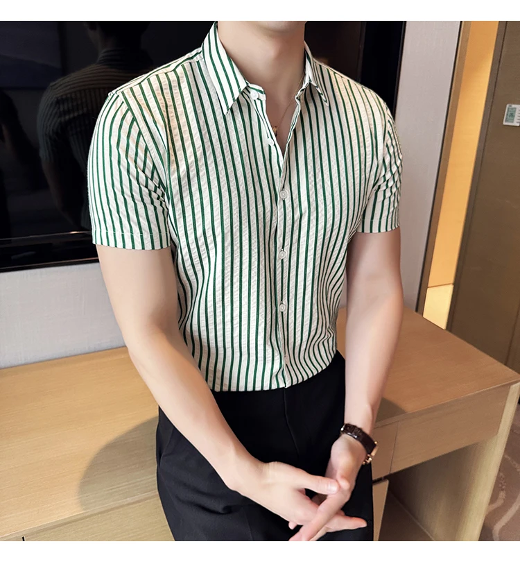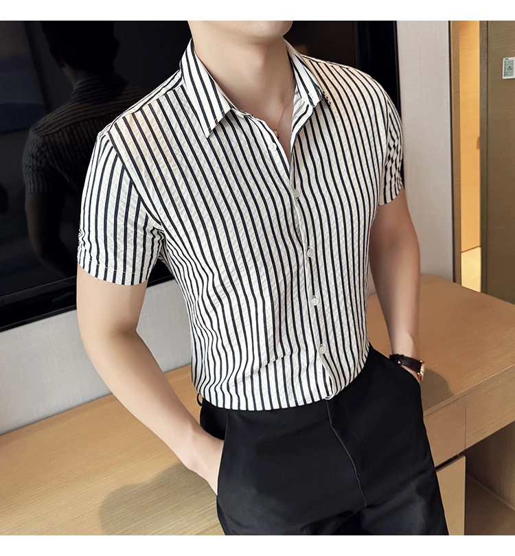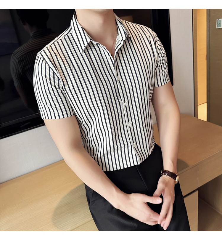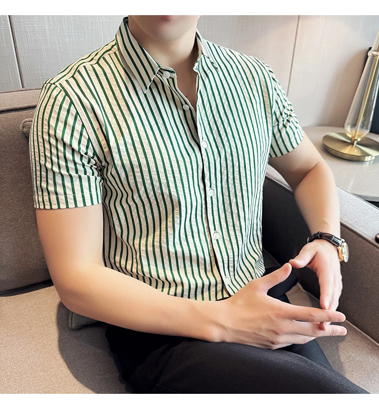 Men Striped Shirt Summer Light and Thin Breathable Sweat Absorbing Short Sleeved Slim Fit Casual Pleated Shirt Men clothing