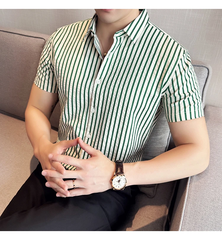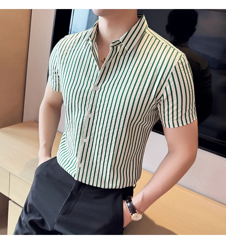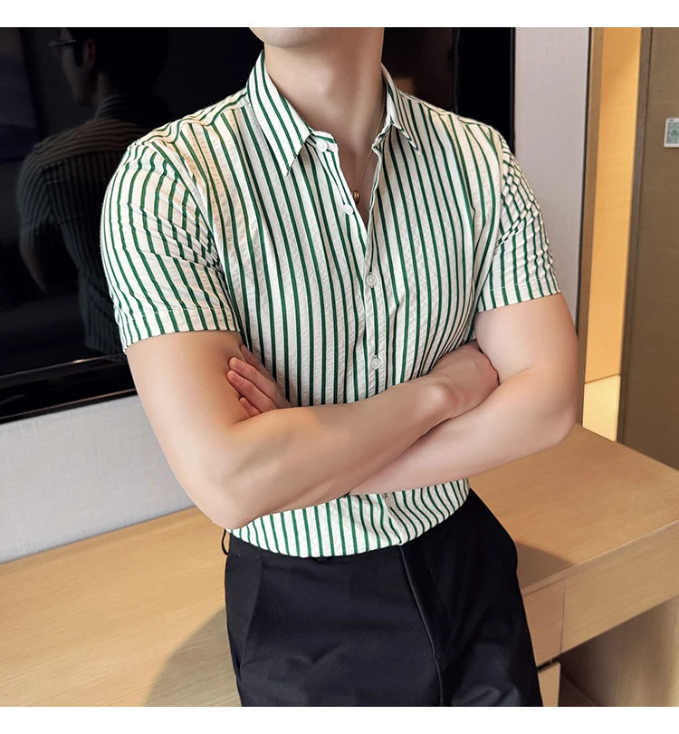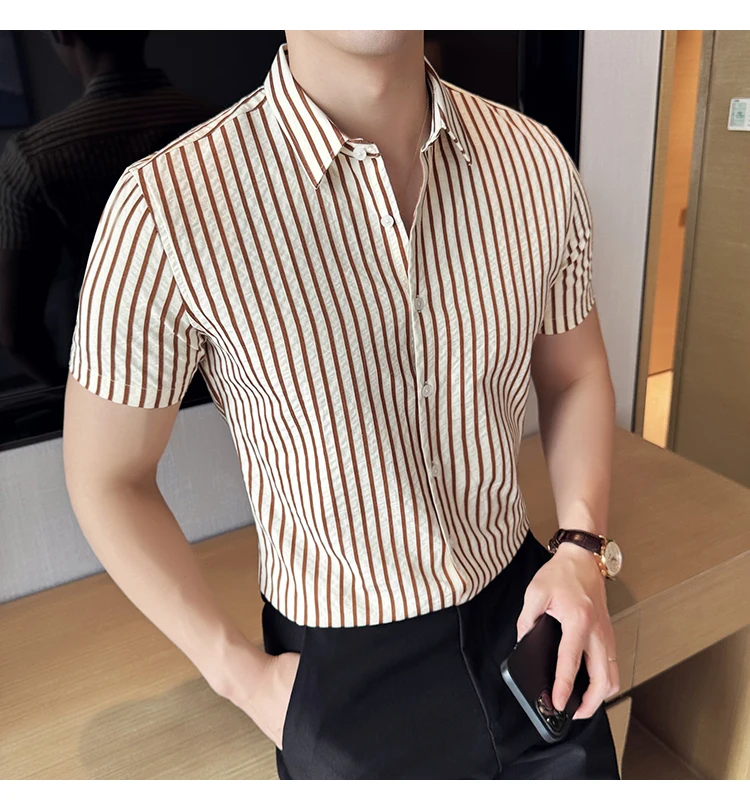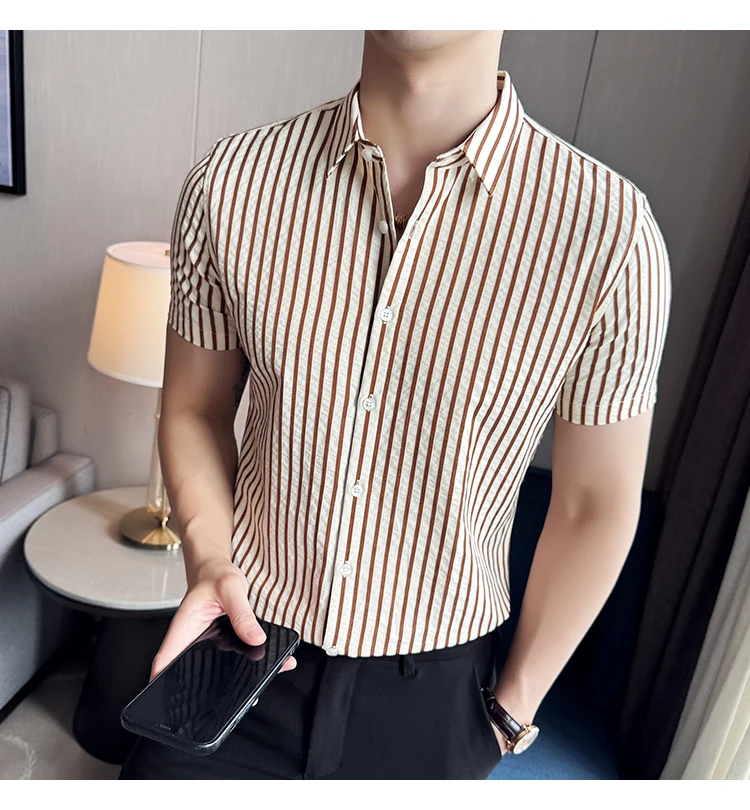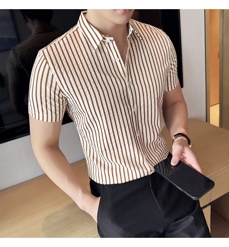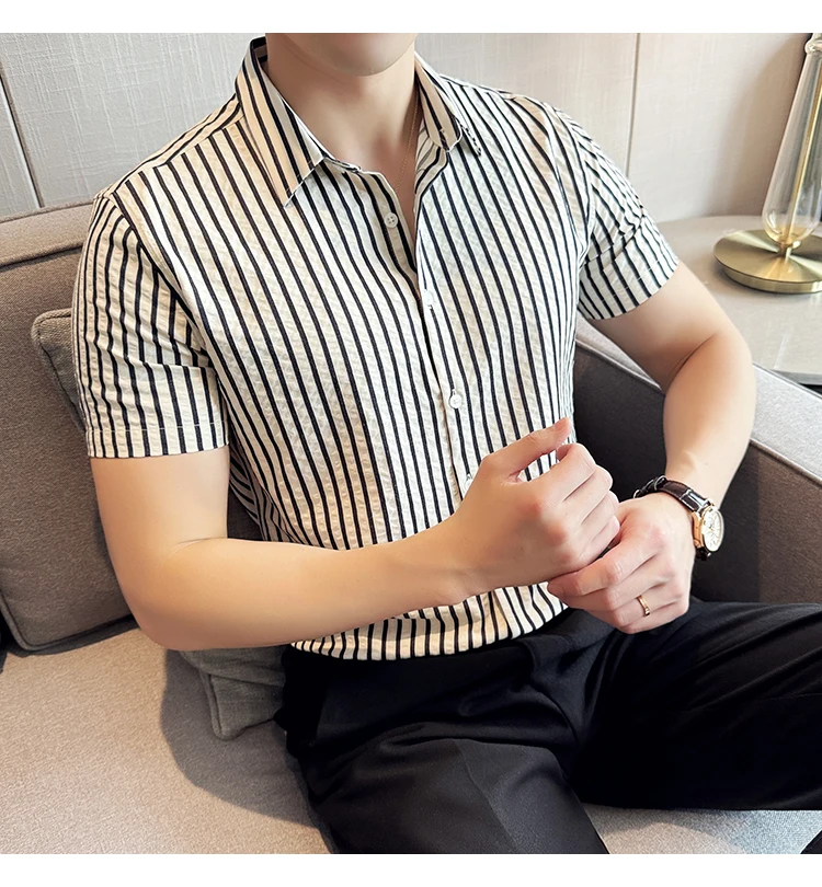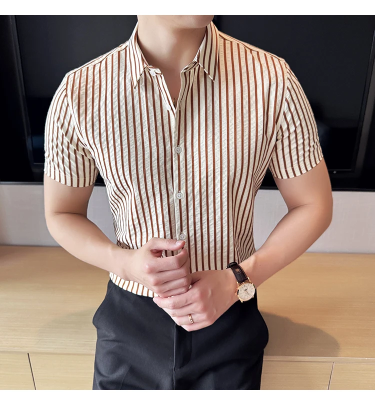 Men Striped Shirt Summer Light and Thin Breathable Sweat Absorbing Short Sleeved Slim Fit Casual Pleated Shirt Men clothing