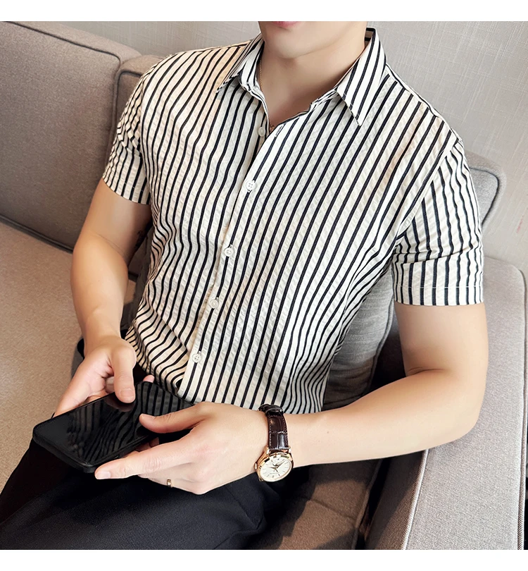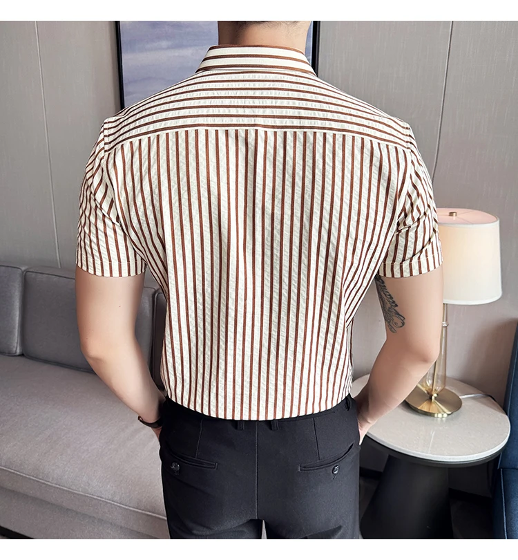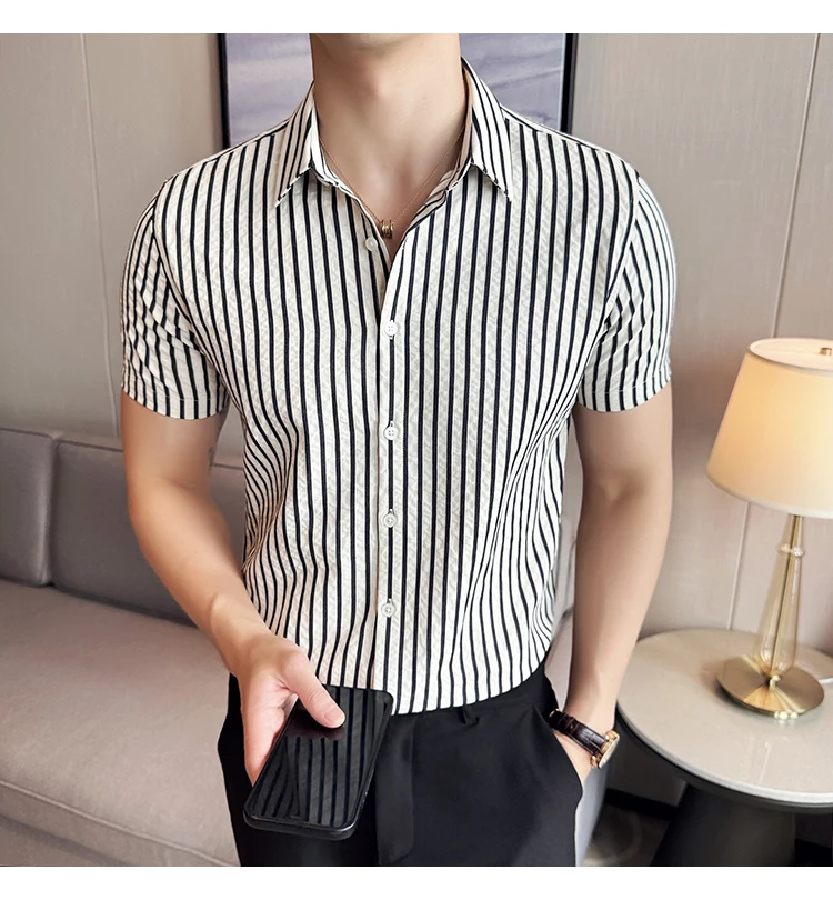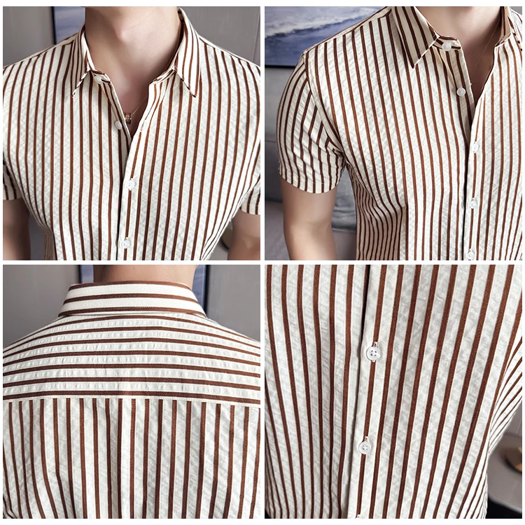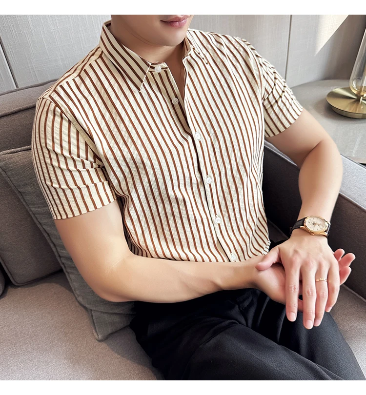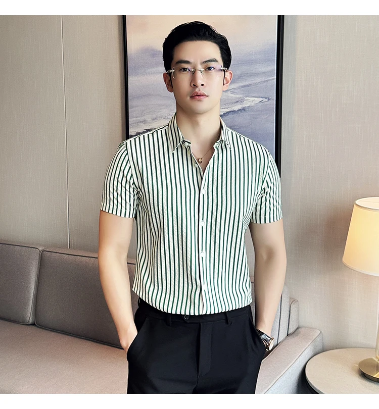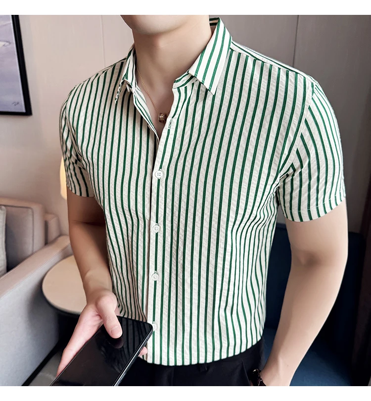 Men Striped Shirt Summer Light and Thin Breathable Sweat Absorbing Short Sleeved Slim Fit Casual Pleated Shirt Men clothing