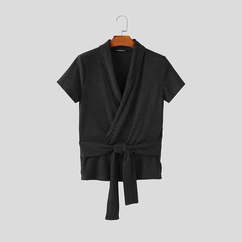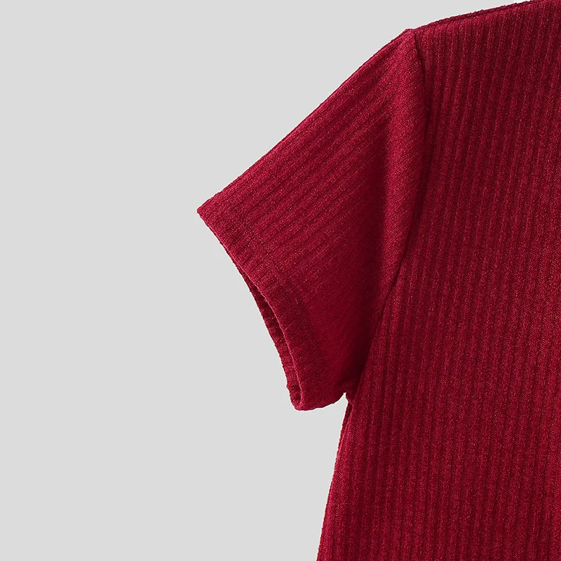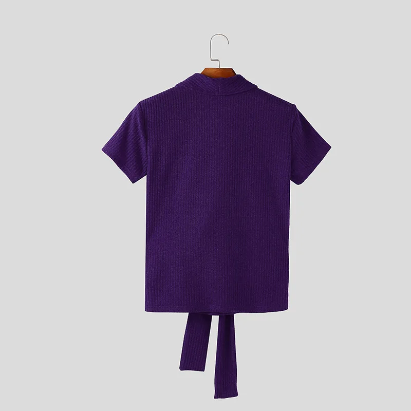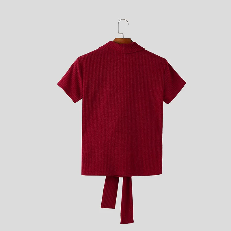 Men T Shirt Knitted Solid Color V Neck Short Sleeve Summer Male Tee Tops Streetwear 2025 Lace Up Fashion Men Clothing INCERUN